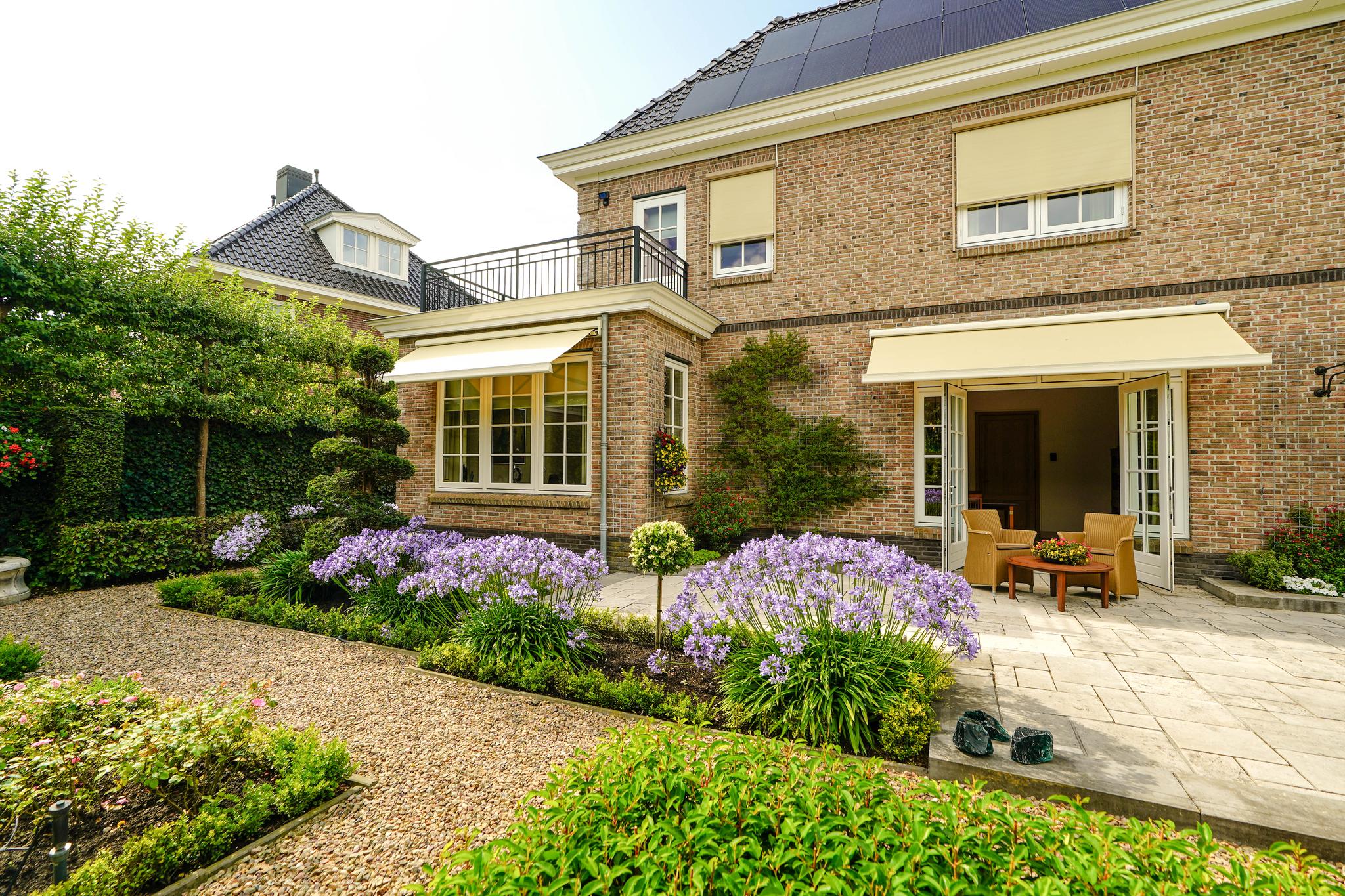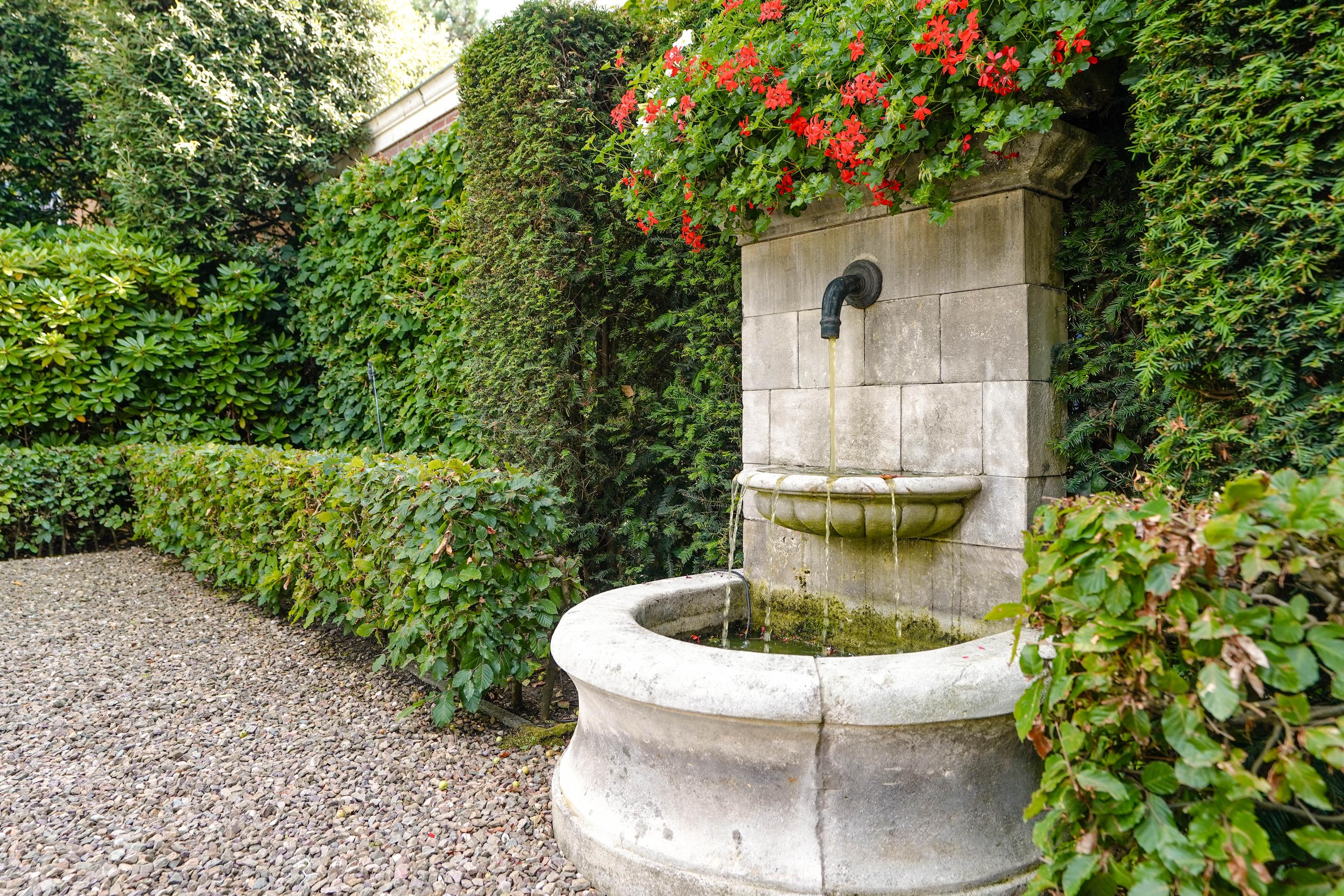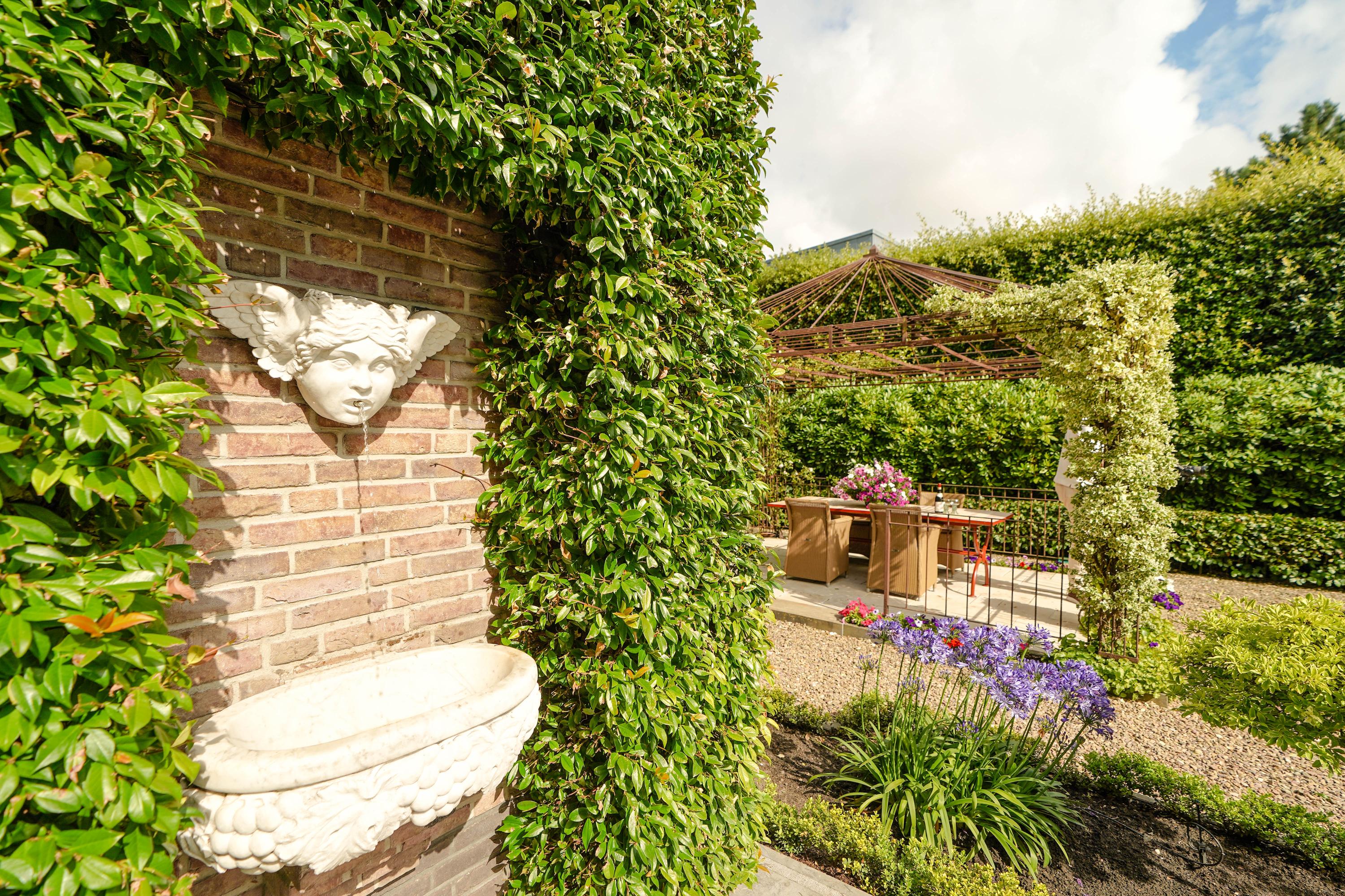 De zeer waardevolle siertuin voegt een bijzondere beleving toe aan het wonen in deze villa. De voortuin, geometrisch aangelegd in klassieke stijl, is een representatieve binnenkomer. De brede zijtuinen langs het huis zijn royaal beplant, met hagen, struiken en bomen. In de achtertuin zorgt een 3,5 meter hoge kraag van 24 wintergroene steeneiken langs de erfafscheiding het hele jaar door voor maximale privacy. Op het terras van 46 m2 is het heerlijk zonnen én feesten. Als het ijzeren prieel 's zomers versierd is met bloemborders, klimrozen en hanging baskets, is het er aangenaam toeven aan de buitentafel. De Franse fontein aan de rechterzijde en het Italiaanse fonteintje aan het terras zijn verfrissende elementen in de zomerse tuin. De bronzen sculpturen zijn apart te koop.