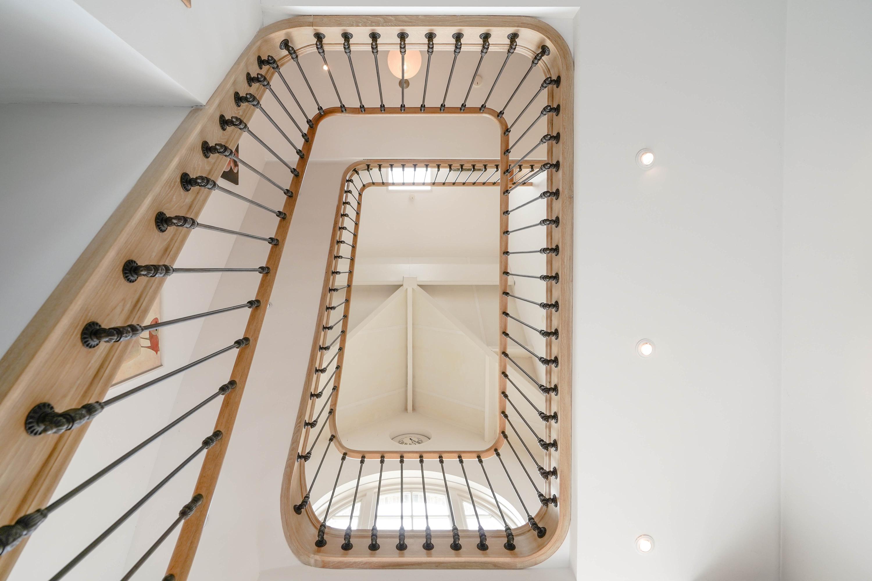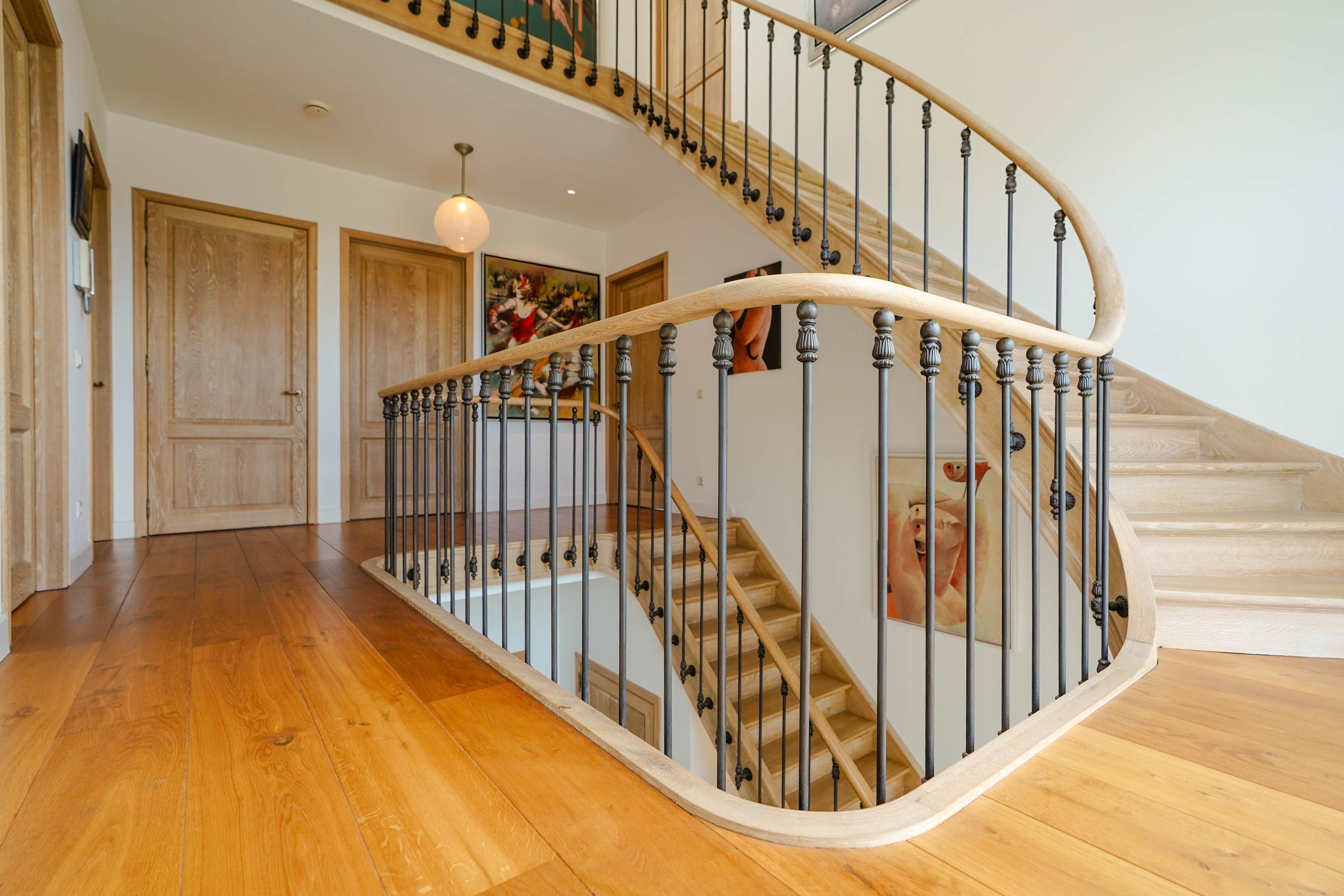 De entreehal maakt direct indruk met een fraai gesculptureerde, eiken trappartij. Vanaf de begane grond loopt een massief eiken leuning in één ononderbroken stuk door tot en met de bovenste etage, gedragen door 87 gepatineerde, gietijzeren zijbalusters. Een meesterwerk van de befaamde Belgische trappenmaker Luc Steels. Hij vervaardigde ook de eiken paneeldeuren en sponningen in het hele huis. In de hal bevinden zich het toilet en de meterkast. Het lichtvenster in het dak boven in de vide zorgt samen met de grote glaspui voor optimaal daglicht op alle etages.