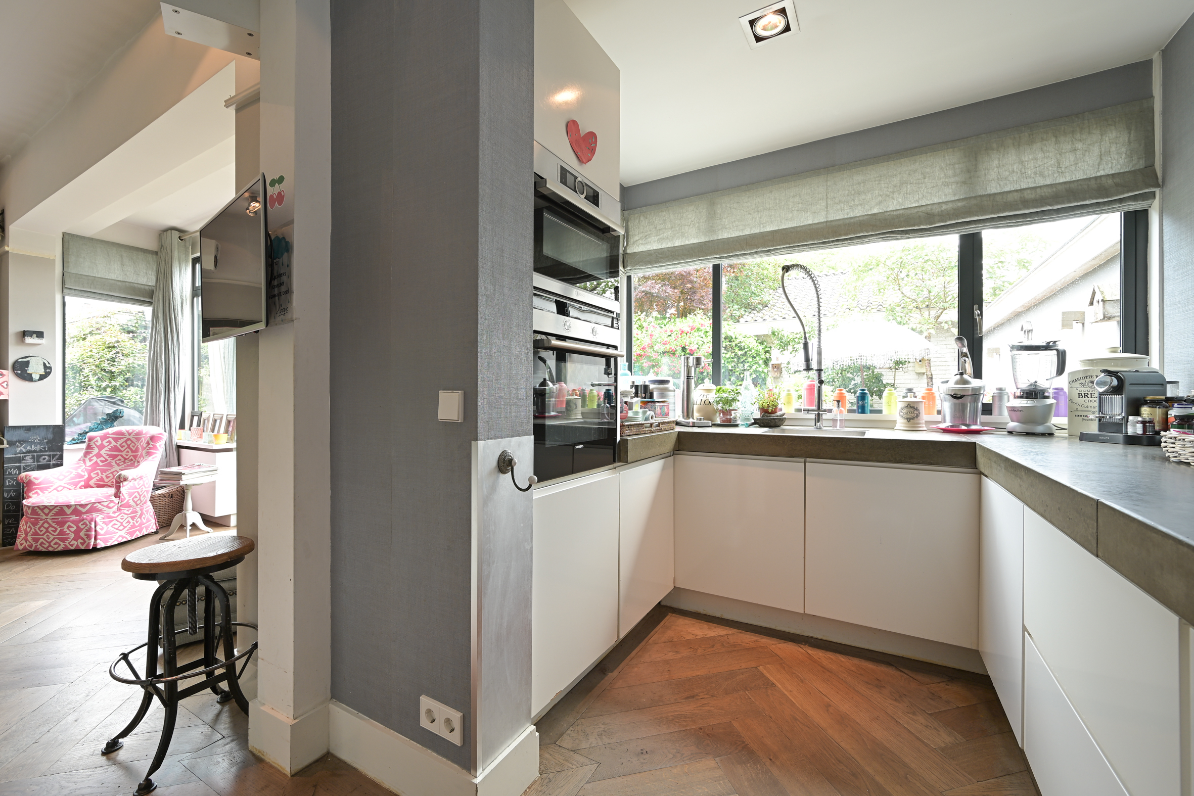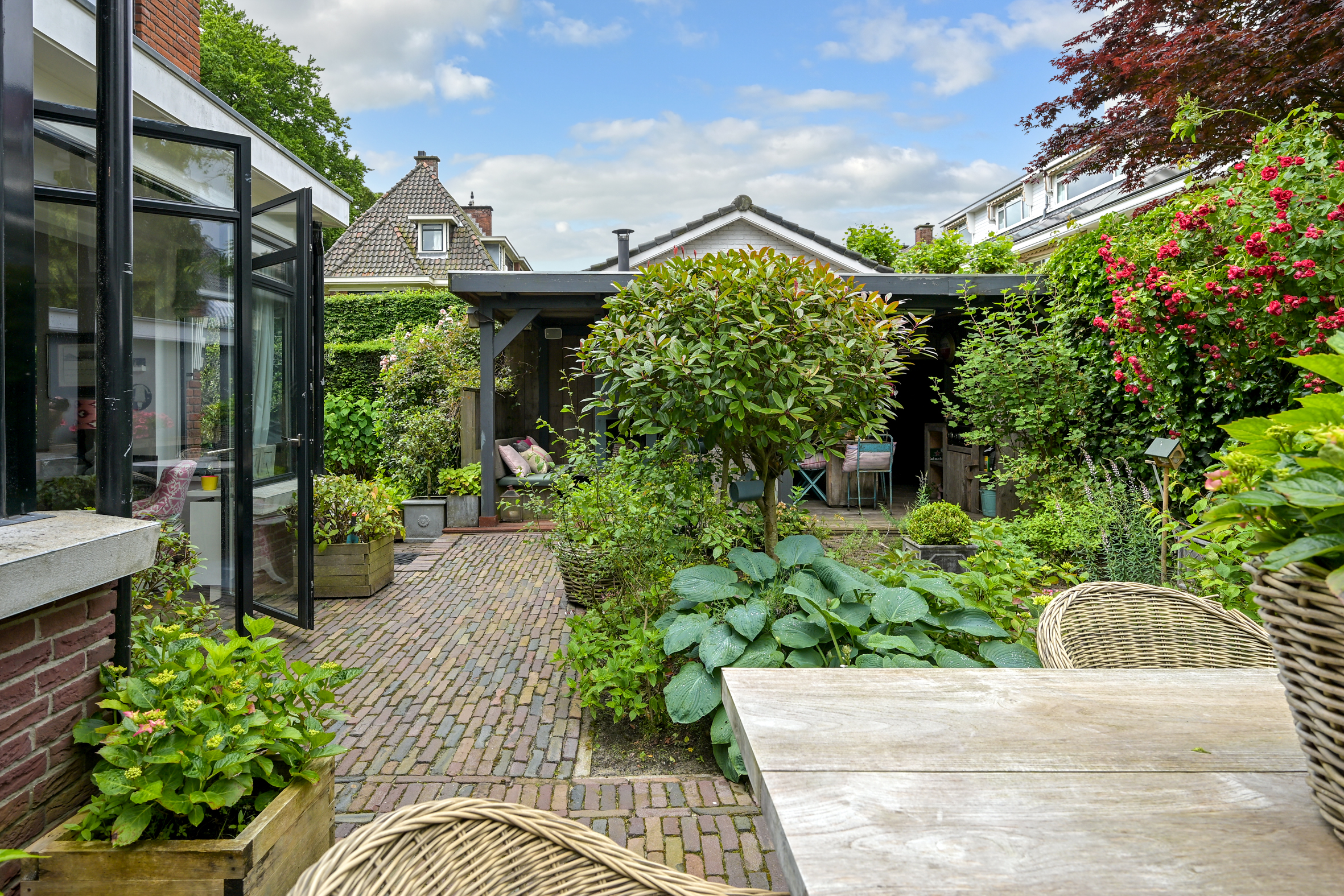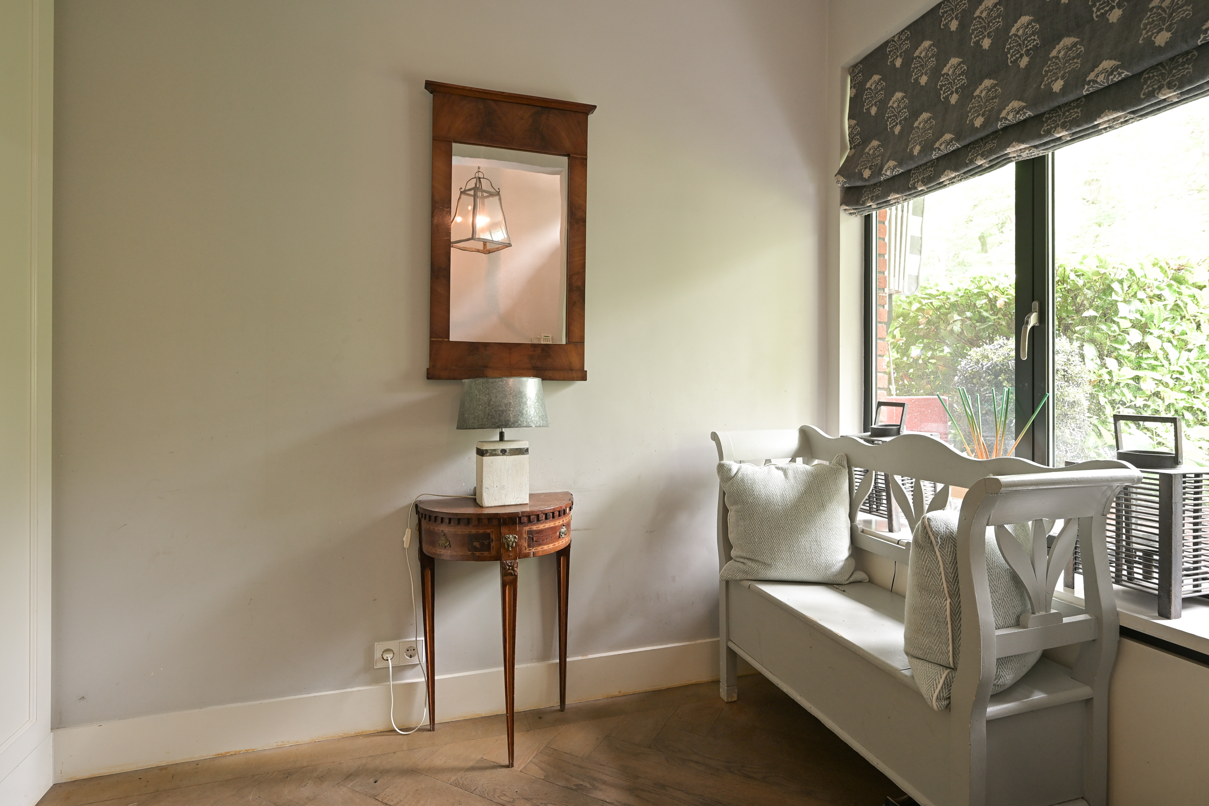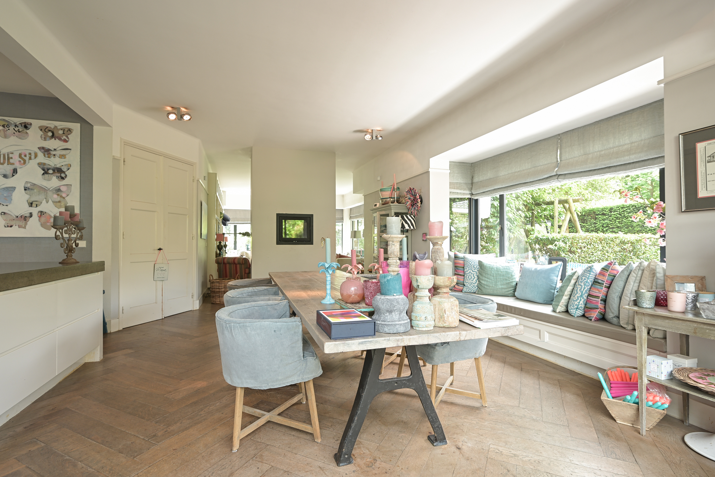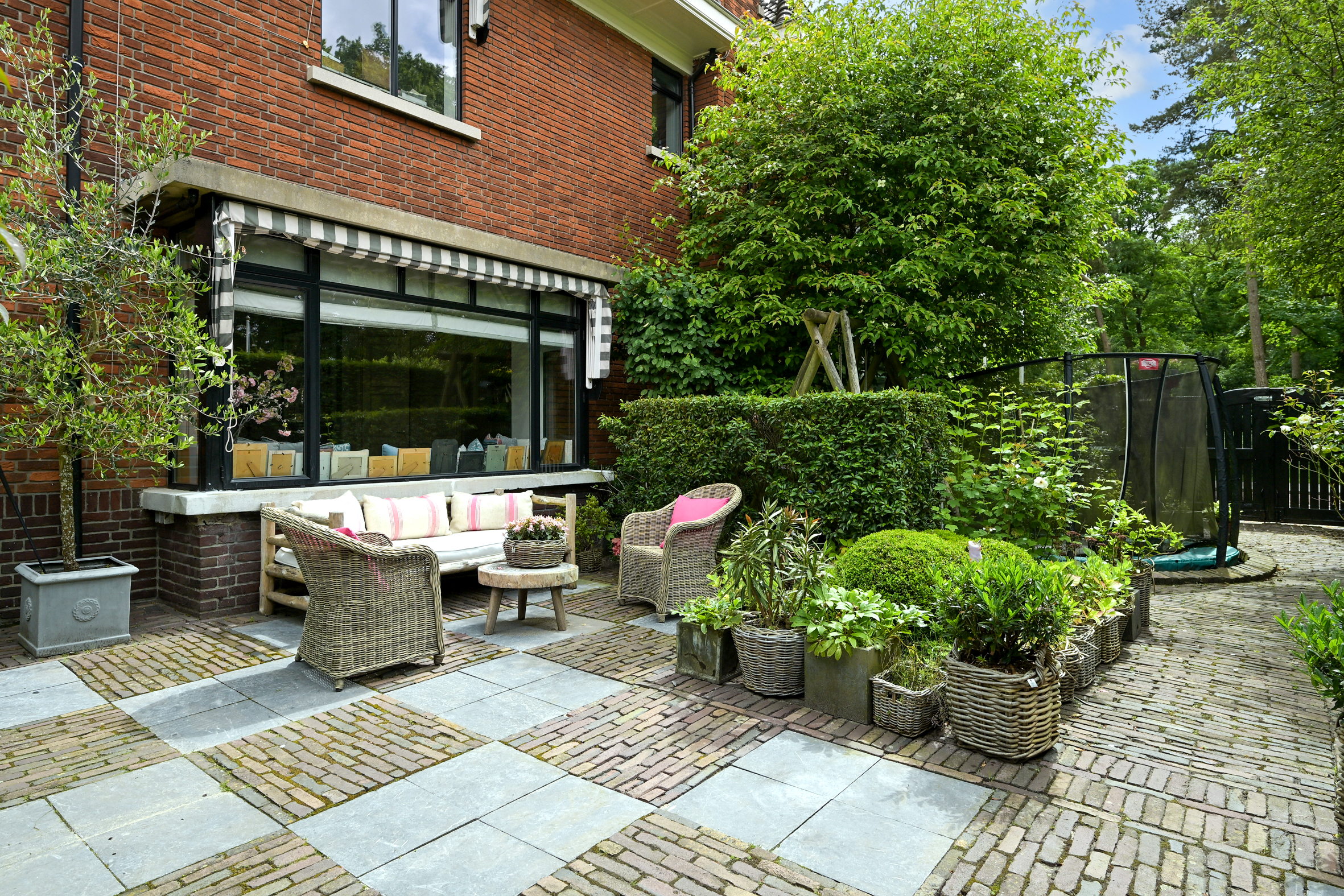 Entrance hall, vestibule with coat closet, central hall with a beautiful staircase, toilet, storage room, and access to the dry basement (36 m²) divided into three rooms. A wide living room at the front features a wall of cabinets and a fireplace, while at the rear is a spacious dining room with a fireplace and French doors leading to the sunny, private backyard with its charming "Gooische Hut" theme and fireplace. A large open-plan kitchen with an island and modern built-in appliances is also featured. Detached brick garage with electricity and a separate chill-out area for children.