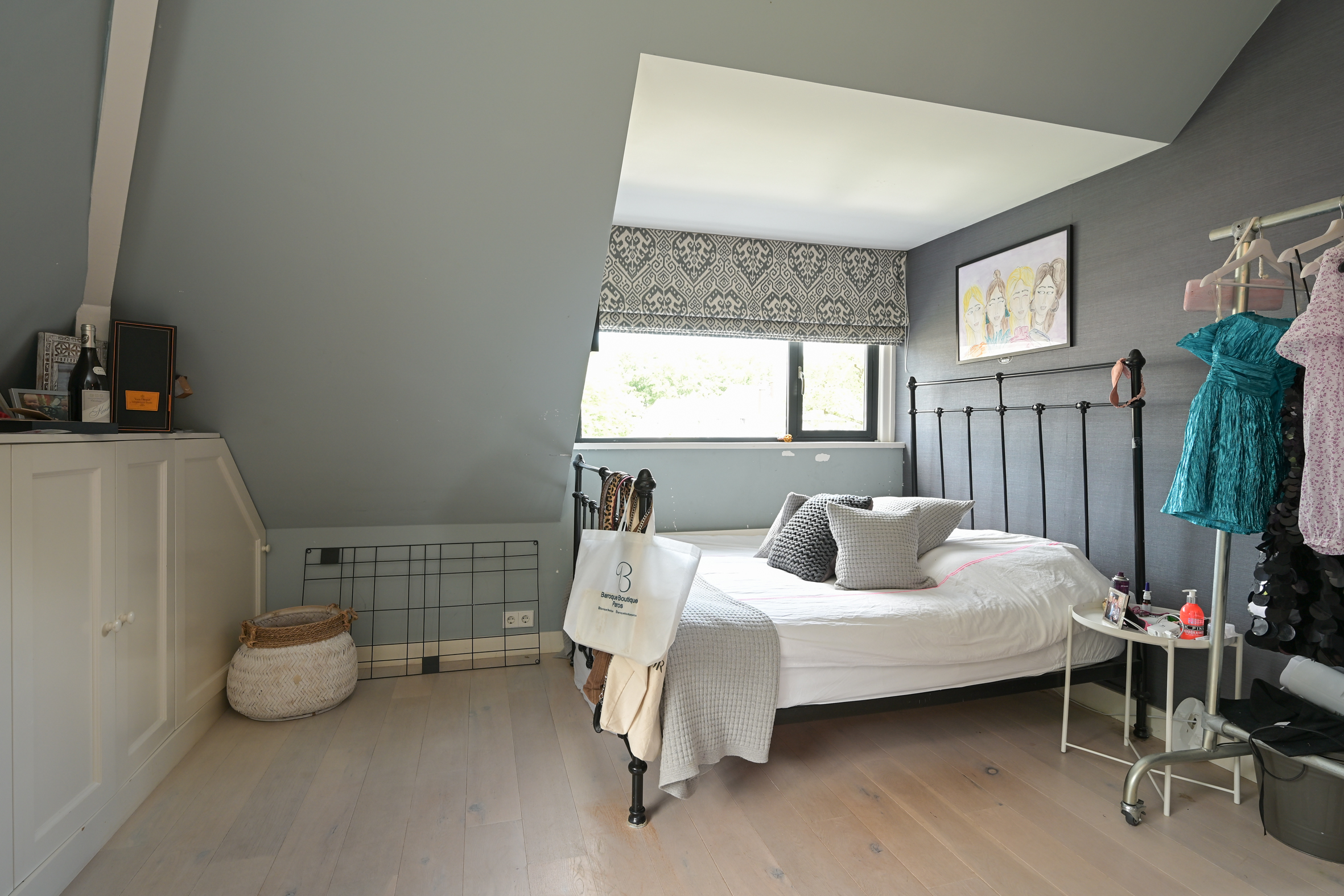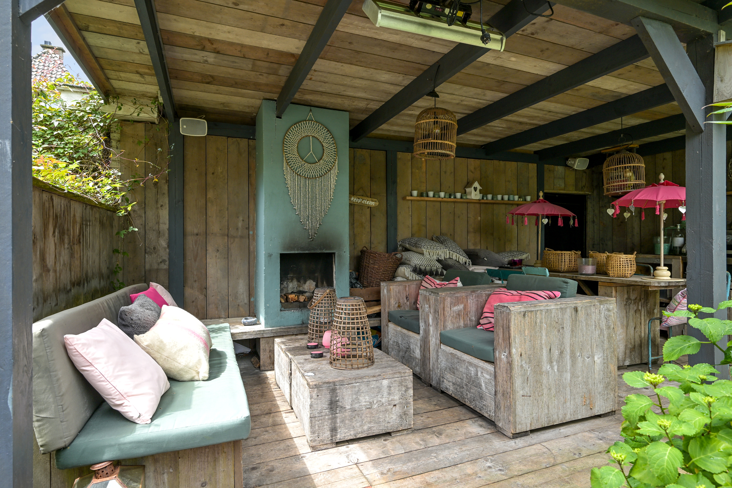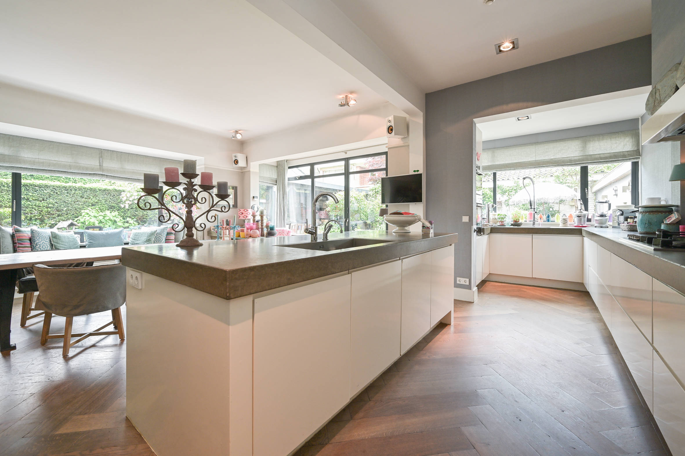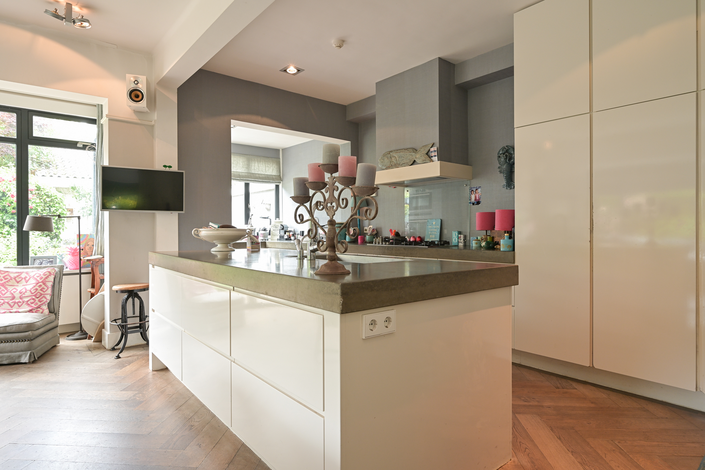 Entrance hall, vestibule with coat closet, central hall with a beautiful staircase, toilet, storage room, and access to the dry basement (36 m²) divided into three rooms. A wide living room at the front features a wall of cabinets and a fireplace, while at the rear is a spacious dining room with a fireplace and French doors leading to the sunny, private backyard with its charming "Gooische Hut" theme and fireplace. A large open-plan kitchen with an island and modern built-in appliances is also featured. Detached brick garage with electricity and a separate chill-out area for children.