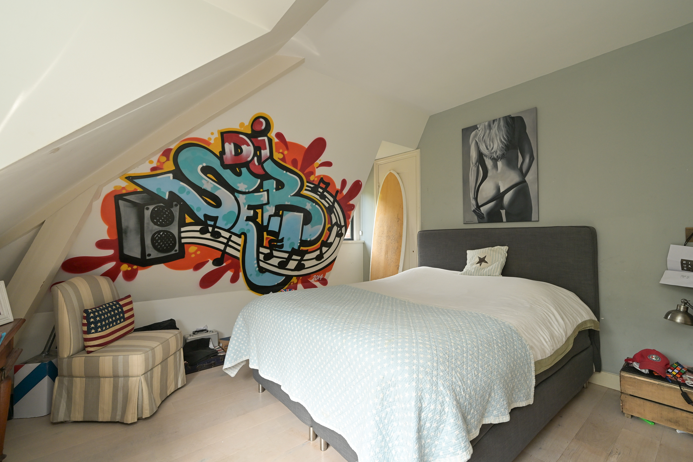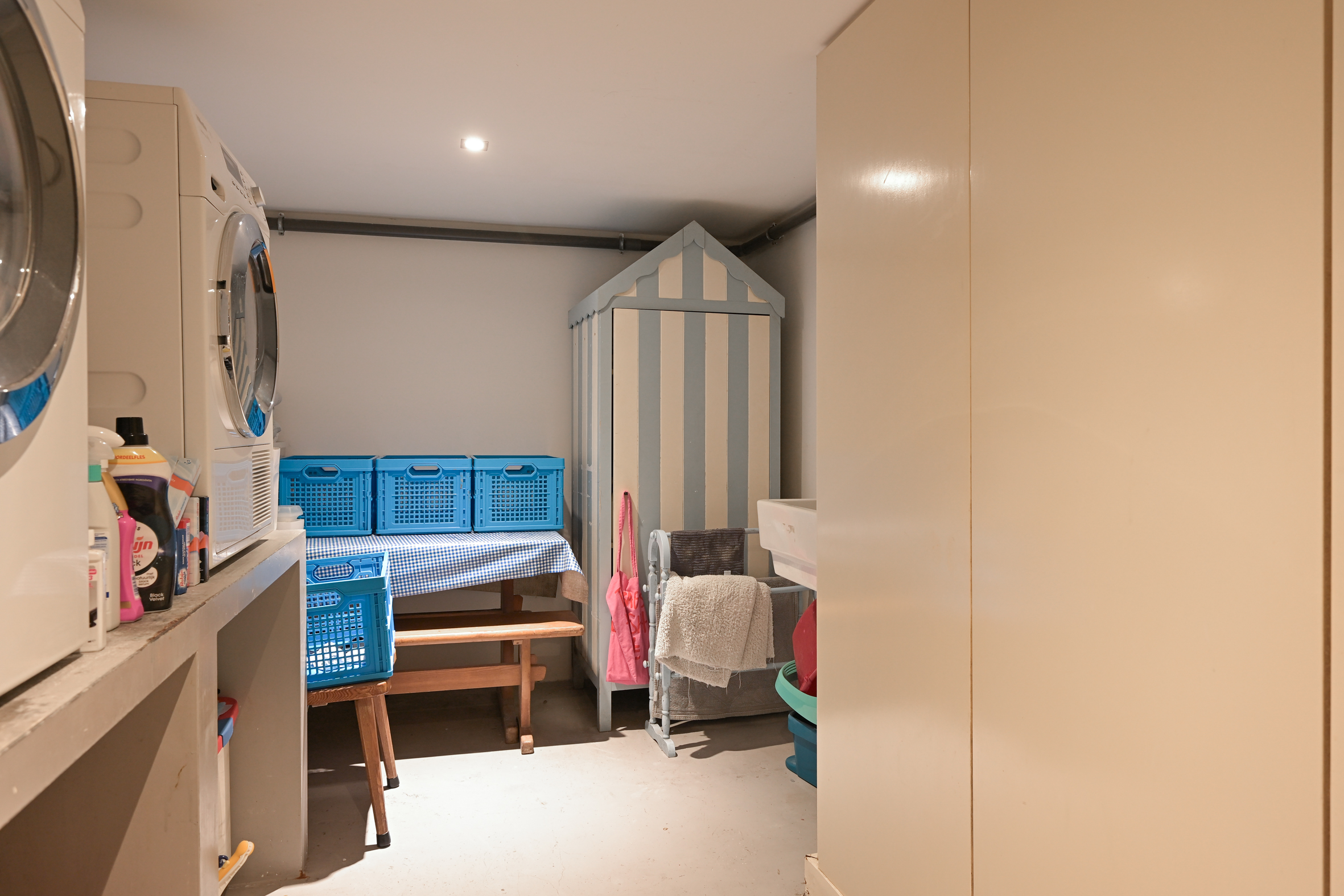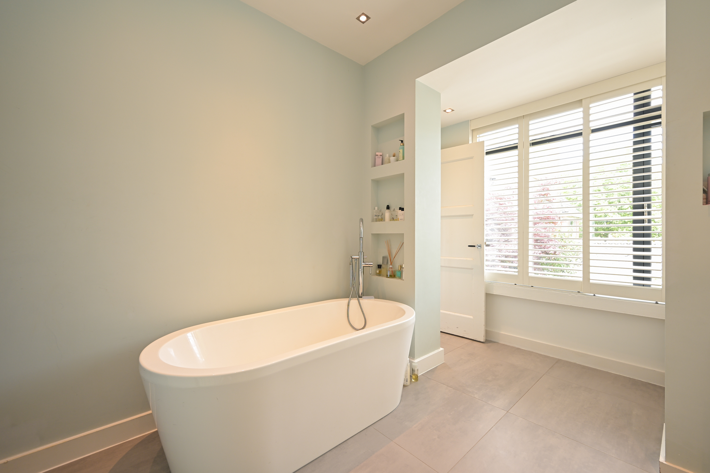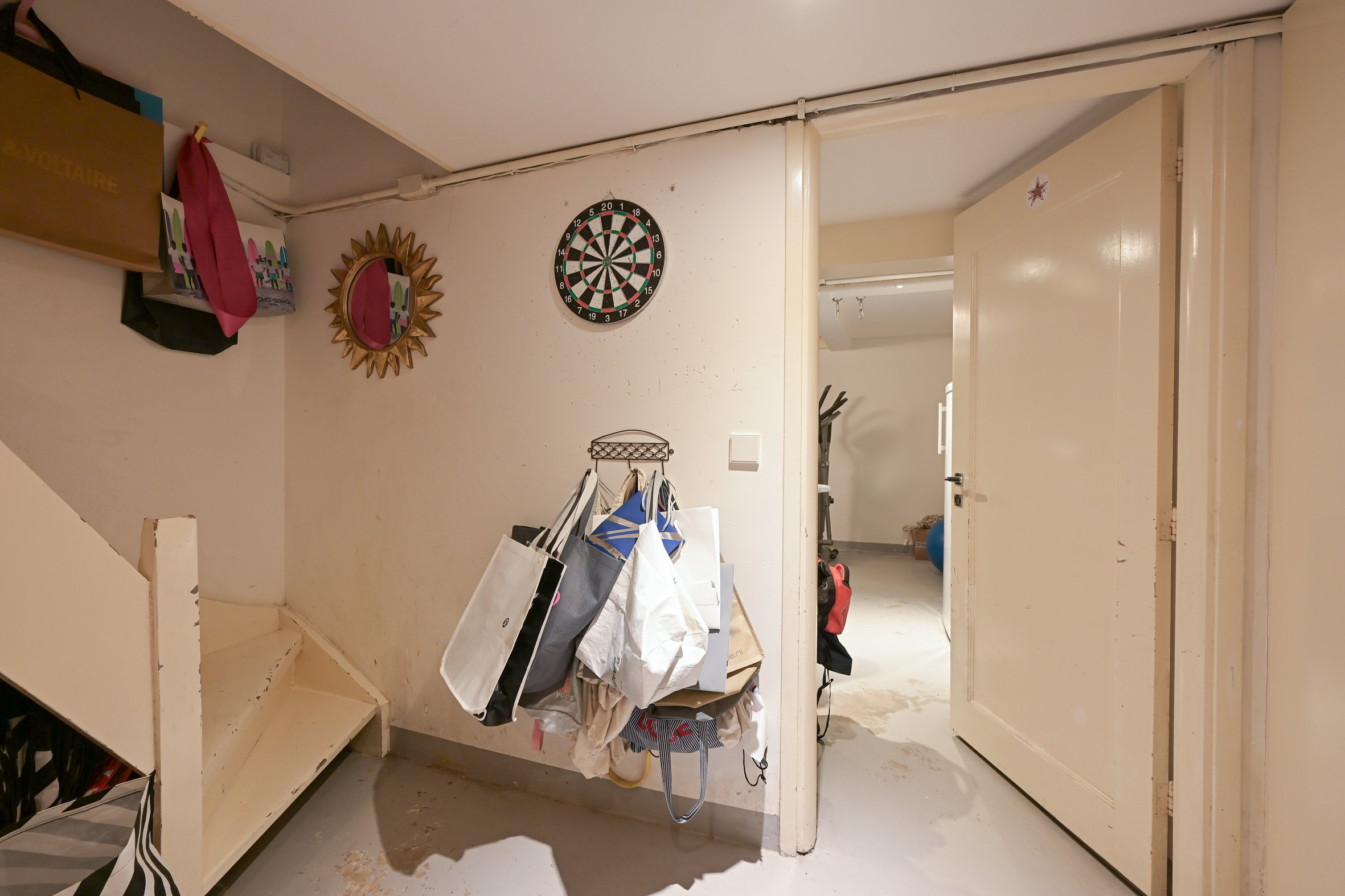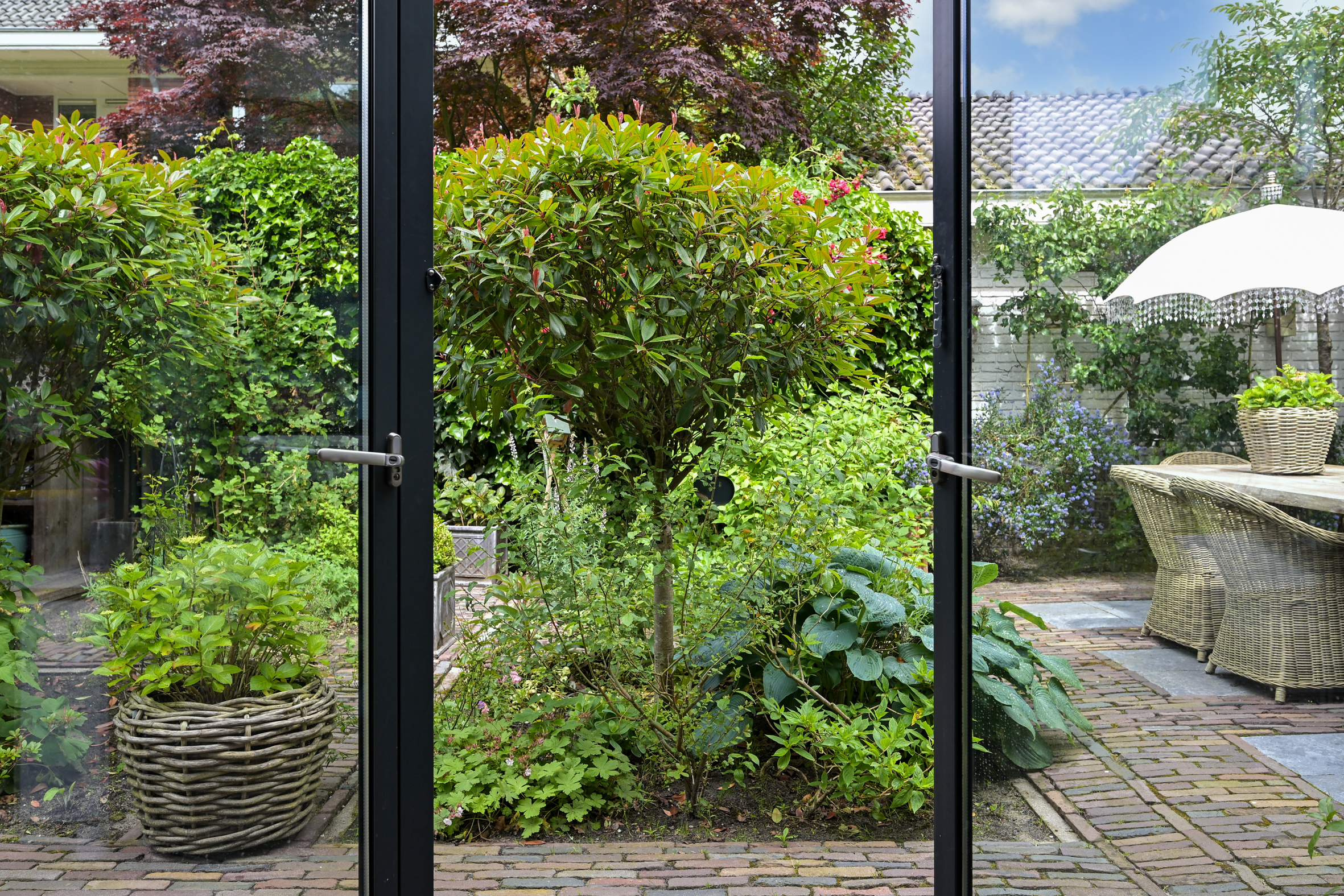 Entrance hall, vestibule with coat closet, central hall with a beautiful staircase, toilet, storage room, and access to the dry basement (36 m²) divided into three rooms. A wide living room at the front features a wall of cabinets and a fireplace, while at the rear is a spacious dining room with a fireplace and French doors leading to the sunny, private backyard with its charming "Gooische Hut" theme and fireplace. A large open-plan kitchen with an island and modern built-in appliances is also featured. Detached brick garage with electricity and a separate chill-out area for children.
