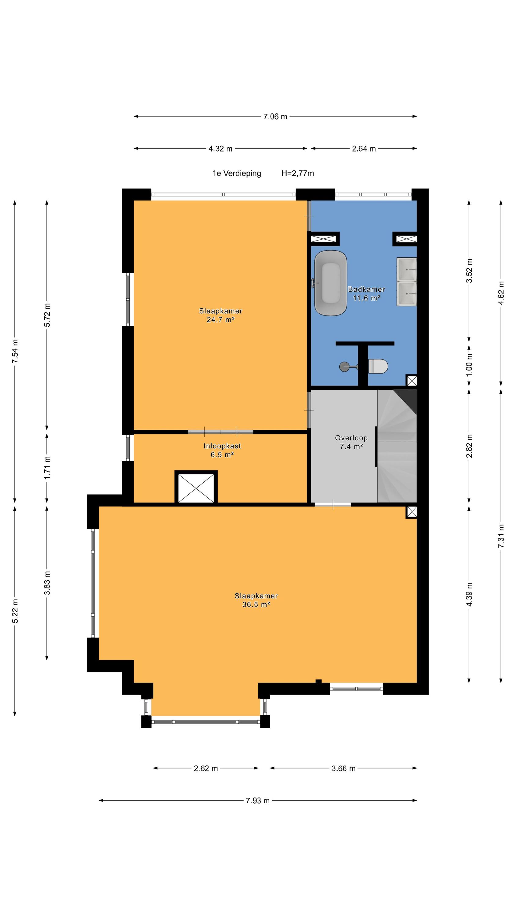 Landing, spacious, bright family room/study at the front, large master bedroom with a large walk-in closet, bathroom with a walk-in shower, bathtub, and toilet.