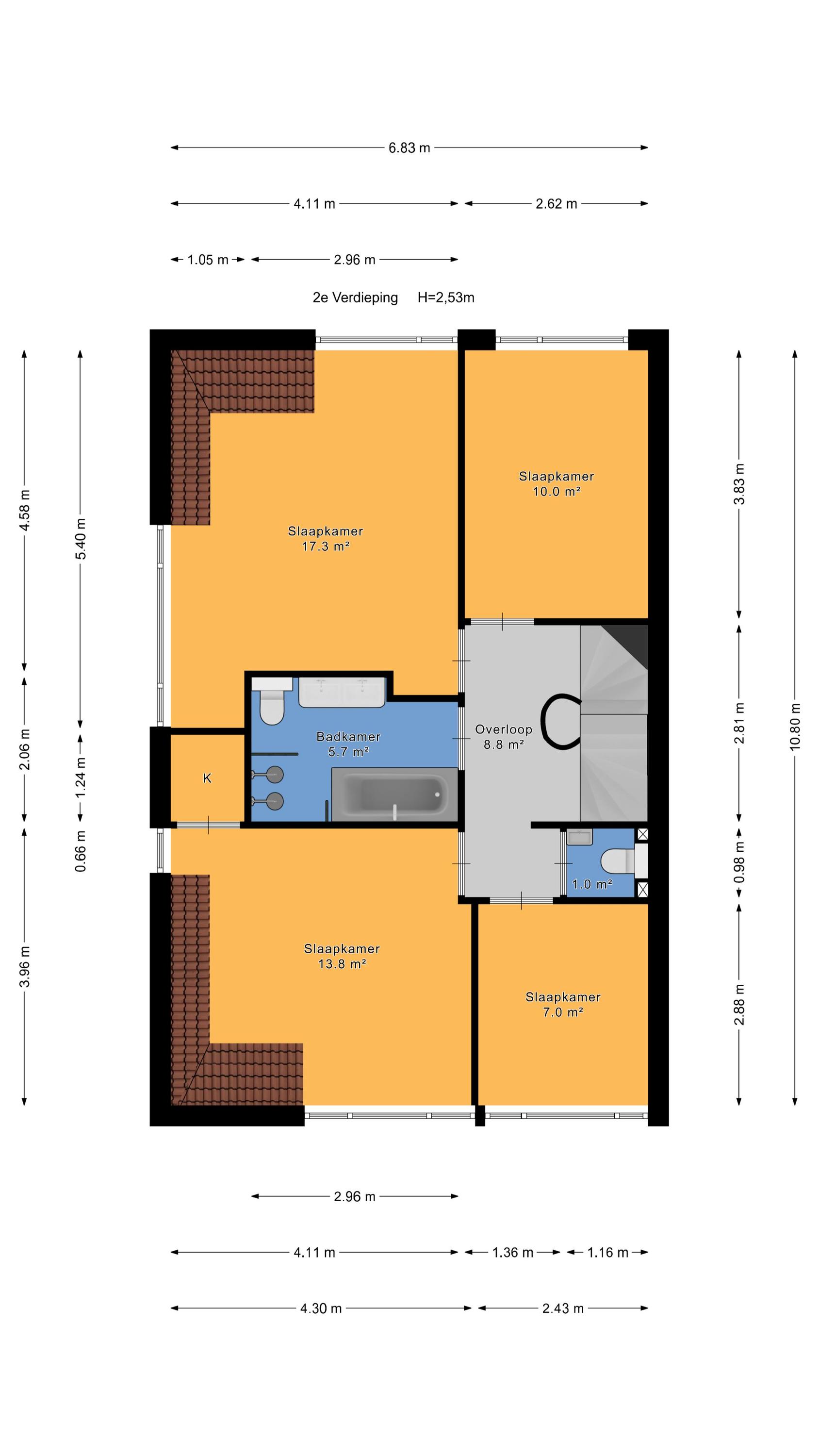 Landing, two large bedrooms and two smaller bedrooms, bathroom with a walk-in shower, bathtub, and toilet, and a separate toilet with a hand basin.