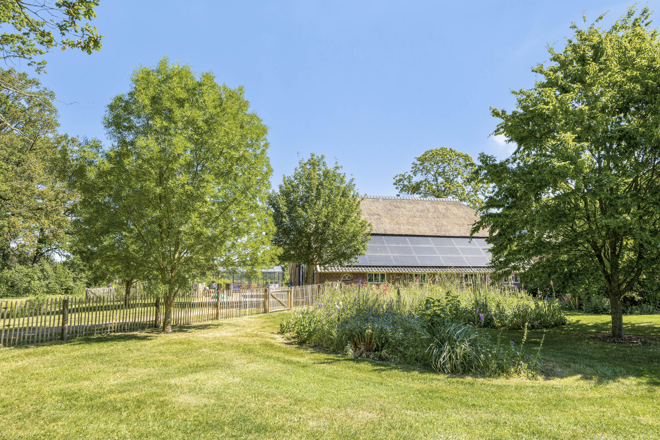 Die wandelbare Scheune eignet sich als privates Atelier, Studio oder Gästebereich und bewahrt dabei die Originalbalken und wiedergewonnenes Baumaterial. Direkt an der Küche lädt eine Sonnenterrasse mit Blick auf Obstgärten und kunstvoll gestaltete Rabatten zum Verweilen ein, während ein eigenes Gewächshaus sowie ein Gemüsegarten Selbstversorgung ermöglichen. Für Fahrzeuge steht eine klassische Heuscheune zur Verfügung und geräumige private Stellplätze bieten Diskretion und Komfort.