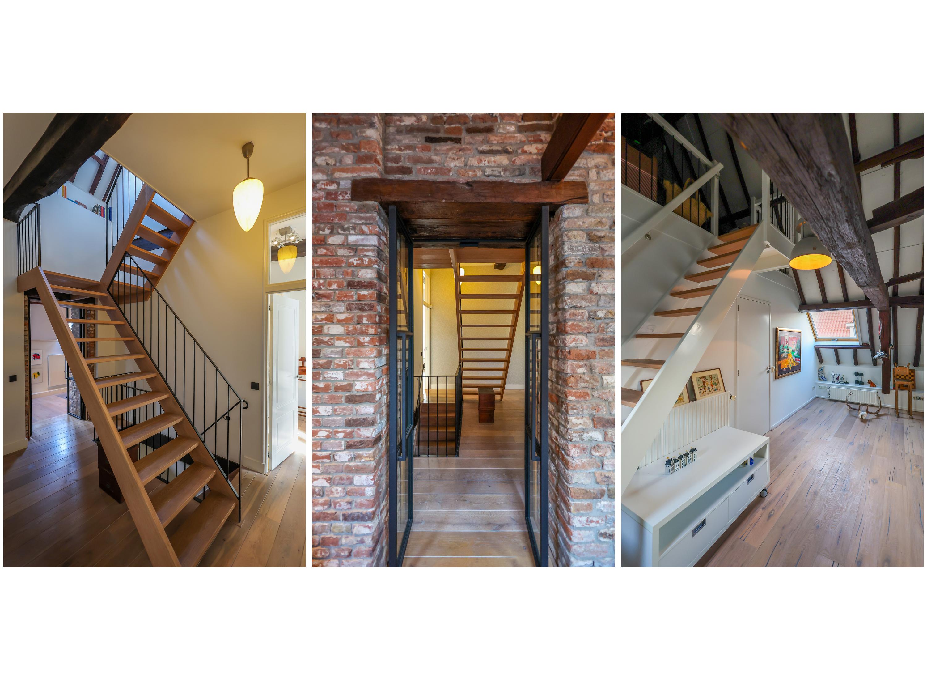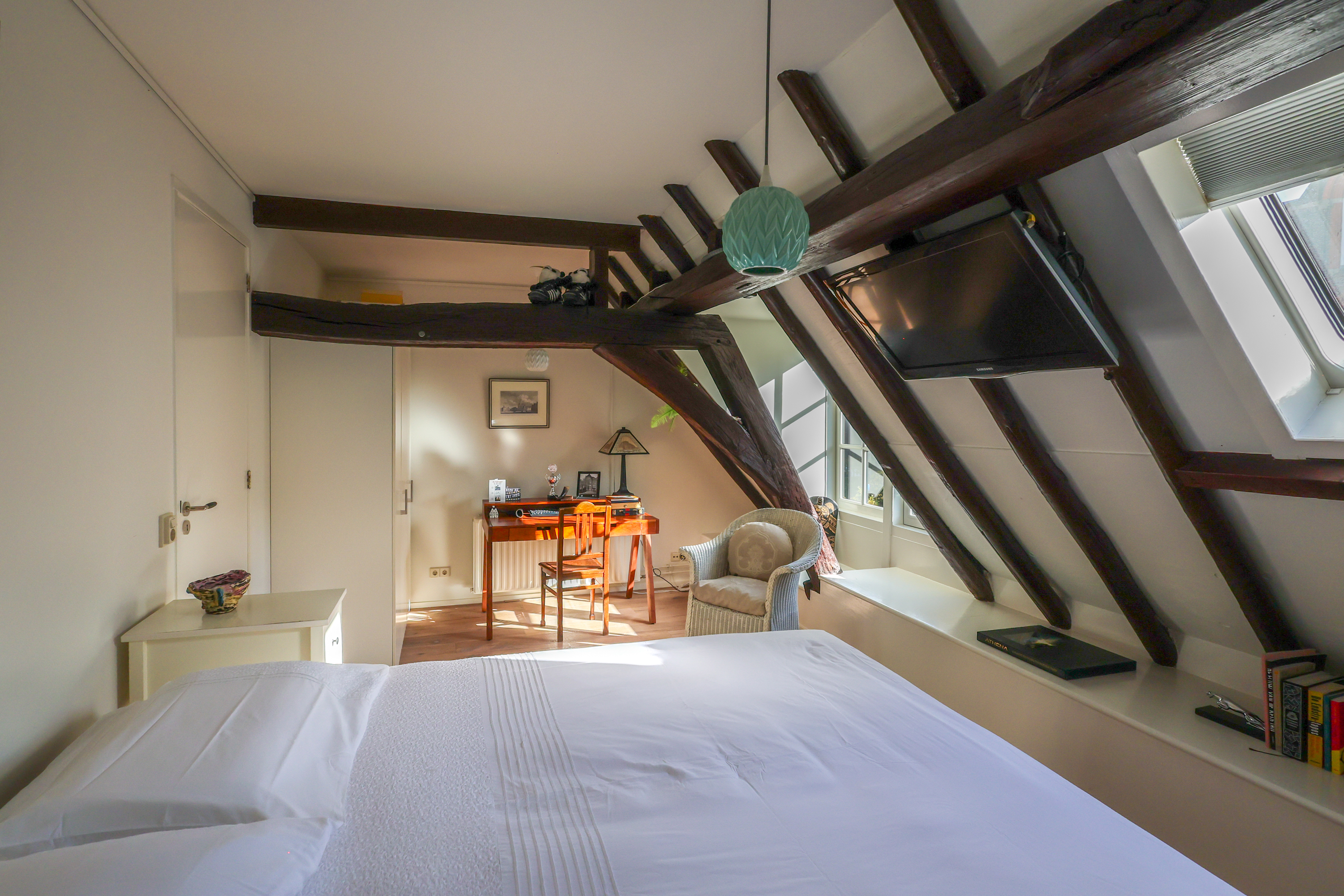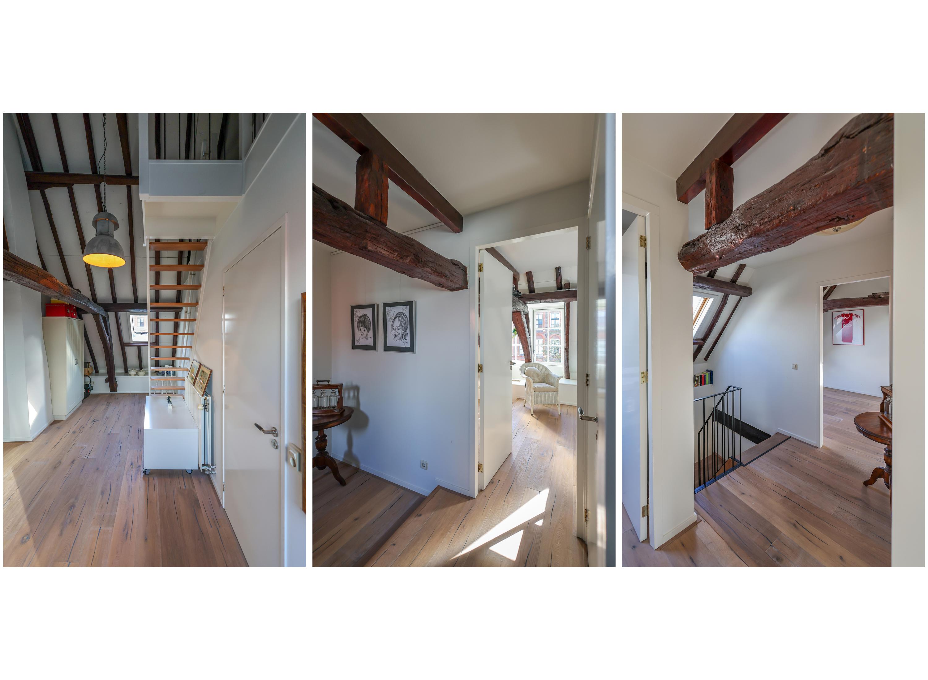 Das Hauptschlafzimmer verfügt über eine begehbare Ankleide mit maßgefertigten Einbauschränken und ein großzügiges Badezimmer. Im Obergeschoss beeindruckt ein Arbeits- oder Spielbereich mit offenen Abschnitten der alten Stadtmauer unter großzügigen Dachfenstern und verstärkt so die Verbindung zur reichen Geschichte Amersfoorts. Drei weitere Schlafzimmer und ein zweites Badezimmer bieten flexible Nutzungsmöglichkeiten.