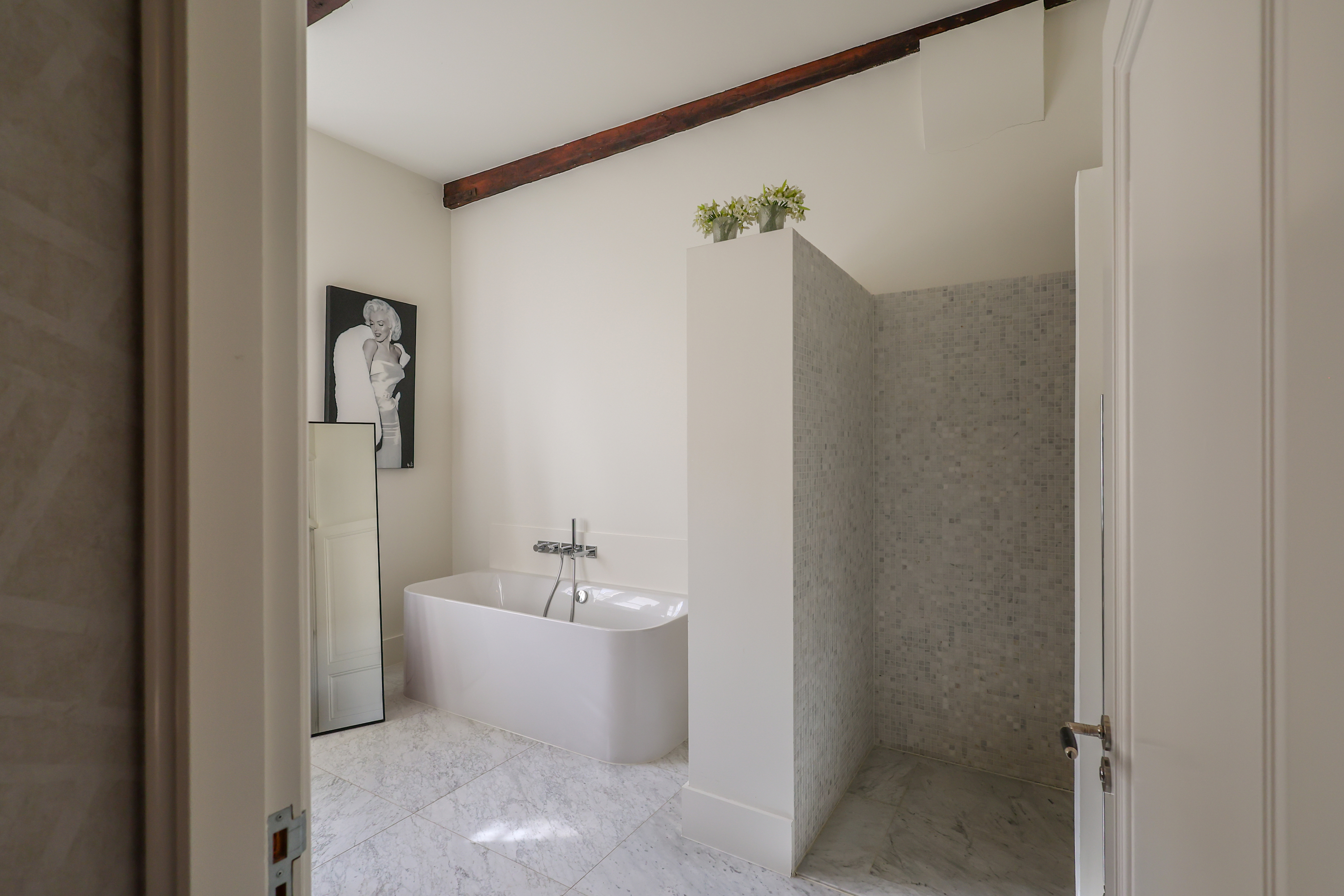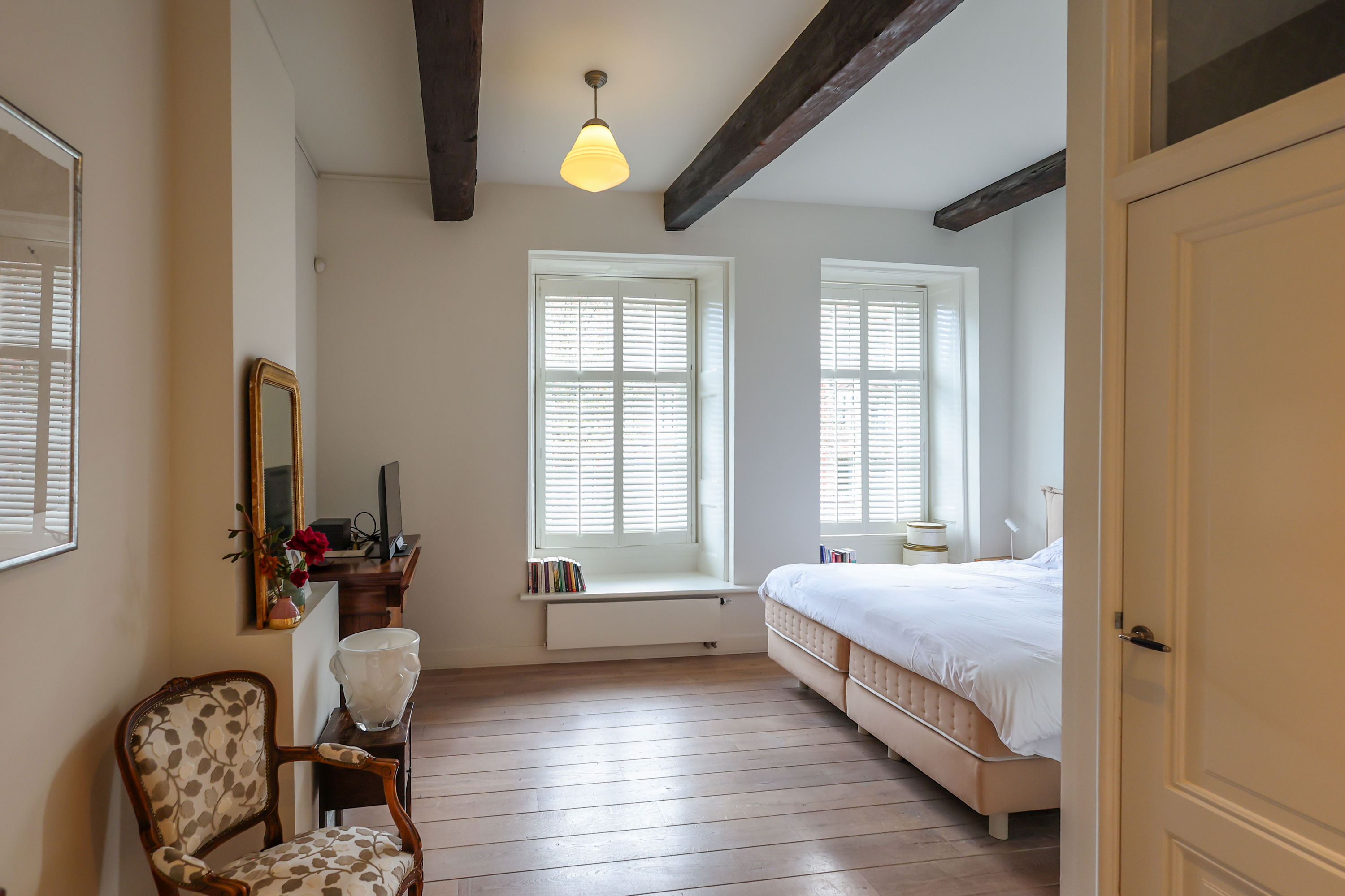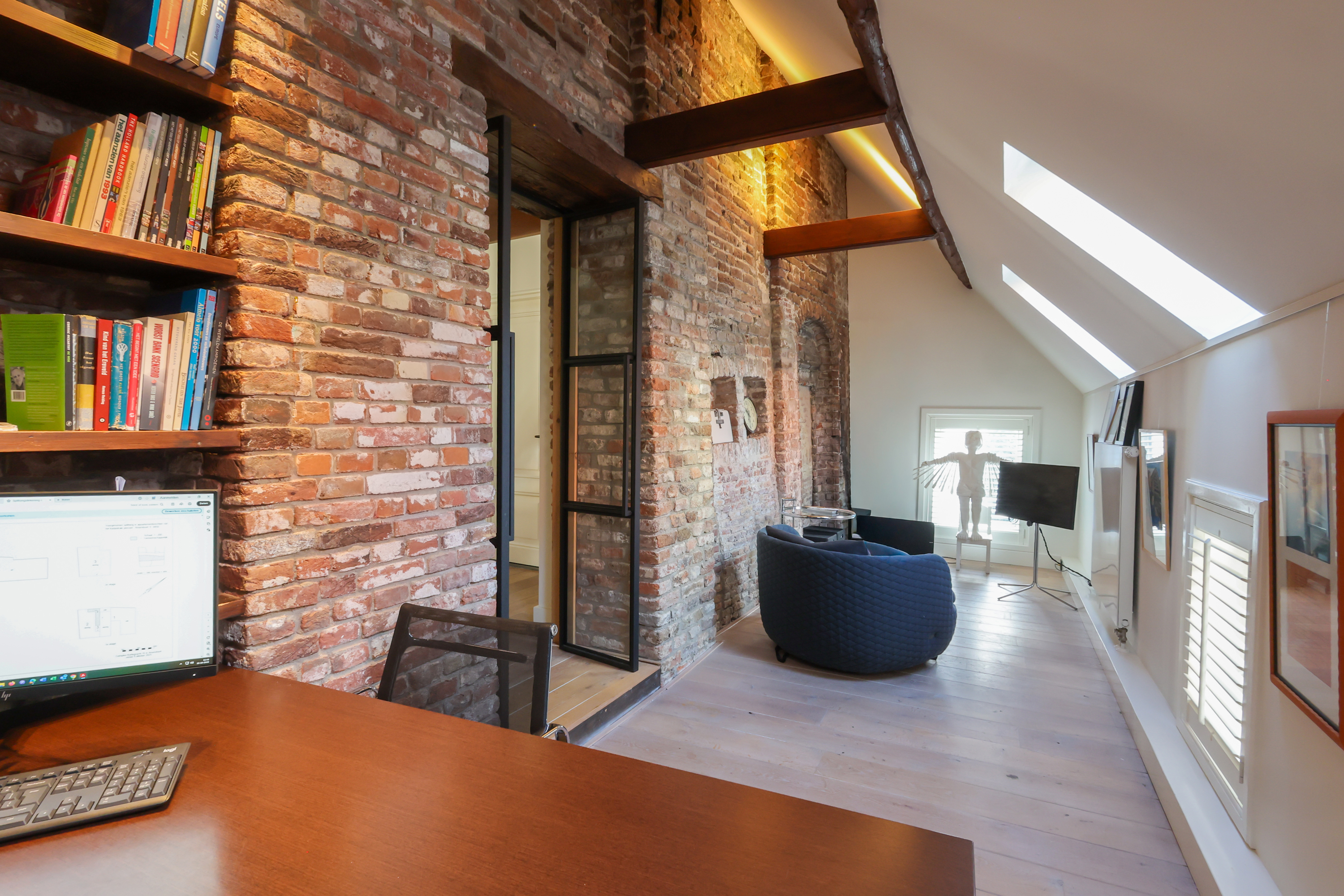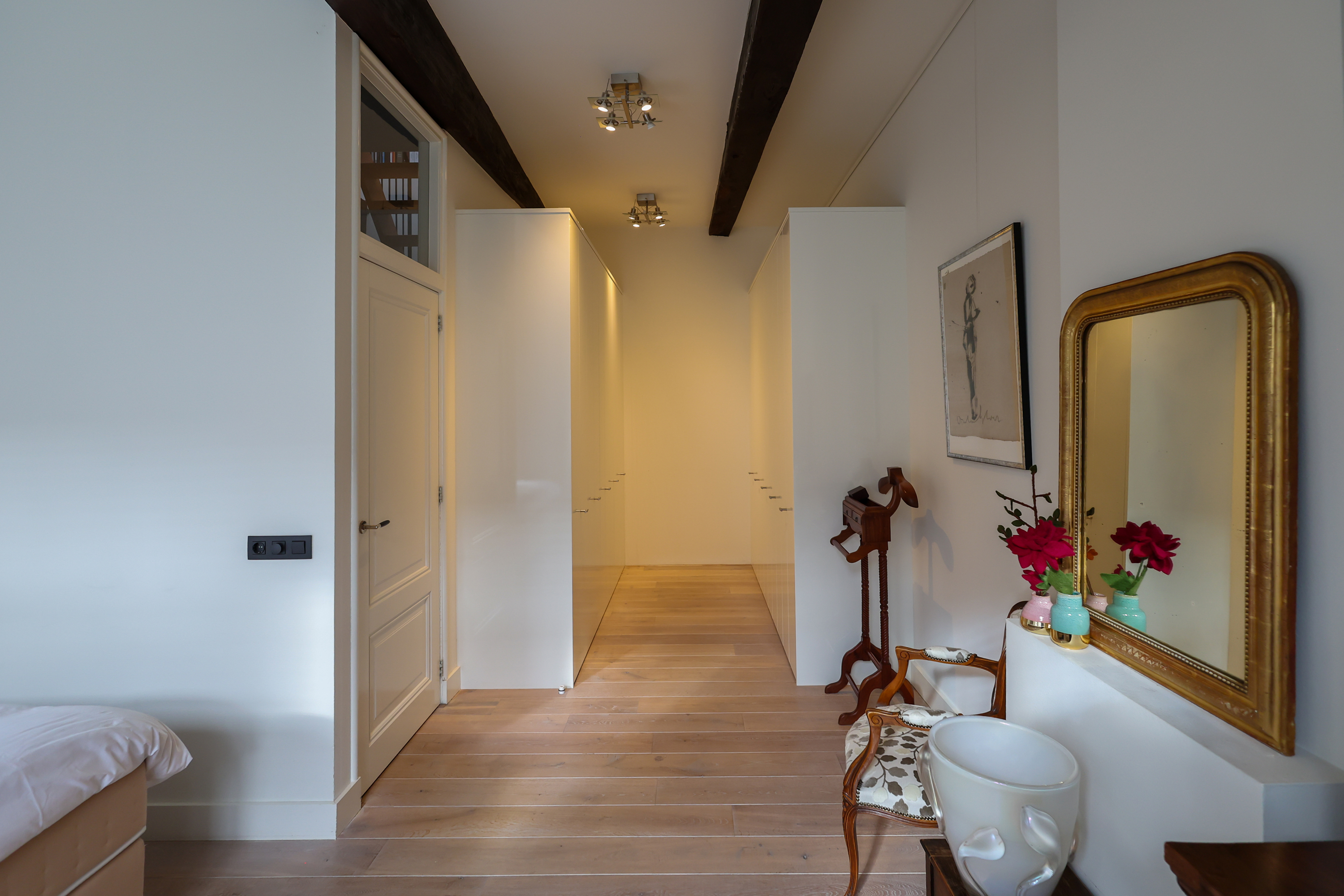 Das Hauptschlafzimmer verfügt über eine begehbare Ankleide mit maßgefertigten Einbauschränken und ein großzügiges Badezimmer. Im Obergeschoss beeindruckt ein Arbeits- oder Spielbereich mit offenen Abschnitten der alten Stadtmauer unter großzügigen Dachfenstern und verstärkt so die Verbindung zur reichen Geschichte Amersfoorts. Drei weitere Schlafzimmer und ein zweites Badezimmer bieten flexible Nutzungsmöglichkeiten.