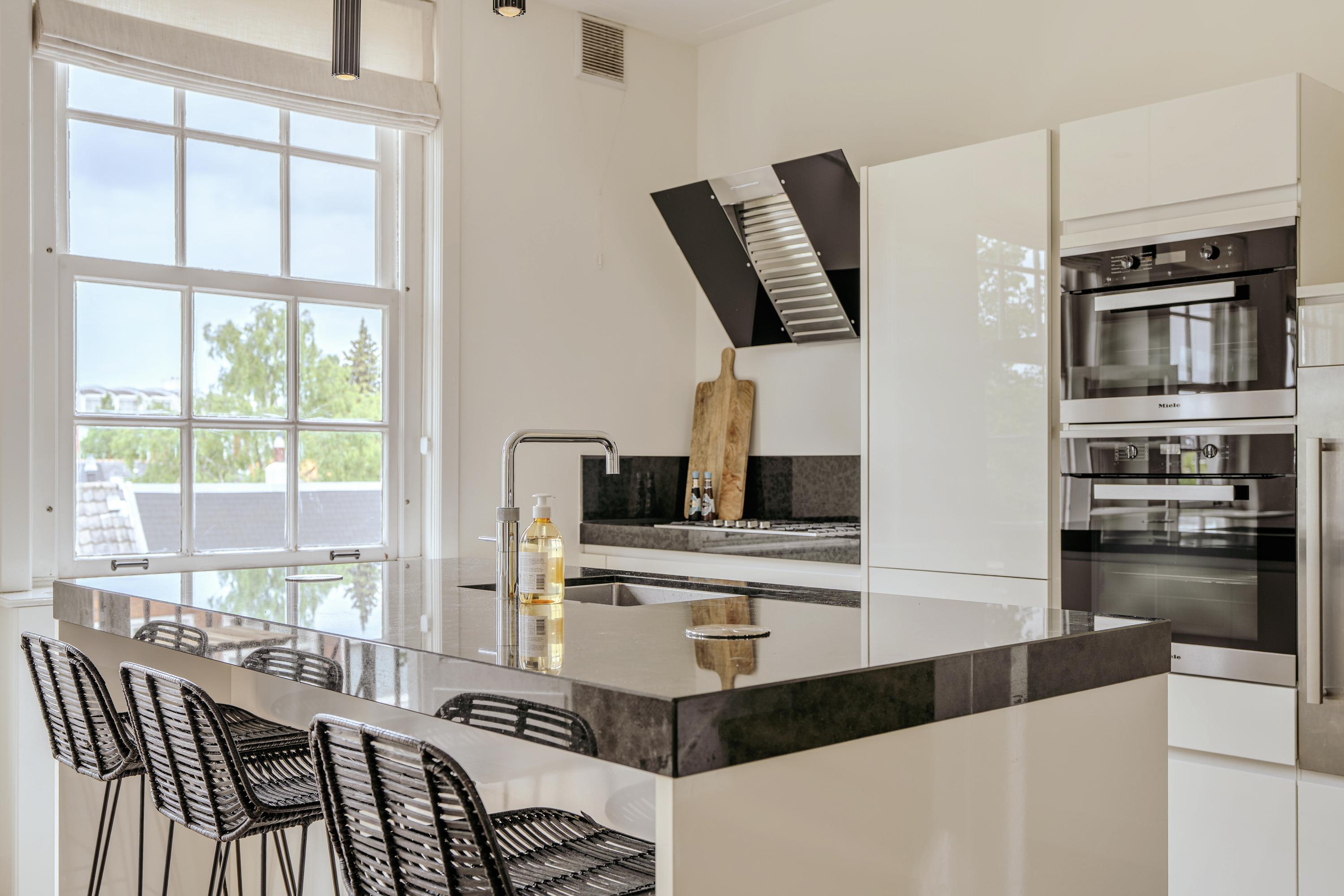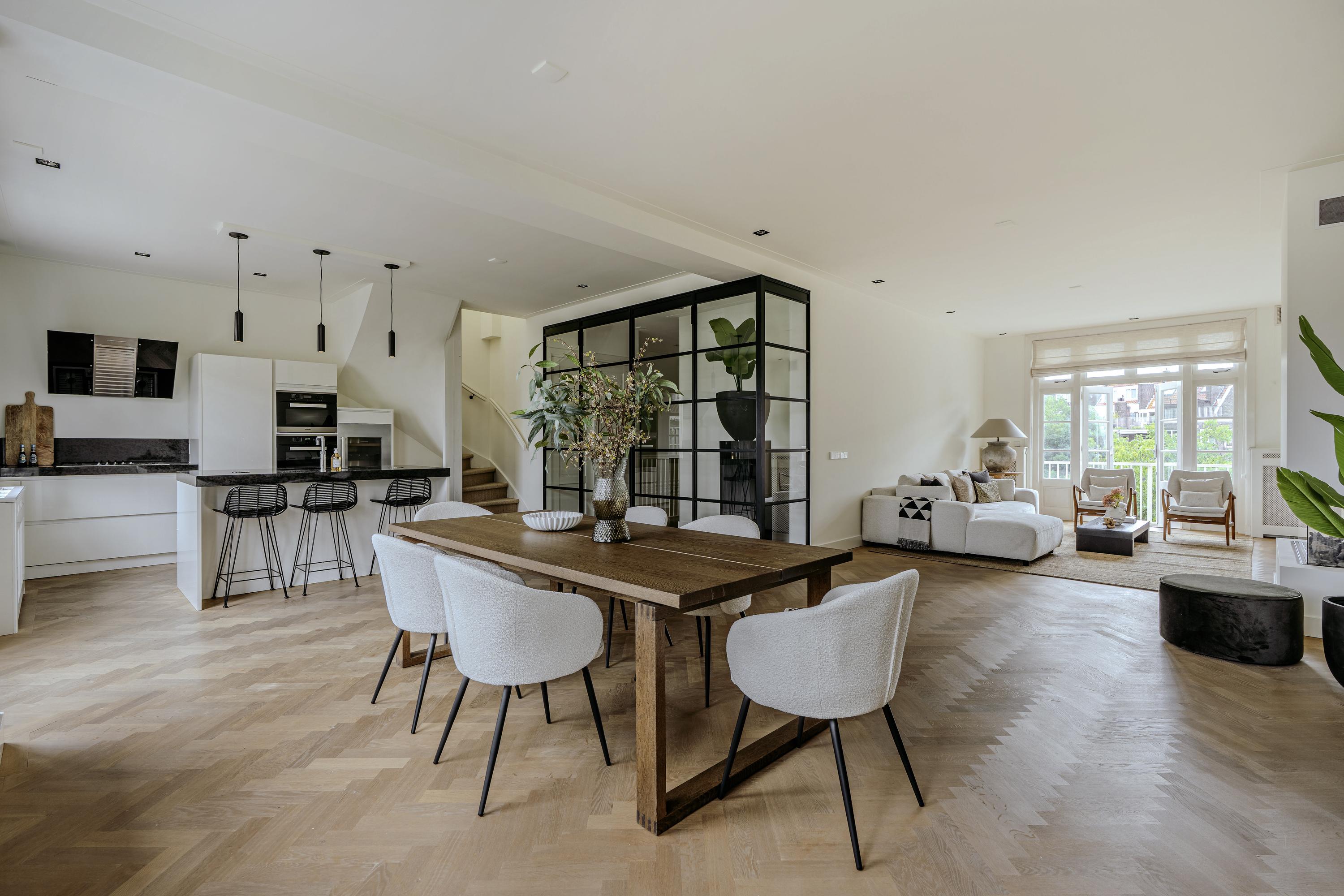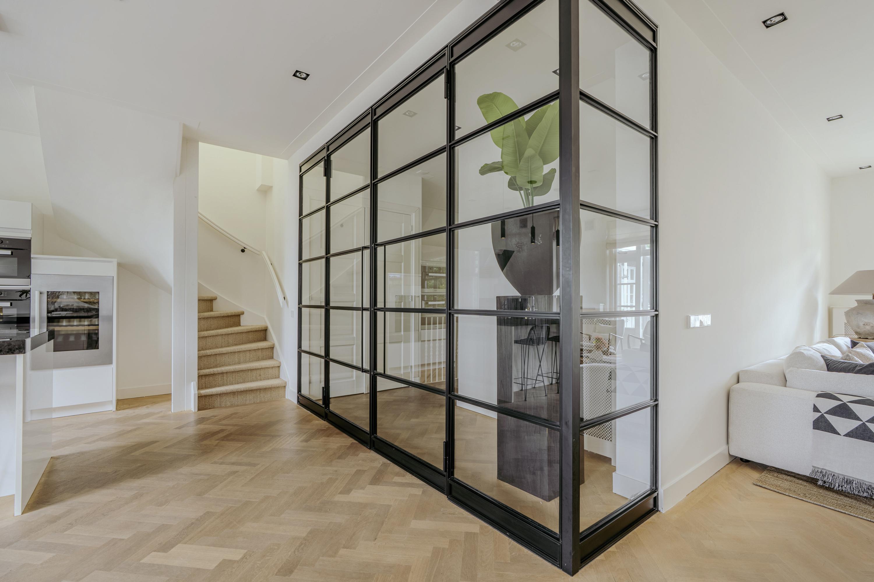 From the hall, elegant steel-framed doors open into a bright and expansive living area. At the front, you'll find a luxurious open-plan kitchen fully equipped with high-end built-in appliances: a 5-burner gas stove, oven, microwave, Quooker, refrigerator, freezer, wine cooler, and dishwasher. The generous kitchen island with bar seating is the social centerpiece of the home, ideal for relaxed evenings with family and friends.
