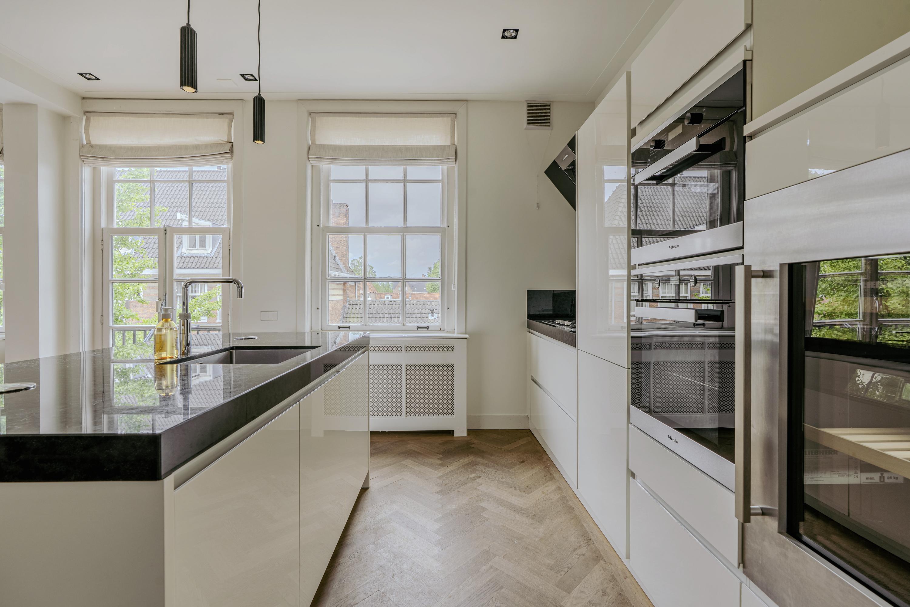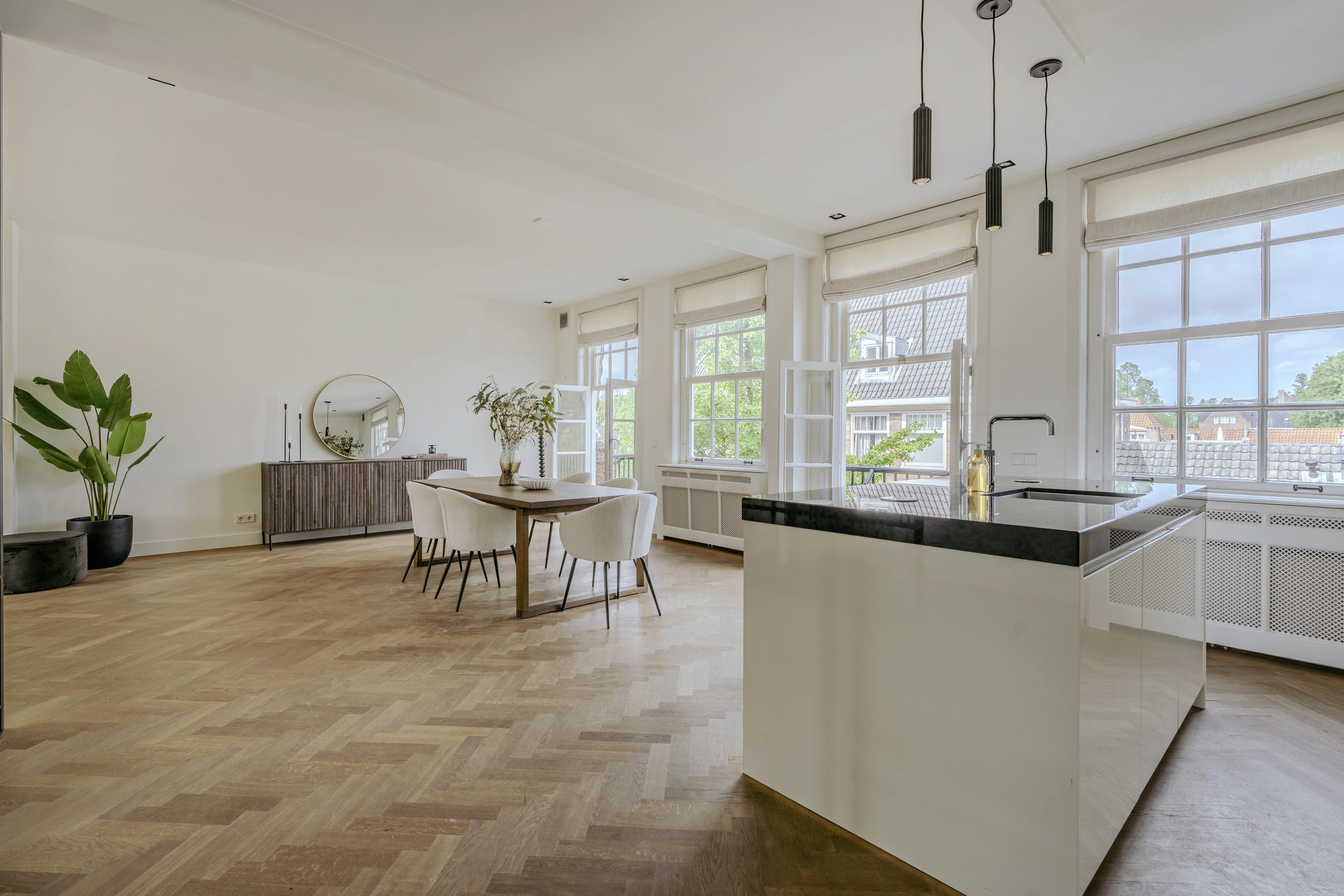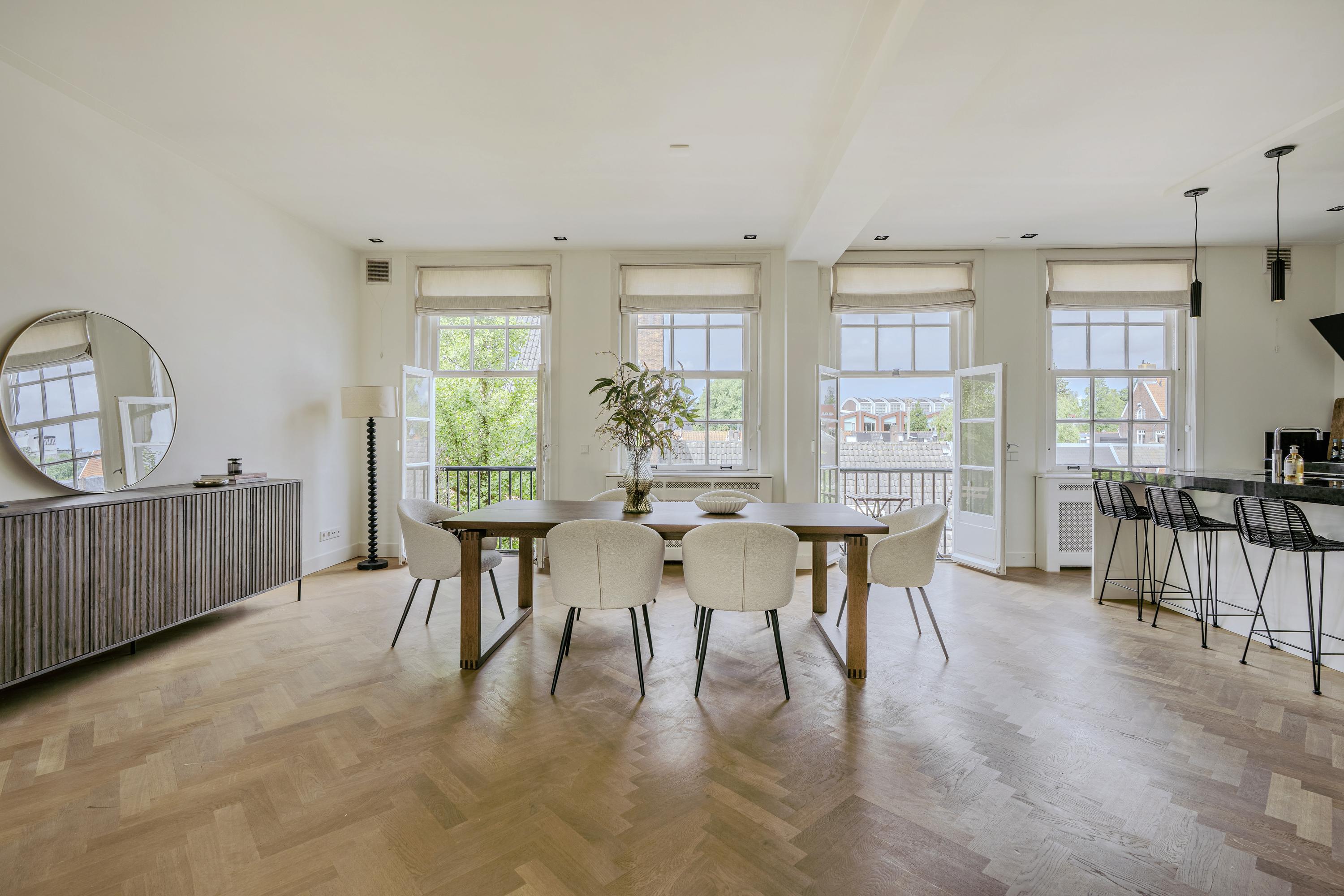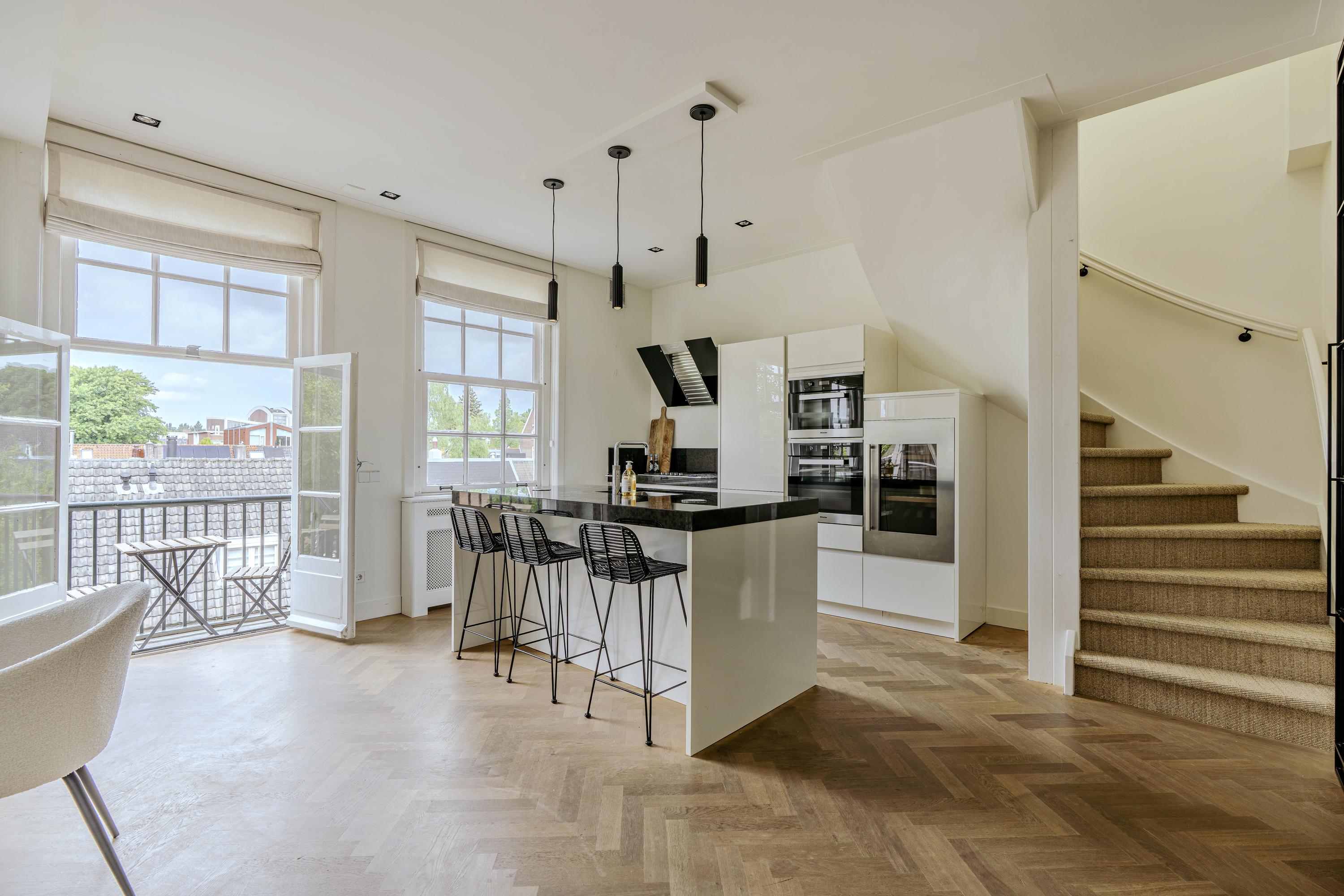 Stylishly finished and exceptionally bright double upper-level apartment (approx. 163m²) with a spacious roof terrace, two balconies, luxury kitchen, and atmospheric living room in a prime location in Amsterdam-Zuid!