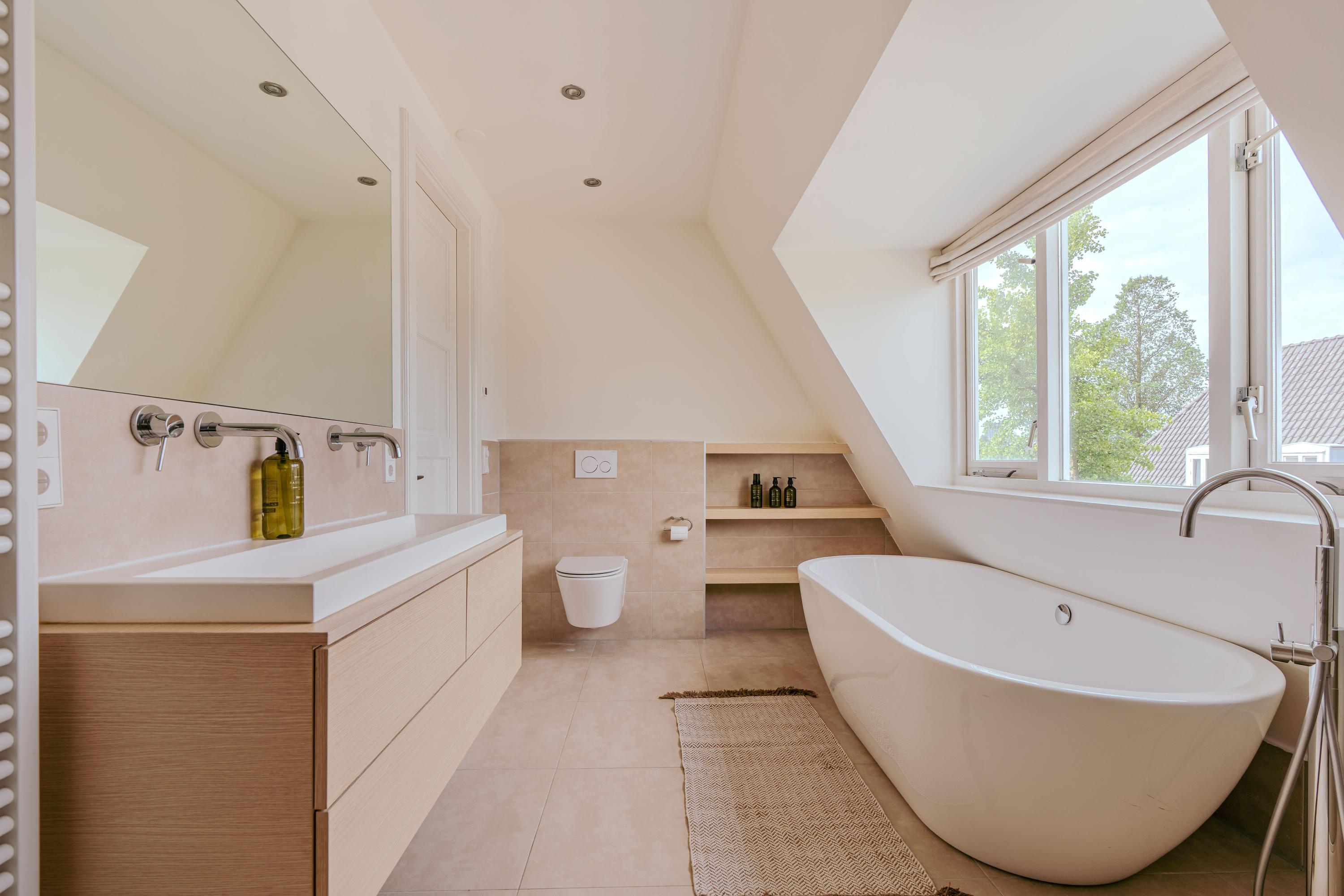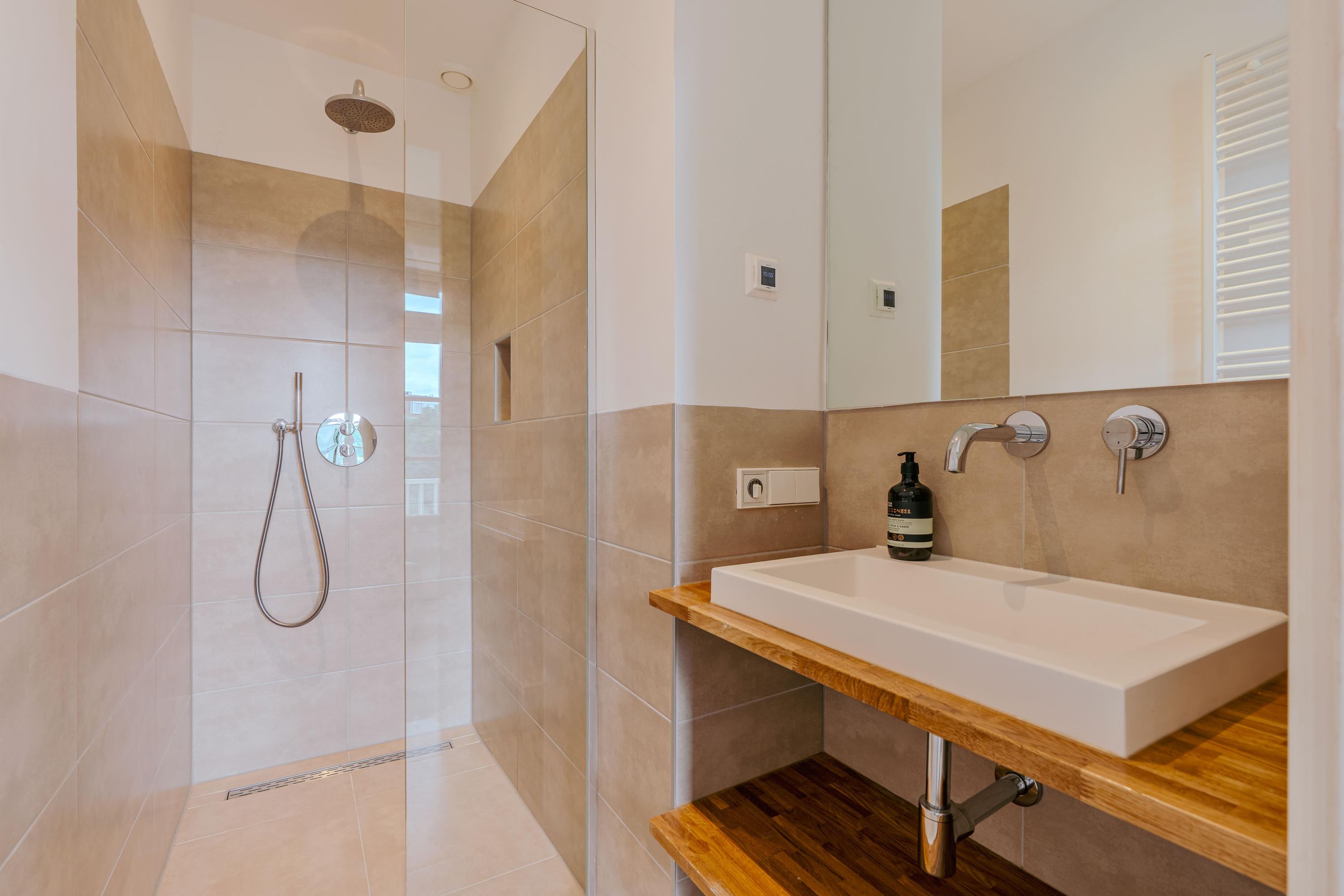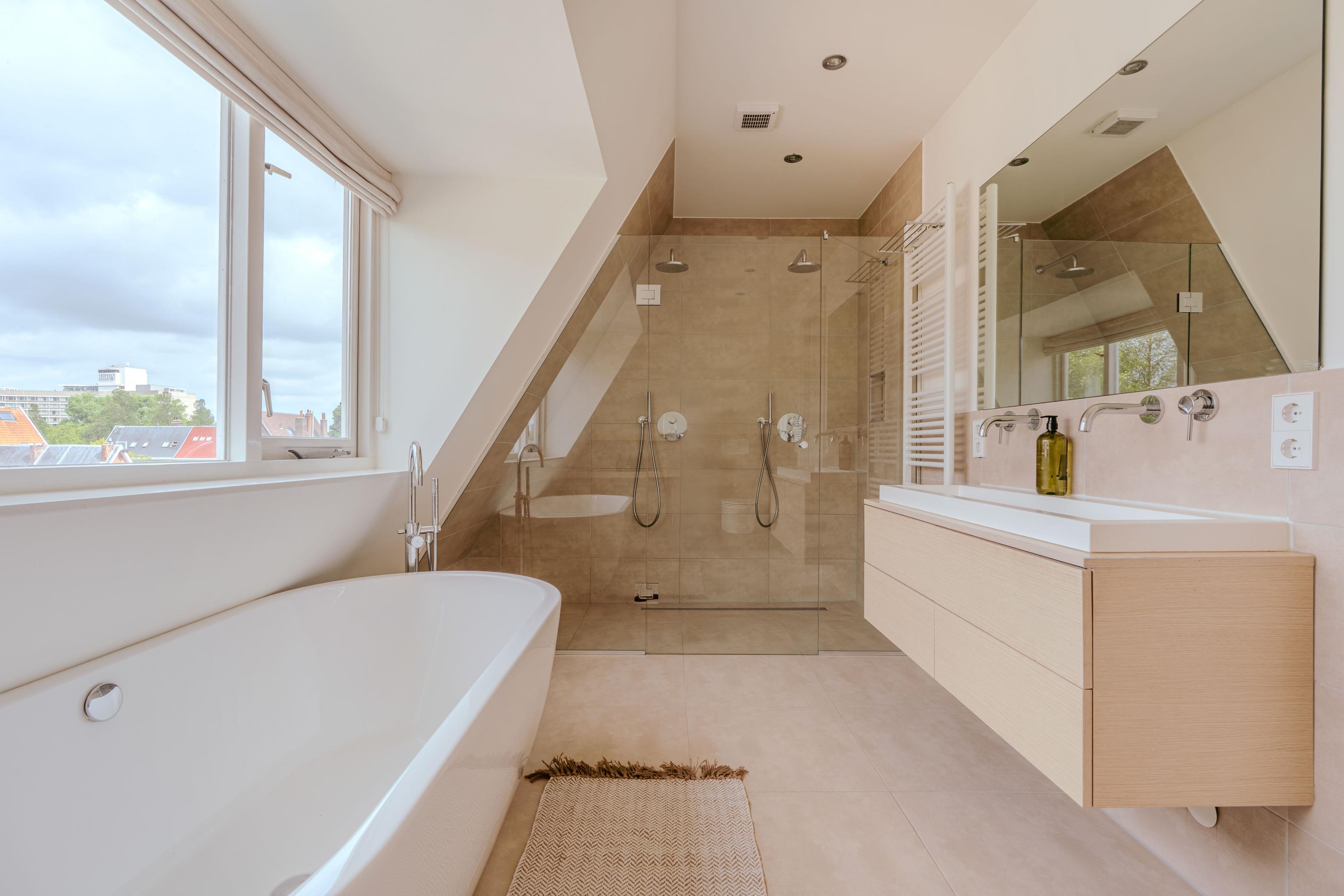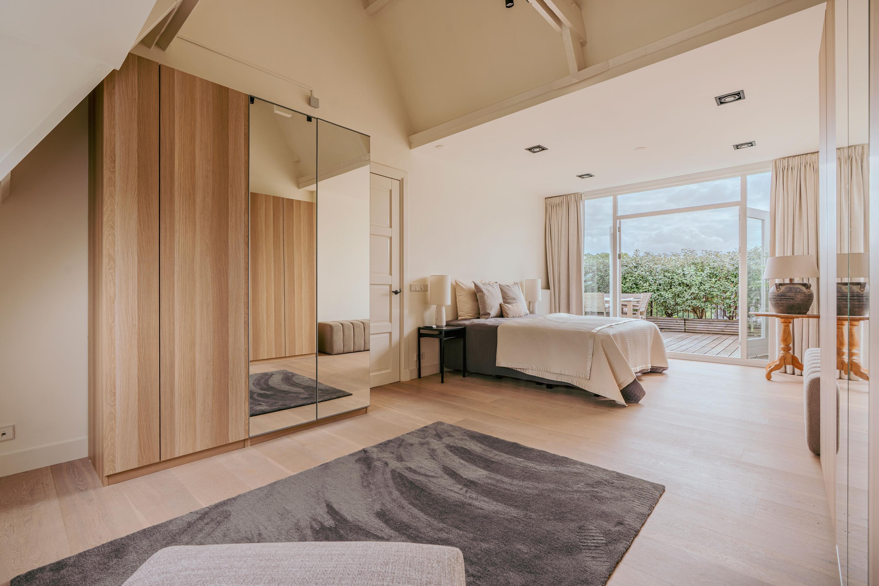 The landing—boasting impressive ceiling height reaching into the roofline, skylights, and clever storage—gives access to all rooms on this level. At the rear is a comfortable bedroom with built-in wardrobes and French doors to a sunny roof terrace. The master bedroom spans the full depth of the building and features air conditioning, custom-made wardrobes, and beautiful original wooden beams that create a warm and inviting atmosphere. Double doors open directly onto the spacious roof terrace—an exceptionally private outdoor area where you can soak up the sun in complete peace. Centrally located on this floor is the stylish bathroom, luxuriously appointed with underfloor heating, a freestanding bathtub, walk-in shower, double washbasin with cabinet, and a second toilet. Large skylights provide plenty of natural light.