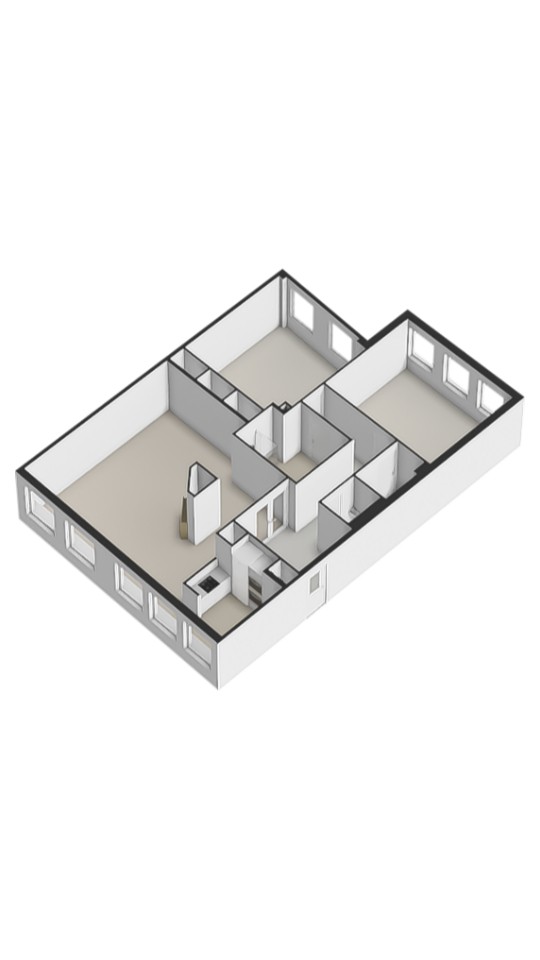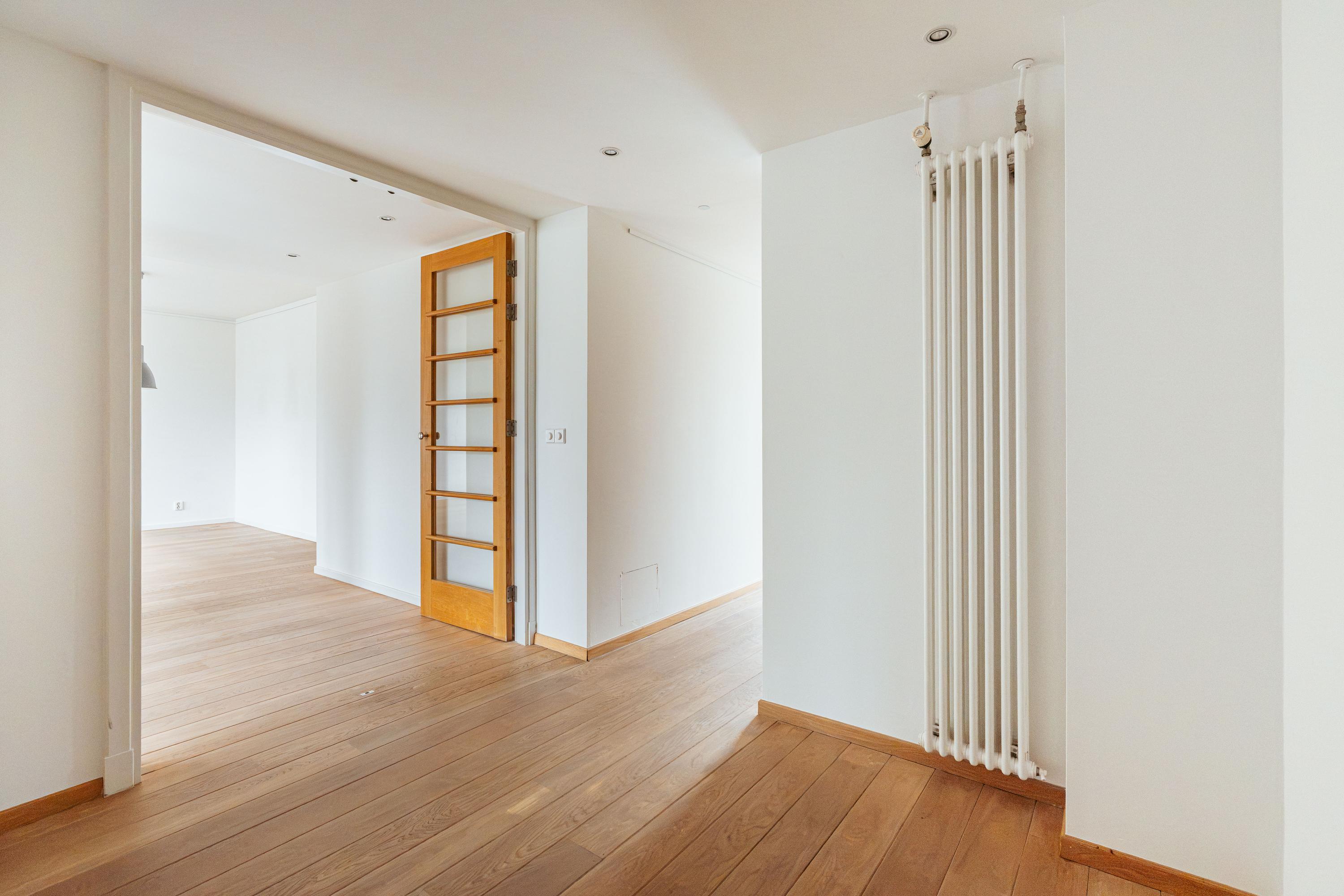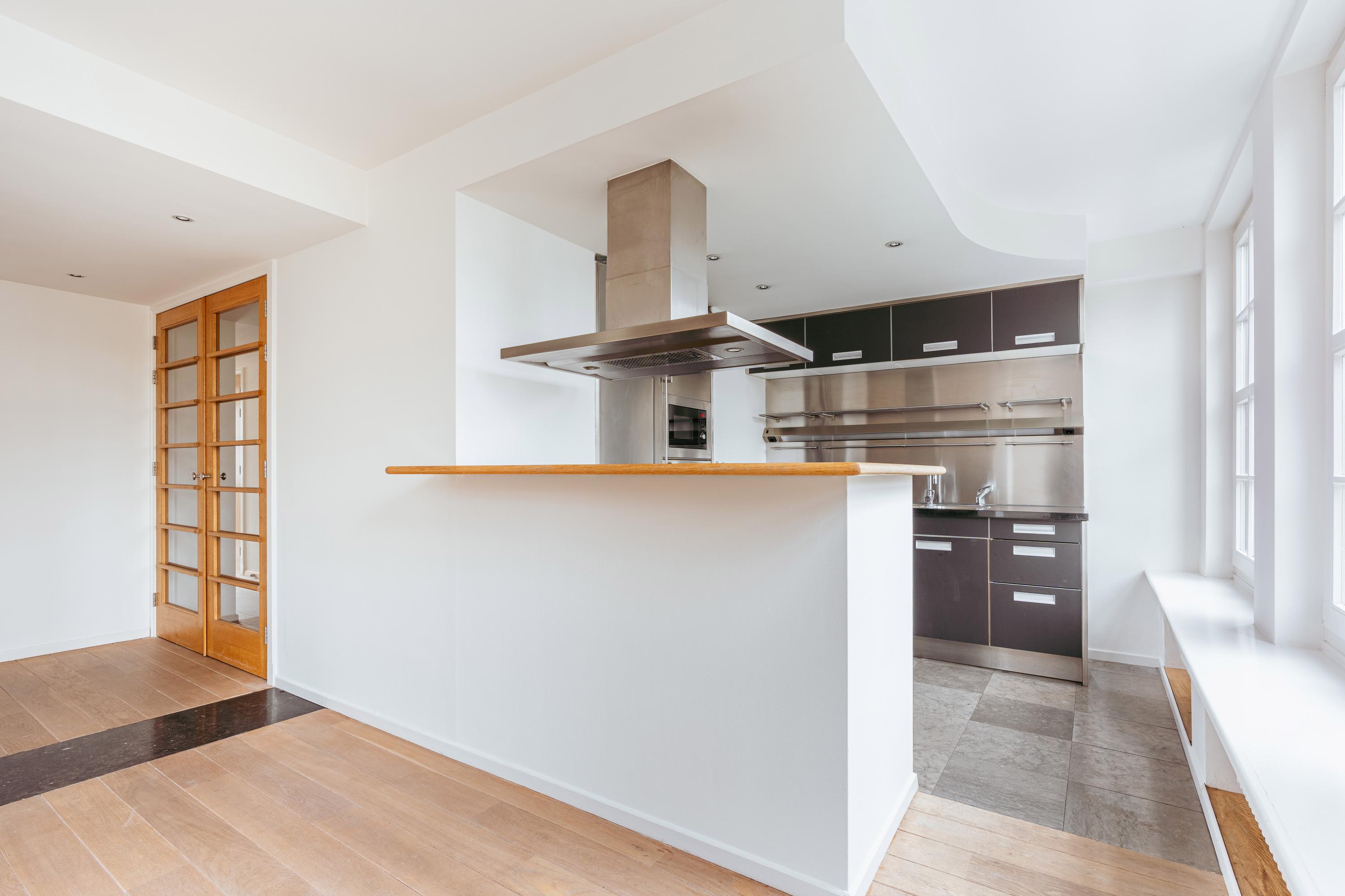Die angrenzende Küche ist funktional und kommunikativ gestaltet, ausgestattet mit Geschirrspüler, Quooker-Wasserhahn und integrierten Stauräumen; eine großzügige Bar lädt zu zwanglosen Treffen ein. Im rückwärtigen Bereich profitieren zwei annähernd gleich große Schlafzimmer von ruhigem Tageslicht, wobei das größere über drei Einbauschränke verfügt. Ein praktischer Abstellraum bietet Platz für Waschmaschine und Trockner. Der Grundriss der Wohnung ist durchdacht und gut strukturiert und bietet Potenzial zur Modernisierung nach individuellem Geschmack.