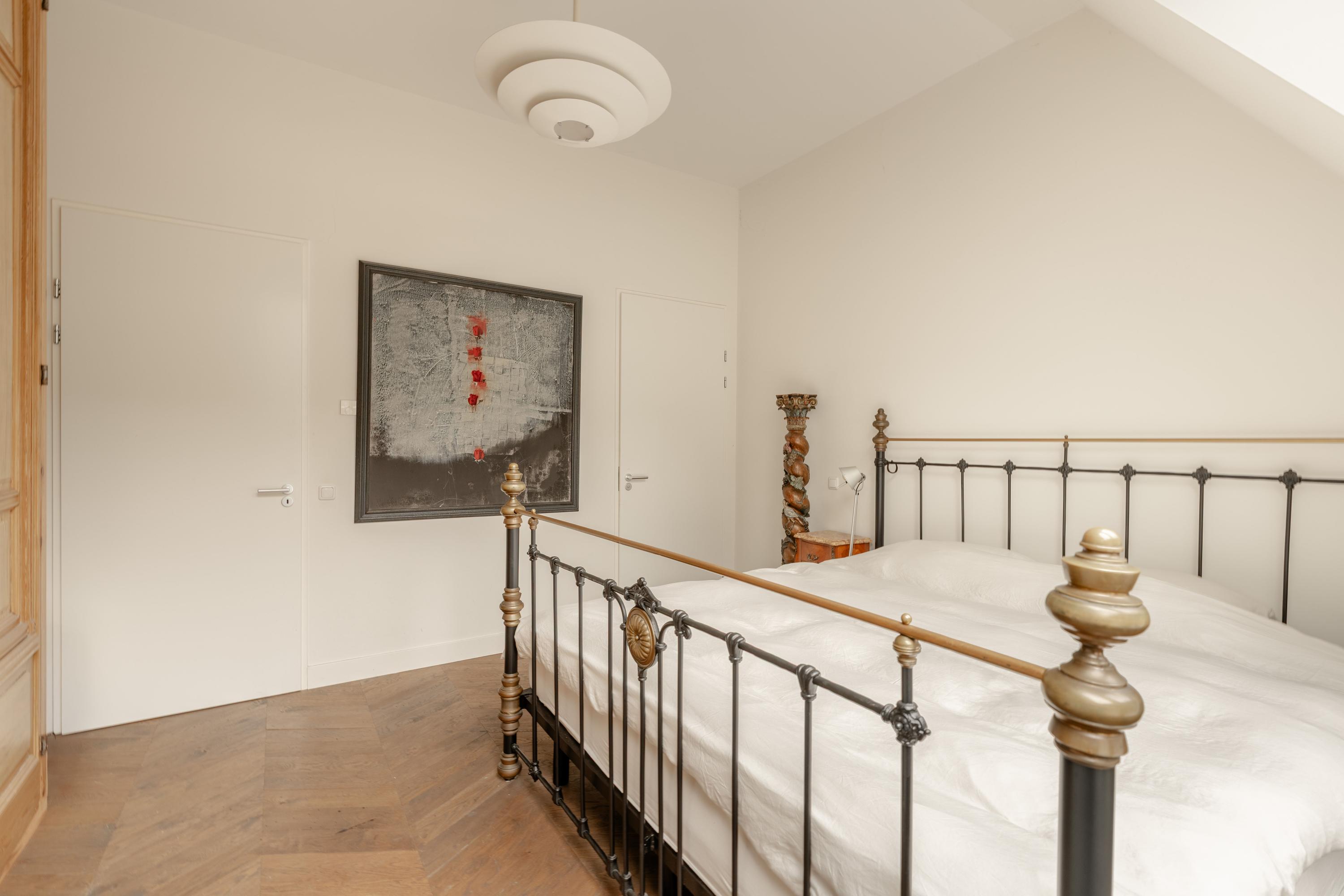Der Grundriss der Wohnung bietet einen privaten Eingang im zweiten Stock. Das nach hinten ausgerichtete Schlafzimmer verfügt über große Fenster mit französischem Balkon, ein en-suite Badezimmer sowie eine ruhige Atmosphäre. Im oberen Geschoss spiegeln der weitläufige Wohnbereich und die elegante offene Küche klare Linien und effiziente Stauraumlösungen wider, unterstrichen von Holzfußböden und dezenten Ausstattungen. Das zweite Schlafzimmer auf dieser Ebene besitzt eine Badewanne und grenzt an ein Badezimmer mit Dusche, ergänzt durch ein separates WC und einen eigenen Abstellraum.