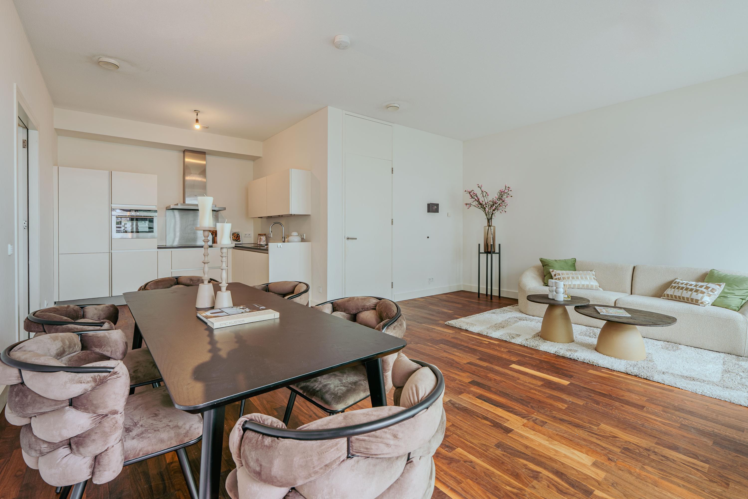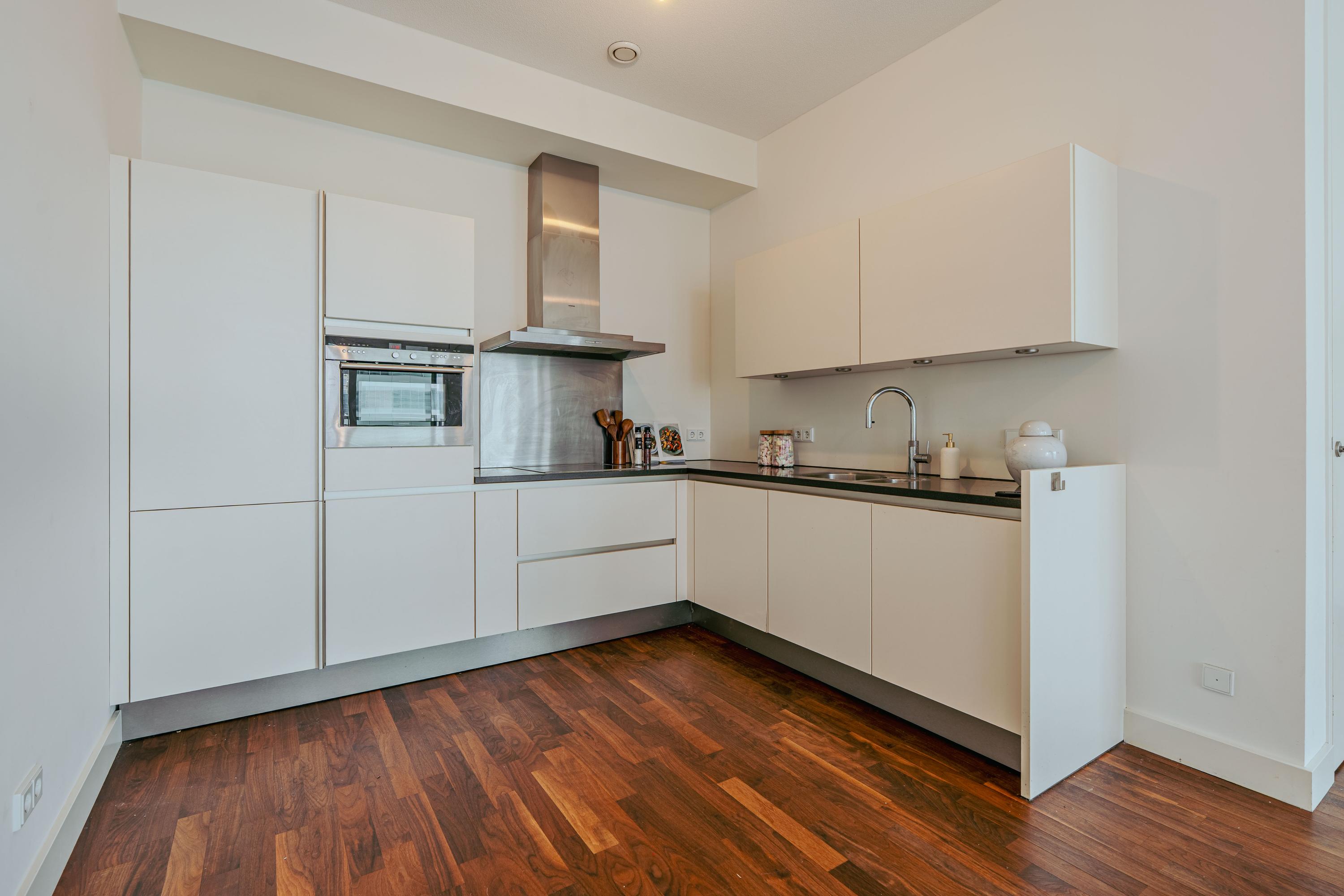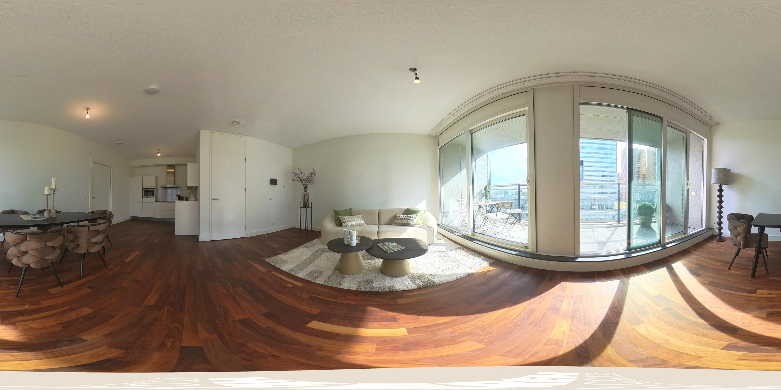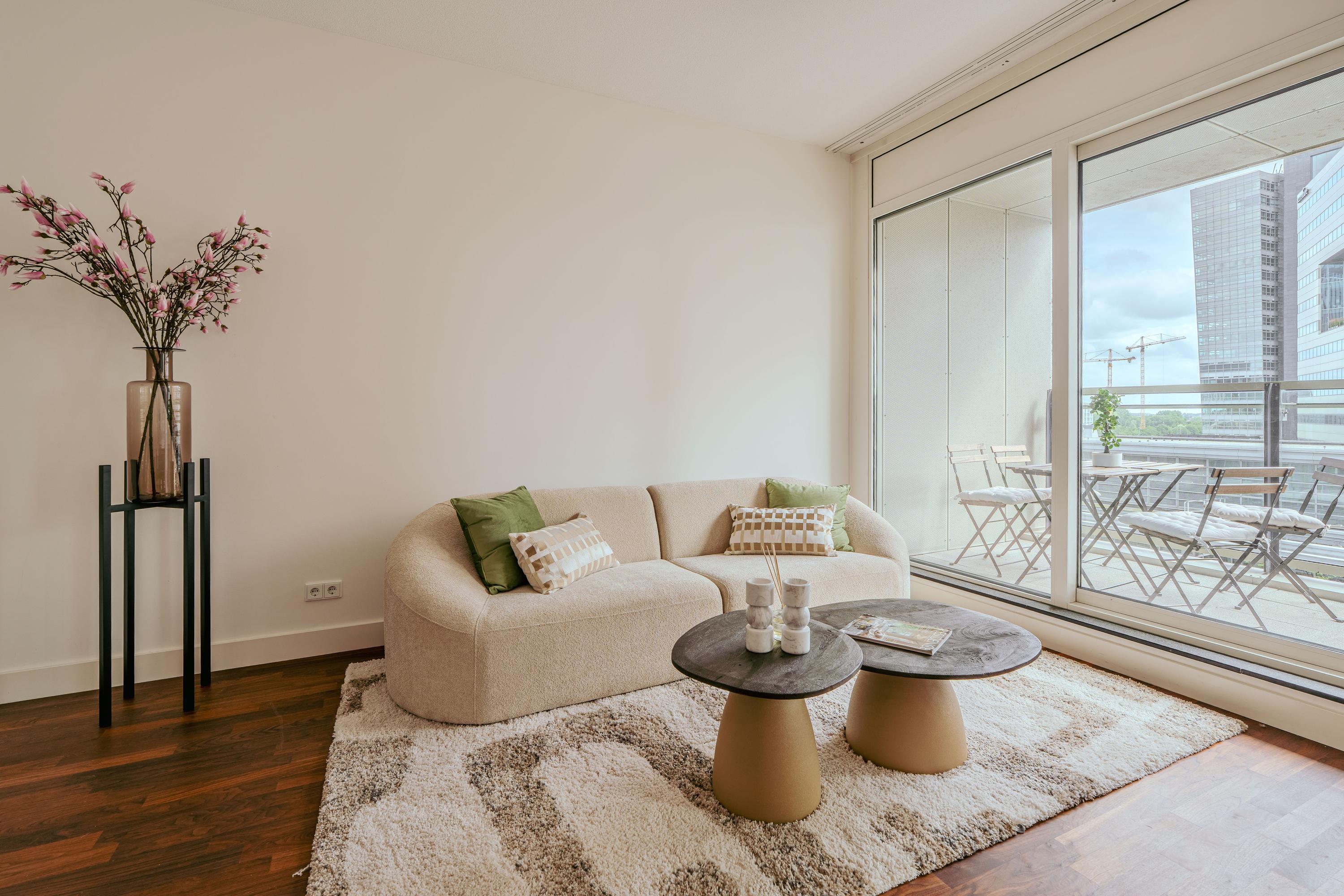 Das Raumerlebnis wird durch Panoramablicke und reichlich Tageslicht bestimmt, das durch bodentiefe Fenster sowohl im Wohnbereich als auch in den Schlafzimmern unterstrichen wird. Glasschiebetüren führen auf den Balkon und bieten eine Oase der Ruhe über dem Tempo der Zuidas. Die offene Küche ist mit Einbaugeräten ausgestattet, die keine kulinarischen Wünsche offenlassen, während das Hauptschlafzimmer einen ruhigen Wintergarten umfasst.