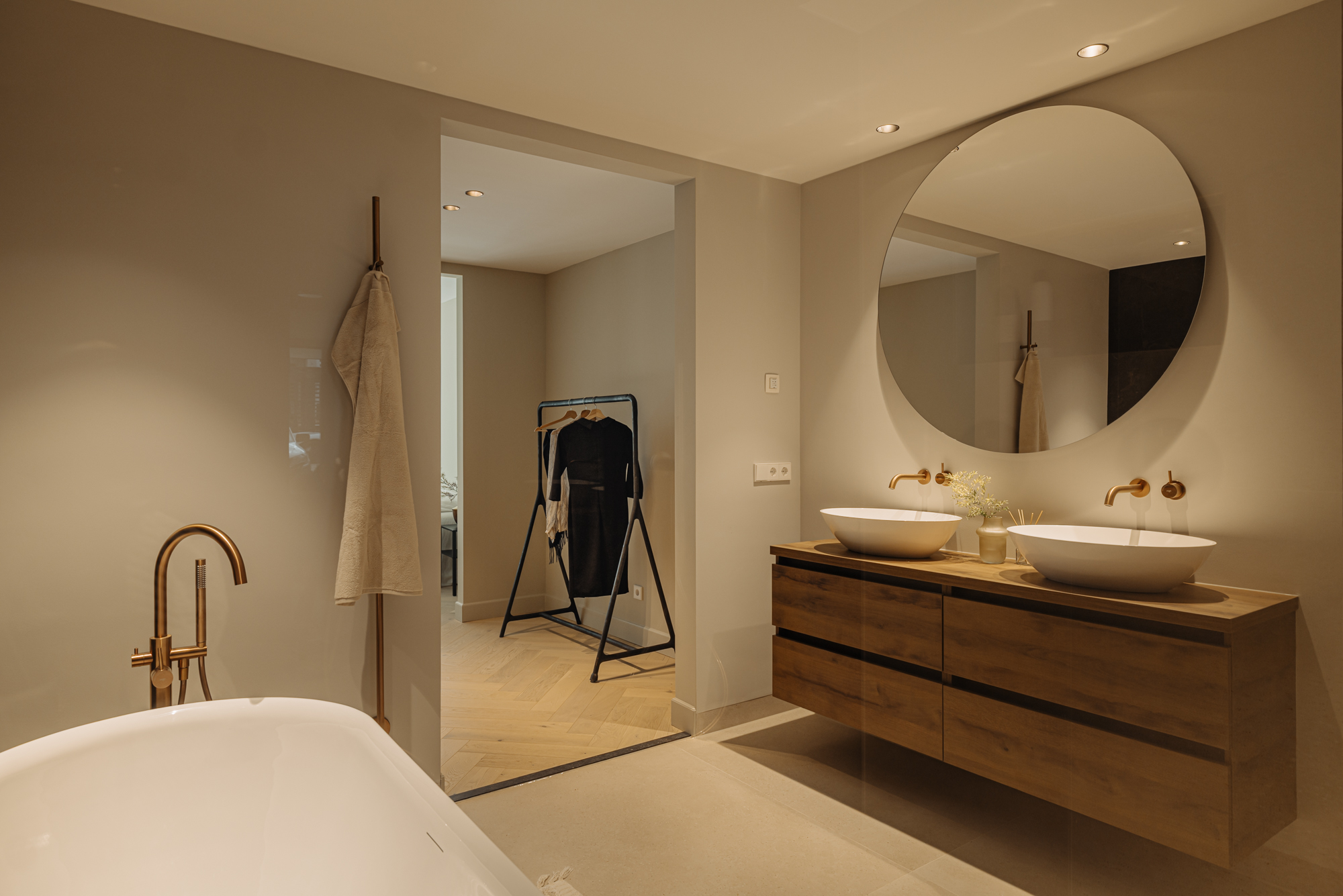 A luxury, 182-m² double ground-floor apartment with four bedrooms, two bathrooms, a balcony, terrace, internal storage space and a front and back entrance. The apartment features carefully selected, high-end materials that create a sense of warmth and comfort. Luxury herringbone floors, high ceilings, subtle tones in the kitchen and bathrooms and a well-thought-out lighting plan create a harmonious and inviting ambiance. The kitchen, with its clean lines and ample storage space, is a perfect combination of style and practical functionality. The building itself is a freehold property.