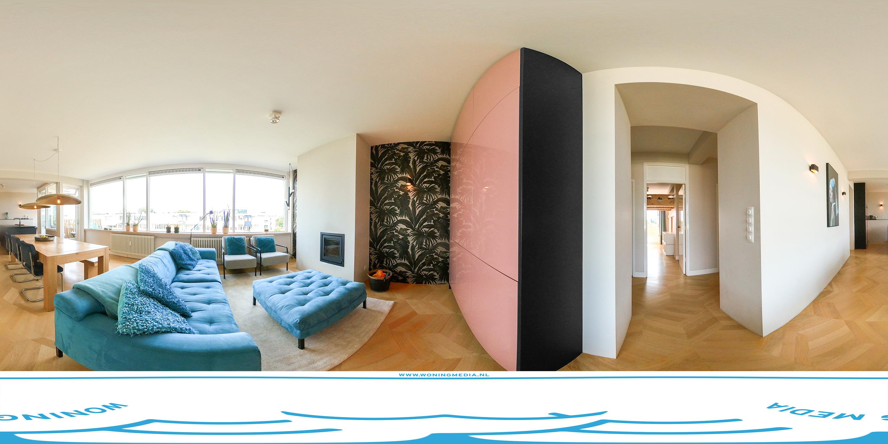 Upon entering, you are welcomed by a spacious hallway with an elegant parquet floor and practical built-in cupboards. The bright living area comprises a generous open-plan kitchen, dining space, and a comfortable lounge featuring a built-in wood-burning stove. The modern kitchen, finished in black Fenix, is equipped with a cooking island including an induction hob, oven, combi-oven, dishwasher, large refrigerator, and Quooker. Thanks to the glass façade and two French doors opening onto the west-facing balcony, the living room is bathed in natural light. The apartment offers three bedrooms. The master bedroom, located at the front of the apartment, features an entire wall of wardrobes, an original built-in cabinet with safe, and direct access to the balcony. The other bedrooms also enjoy access to the balcony. The luxurious bathroom is fitted with a rain shower, bathtub, double washbasin, and a second toilet. Additional built-in storage spaces are available throughout the apartment, including a spacious utility room with connections for a washing machine and dryer. The entire apartment is finished with a herringbone floor and atmospheric lighting by Zuiver. With large windows on both sides, the home enjoys abundant natural light throughout the day. Morning sun streams into the bedrooms, while in the afternoon and evening the kitchen and living area are filled with warm sunlight. This not only creates an exceptionally bright and airy atmosphere but also enhances the overall sense of space and comfort.