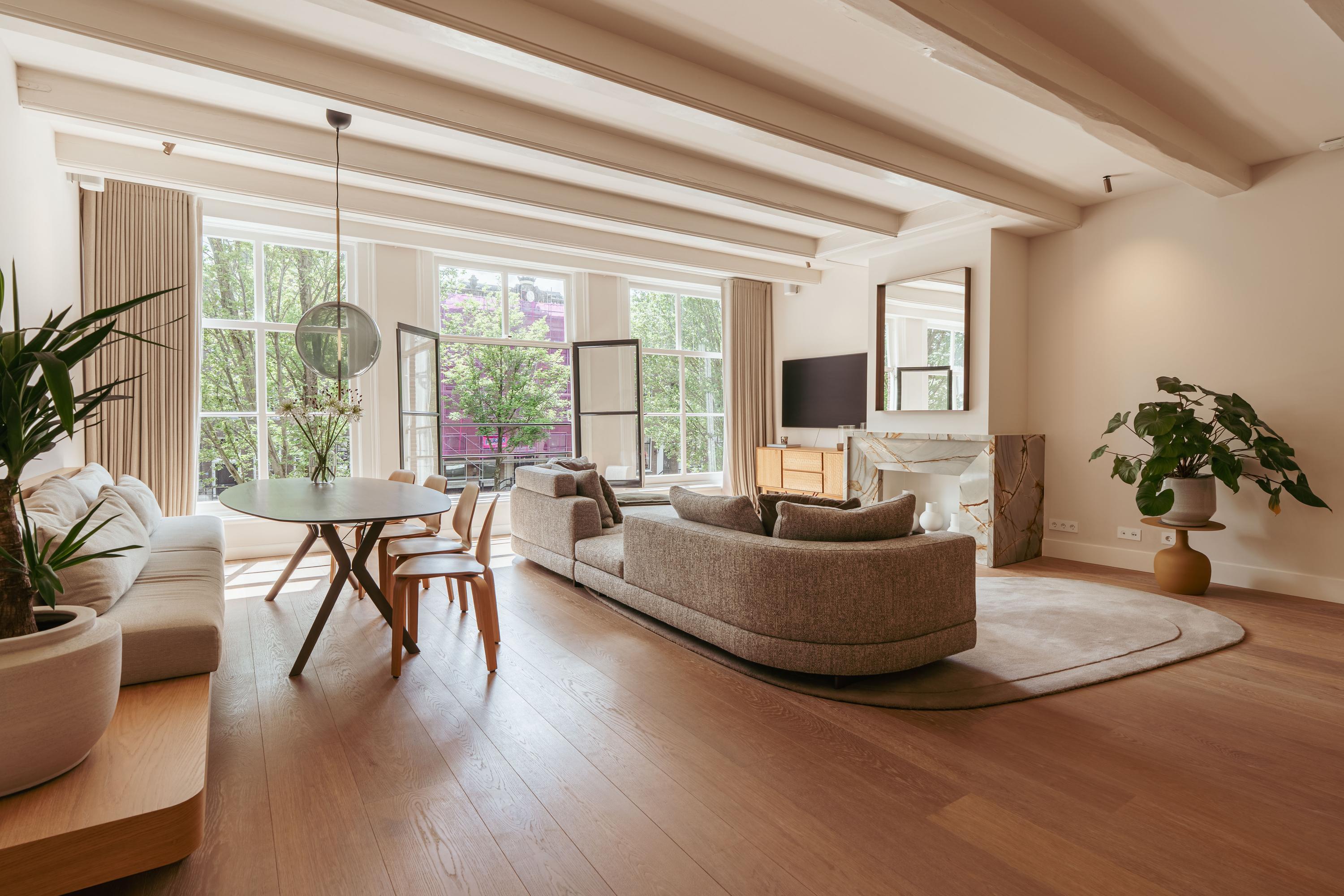 Aan de voorzijde bevindt zich de prachtige en breed opgezette woonkamer met grote raampartijen en fenomenaal uitzicht over de Herengracht. De ruimte wordt gekenmerkt door veel lichtinval en een bijzonder detail: de schouw en de achterwand in de keuken zijn uitgevoerd in hetzelfde kleurrijke marmer, wat zorgt voor een luxe en stijlvolle uitstraling.