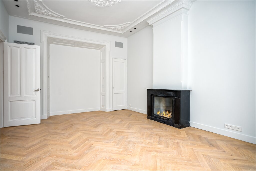De woonkamer op de eerste verdieping is bereikbaar via zowel trap als met de lift. Een stijlvolle en suite kamer met hoge gedecoreerde plafonds. De voorzijde is ingericht als televisiekamer met een gashaard en is tevens al voorzien van een televisie. Aan de achterzijde bevindt zich de zitkamer met nóg een openhaard en bibliotheek. Door de vide is hierbij een prettige verbinding met de keuken op de begane grond.