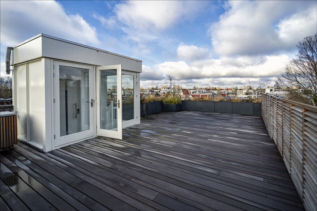 Het royale dakterras is gebouwd van duurzaam hardhout, heeft een grote loungehoek en buitenkeuken. Daarnaast is er ook nog ruim voldoende plek voor een grote eettafel.