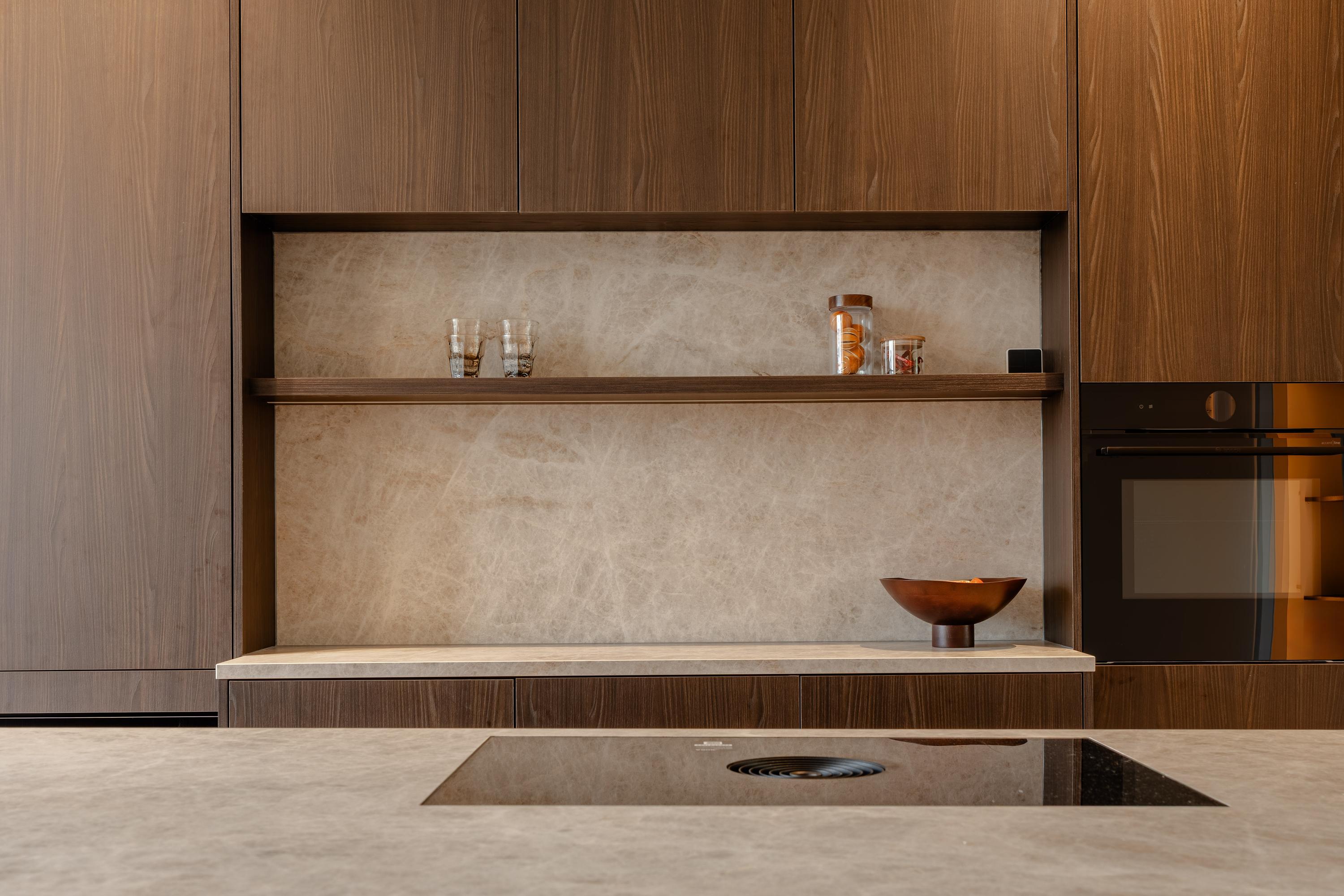 Das Wohnzimmer mit einer Deckenhöhe von 3,28 Metern öffnet sich zu einem Balkon auf der Vorderseite und verbindet sich durch elegante Schiebetüren mit einer individuell gestalteten Küche samt Essbereich. Maßgefertigte Einbauten integrieren den Stauraum dezent, während die Kücheninsel mit Induktionskochfeld und Quooker als Herzstück für Alltag und Empfang dient. Fußbodenheizung zieht sich durch die gesamte Wohnung und wird ergänzt durch eine hochwertige Dämmung und Doppelverglasung, was die Energieklasse A garantiert.