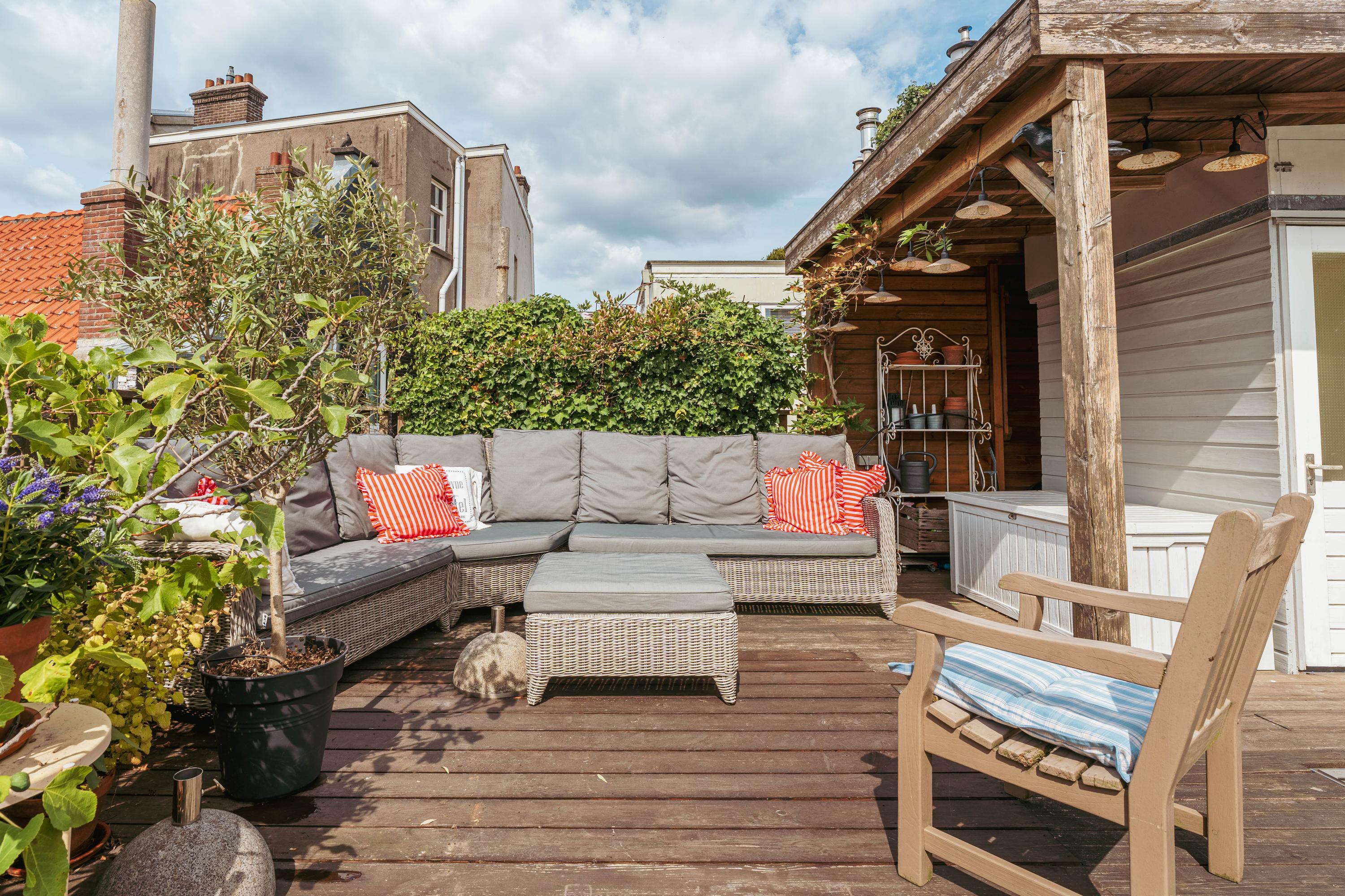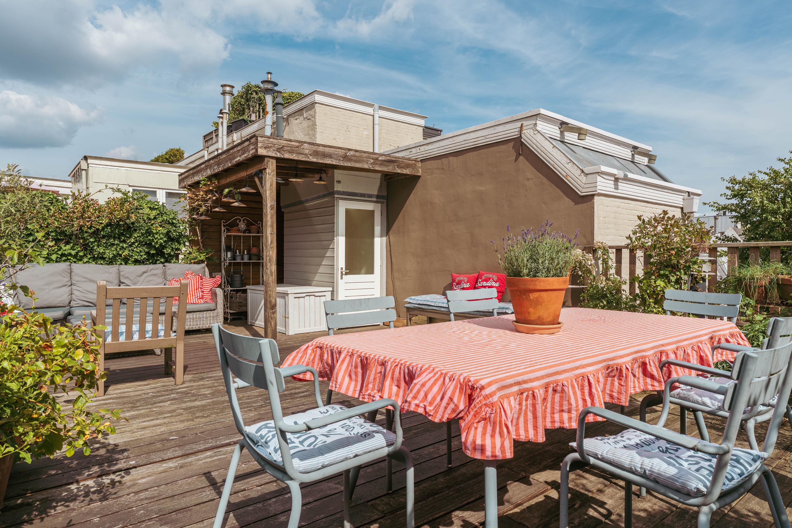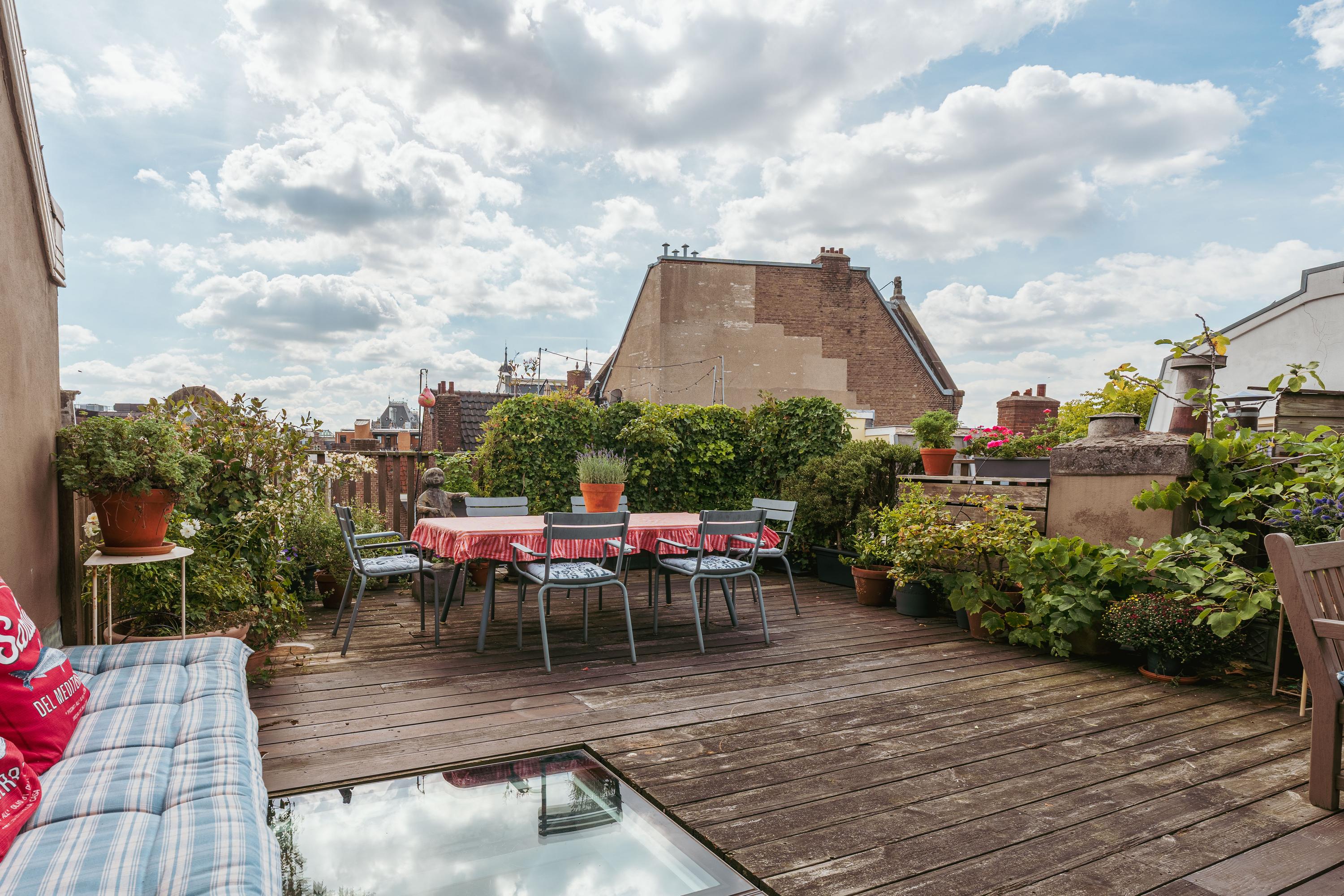 Die nach Süden ausgerichtete Dachterrasse, sorgfältig mit Holz und Begrünung gestaltet, bietet ein privates Refugium über dem pulsierenden Zentrum Amsterdams. Hier genießen Sie das ganze Jahr über Mahlzeiten und Entspannung mit einem beeindruckenden Panorama über die Dächer der Stadt—ein Beweis für die außergewöhnliche Lage dieses Zuhauses.