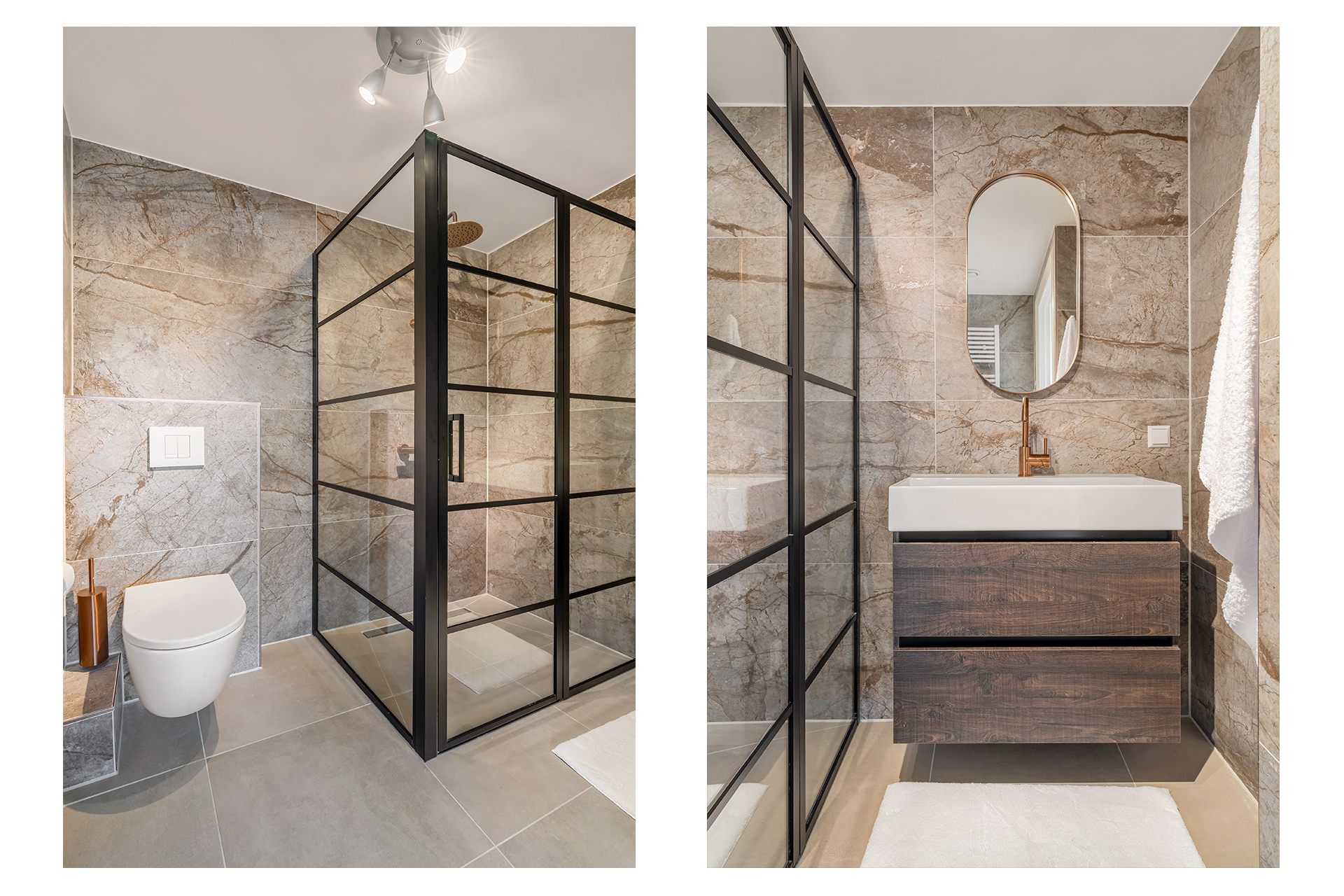 The main floor features a living and dining room in direct connection, anchored by a functional kitchen with modern appliances, and practical storage. Downstairs, two full bedrooms and an additional multi-purpose space share a central bathroom and separate utility room. The building itself was completed in 2006, housing only seven exclusive residences.