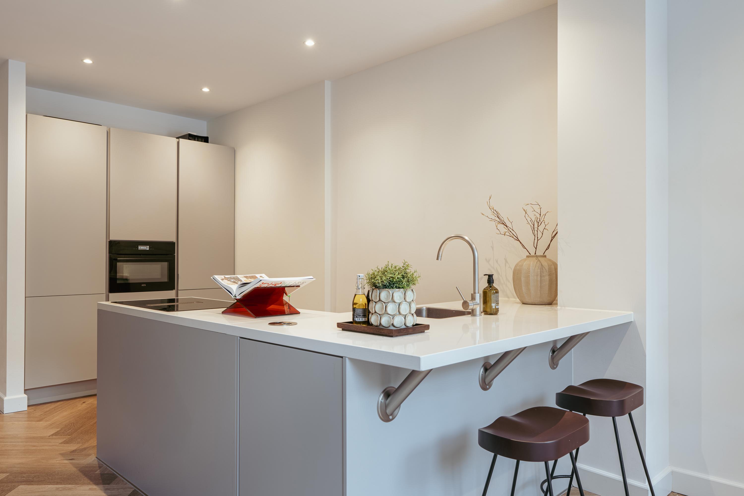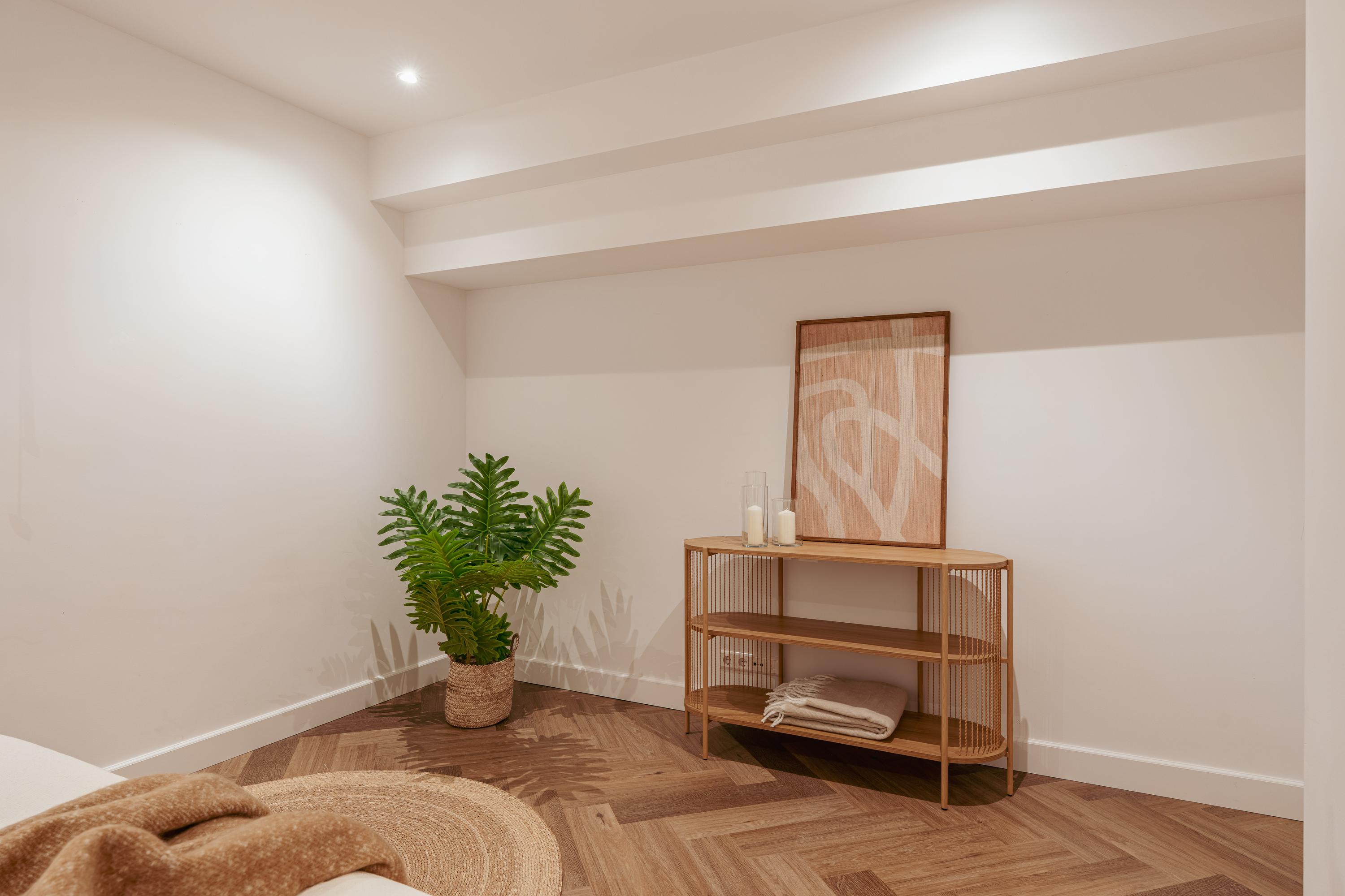 Der offene Wohnbereich erstreckt sich von der Straßenseite bis in den privaten, 65,1 m² großen Garten, der durch Schiebetüren zugänglich ist und Luft sowie natürliches Licht in das großzügige Interieur bringt. Die moderne Küche ist mit aktuellen Geräten ausgestattet und verfügt über eine fest integrierte Bar, die sich harmonisch in den Wohn- und Essbereich einfügt. Fußbodenheizung ist in der gesamten Wohnung vorhanden, ergänzt durch hochleistungsfähige Doppelverglasung und sowohl mechanische als auch natürliche Belüftung, was für Komfort und Energieeffizienz auf A-Niveau sorgt.