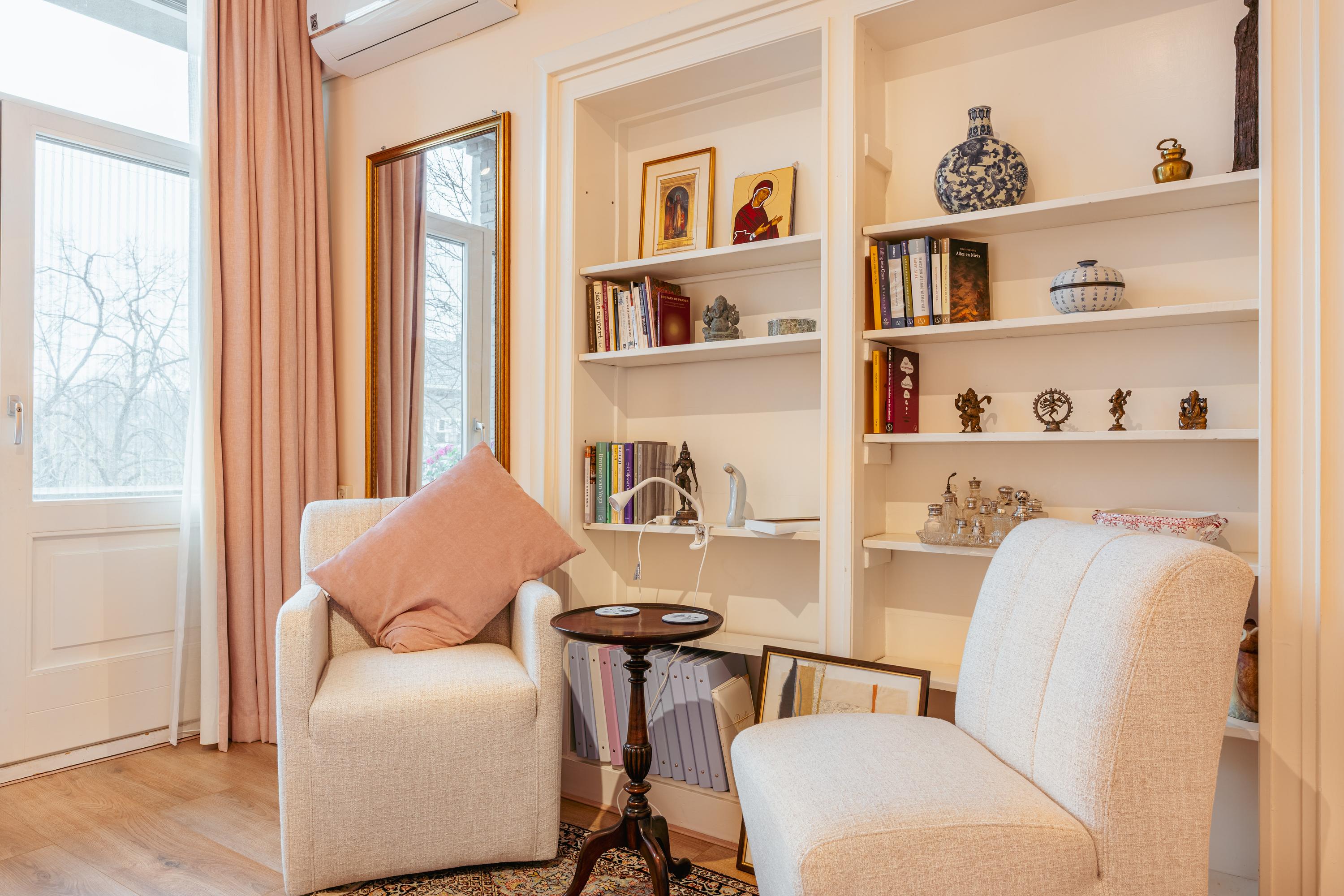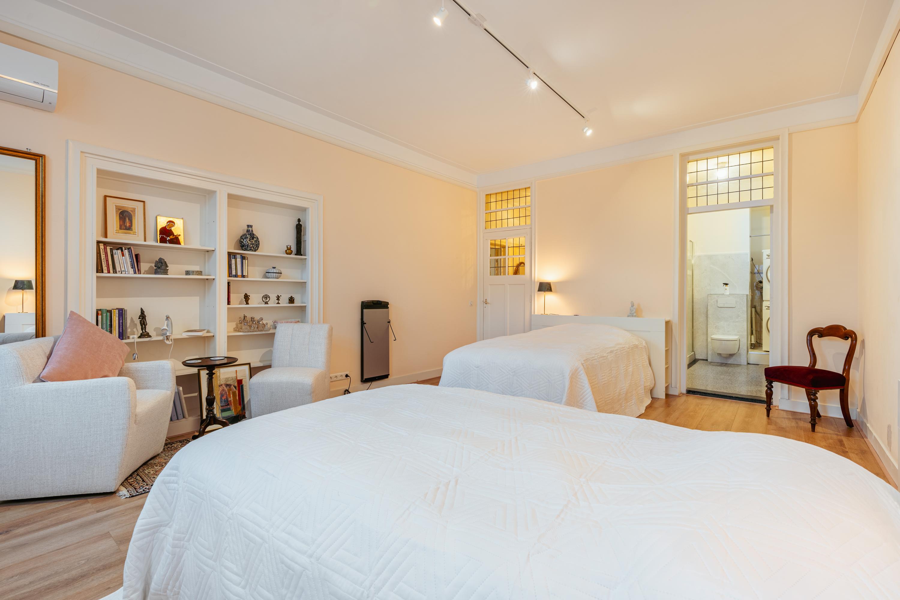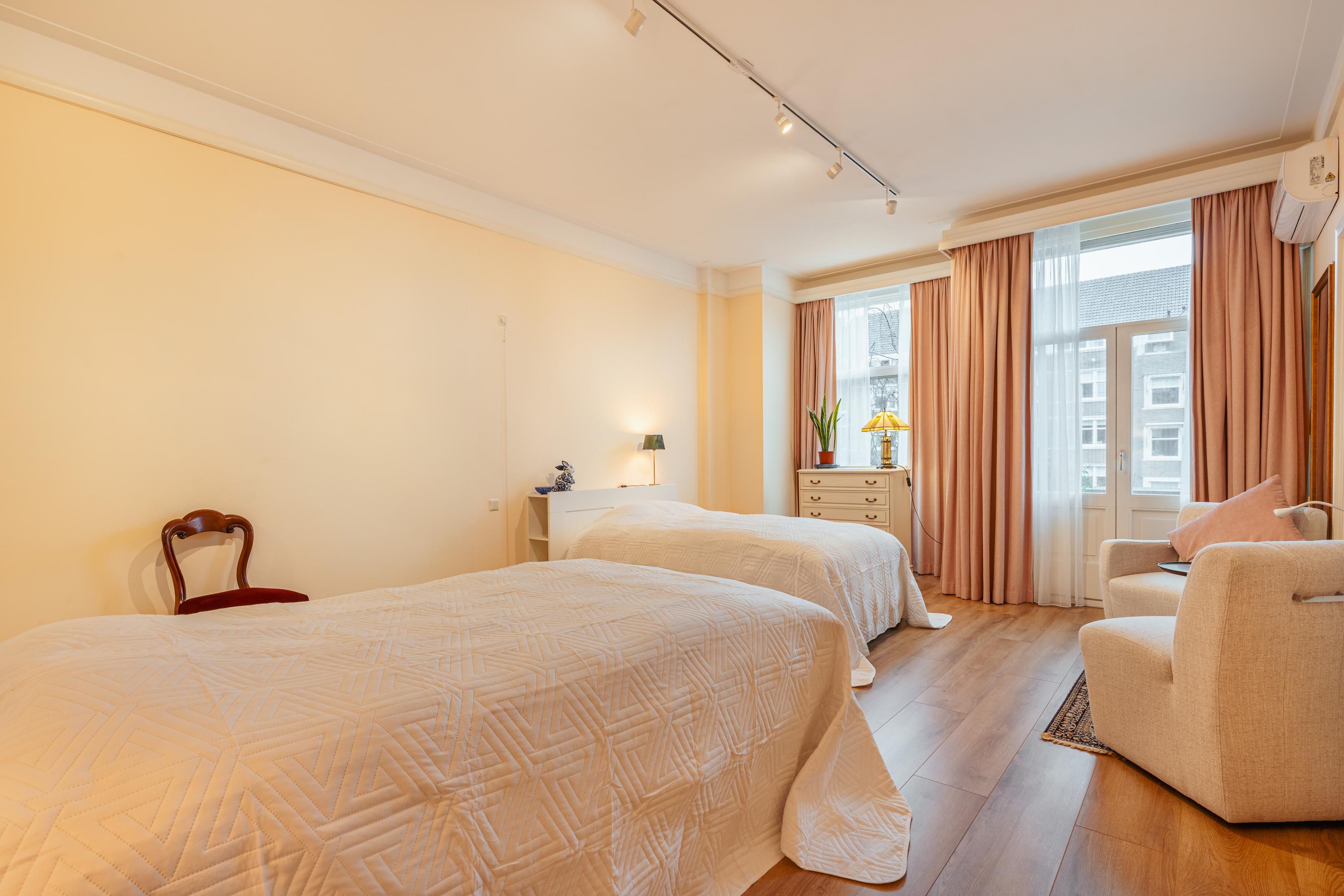 Das Apartment Amsterdam Zuid verkörpert eine harmonische Balance zwischen urbaner Lebendigkeit und entspanntem Wohnen am Wasser. Diese 120 m² große Eckwohnung befindet sich in den ruhigen Vierteln Stadion und Beethoven und bietet Ausblicke auf das Wasser und die Minervalaan. Großzügige Fensterfl ächen erfüllen die Räume mit Tageslicht und unterstreichen die großzügige Aufteilung. Das Apartment verfügt über ein helles Wohn- und Esszimmer mit Zugang zum Balkon, zwei Schlafzimmer, eine gut ausgestattete Küche mit Arbeitsplatte aus Holz sowie ein hochwertig ausgestattetes Badezimmer mit begehbarer Dusche und Doppelwaschbecken. Zeitgemäßer Komfort wird durch Annehmlichkeiten wie Aufzug, Doppelverglasung und Fernwärme gewährleistet, während ein privater Abstellraum von ca. 10 m² im vierten Stock zusätzlichen Stauraum bietet.