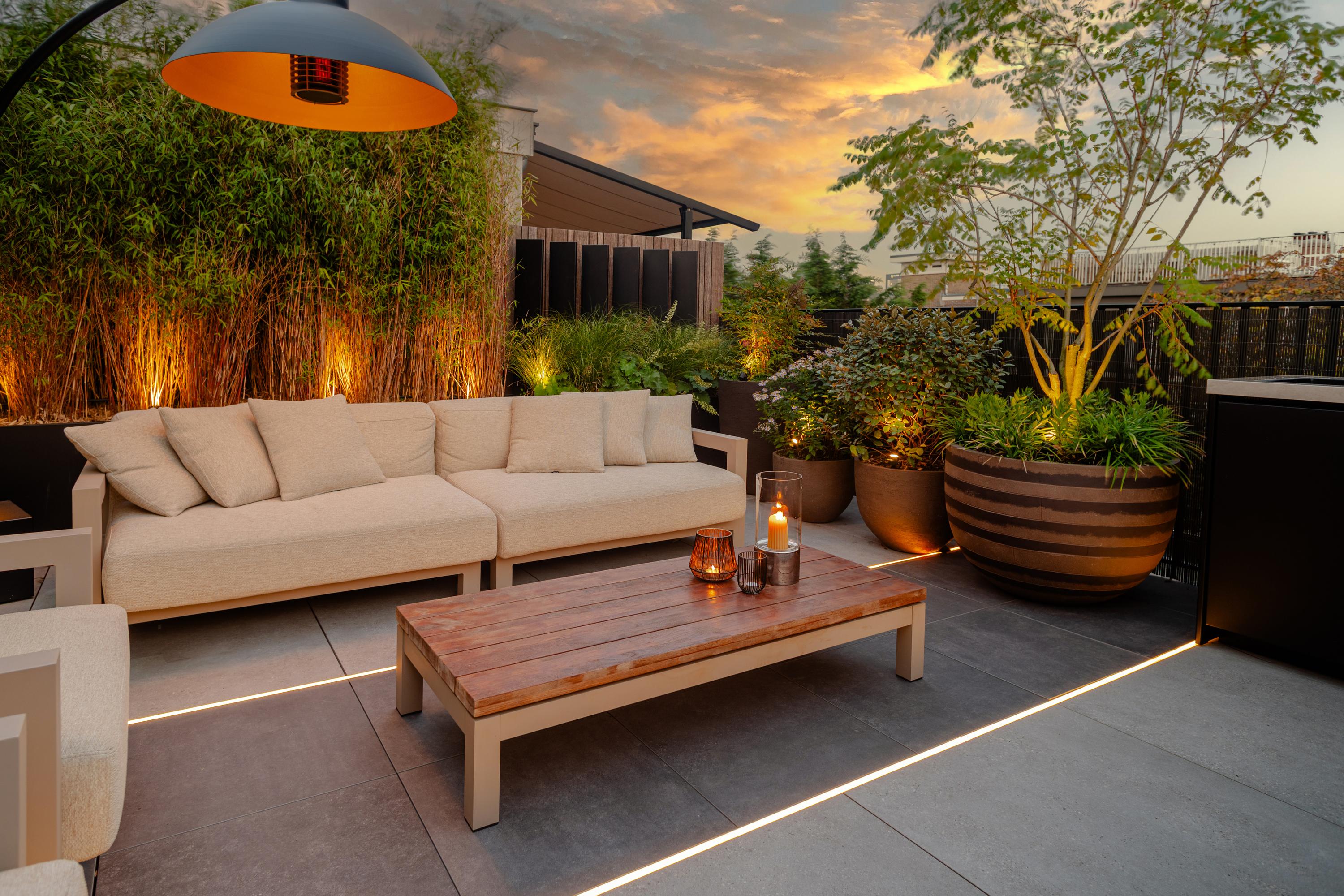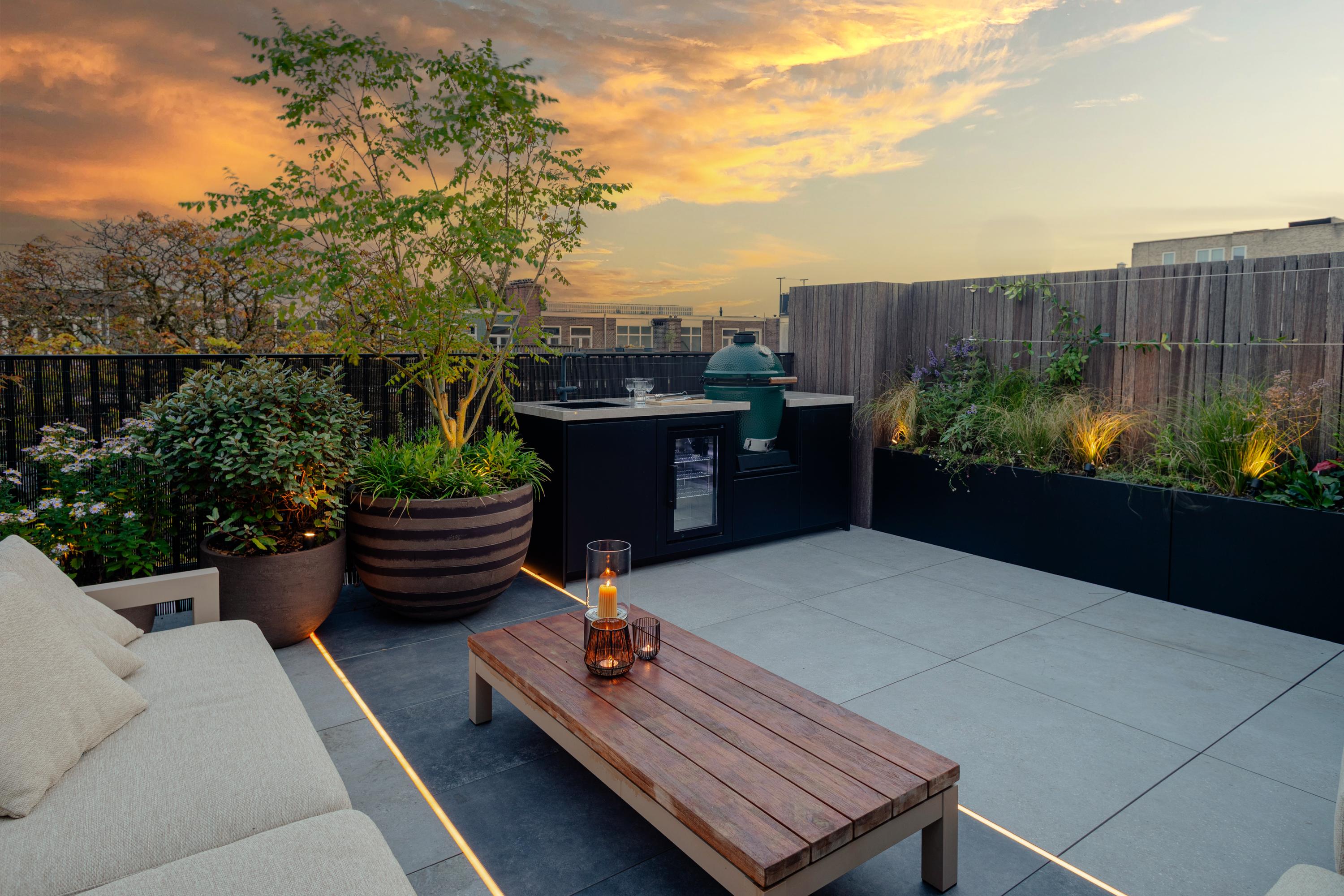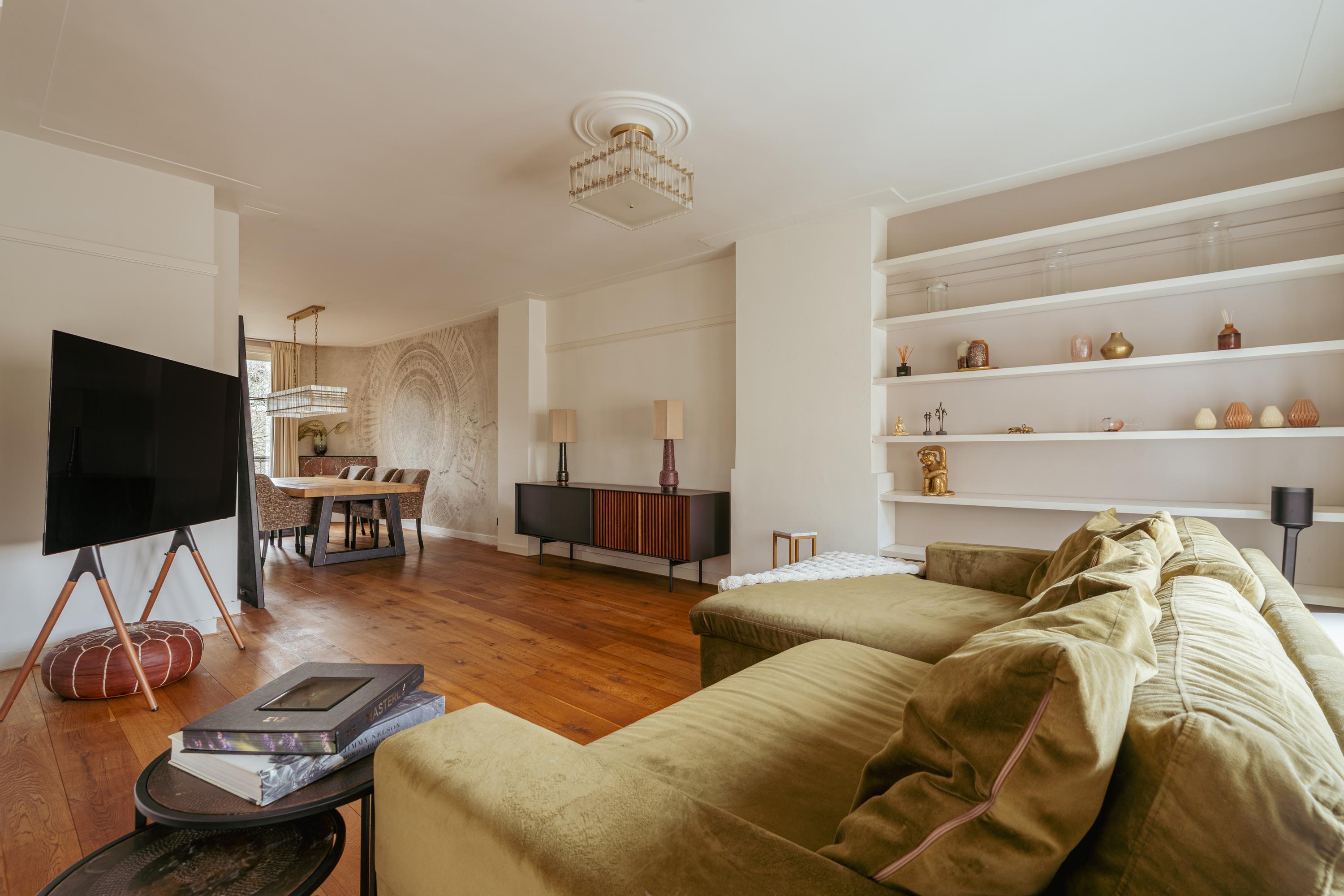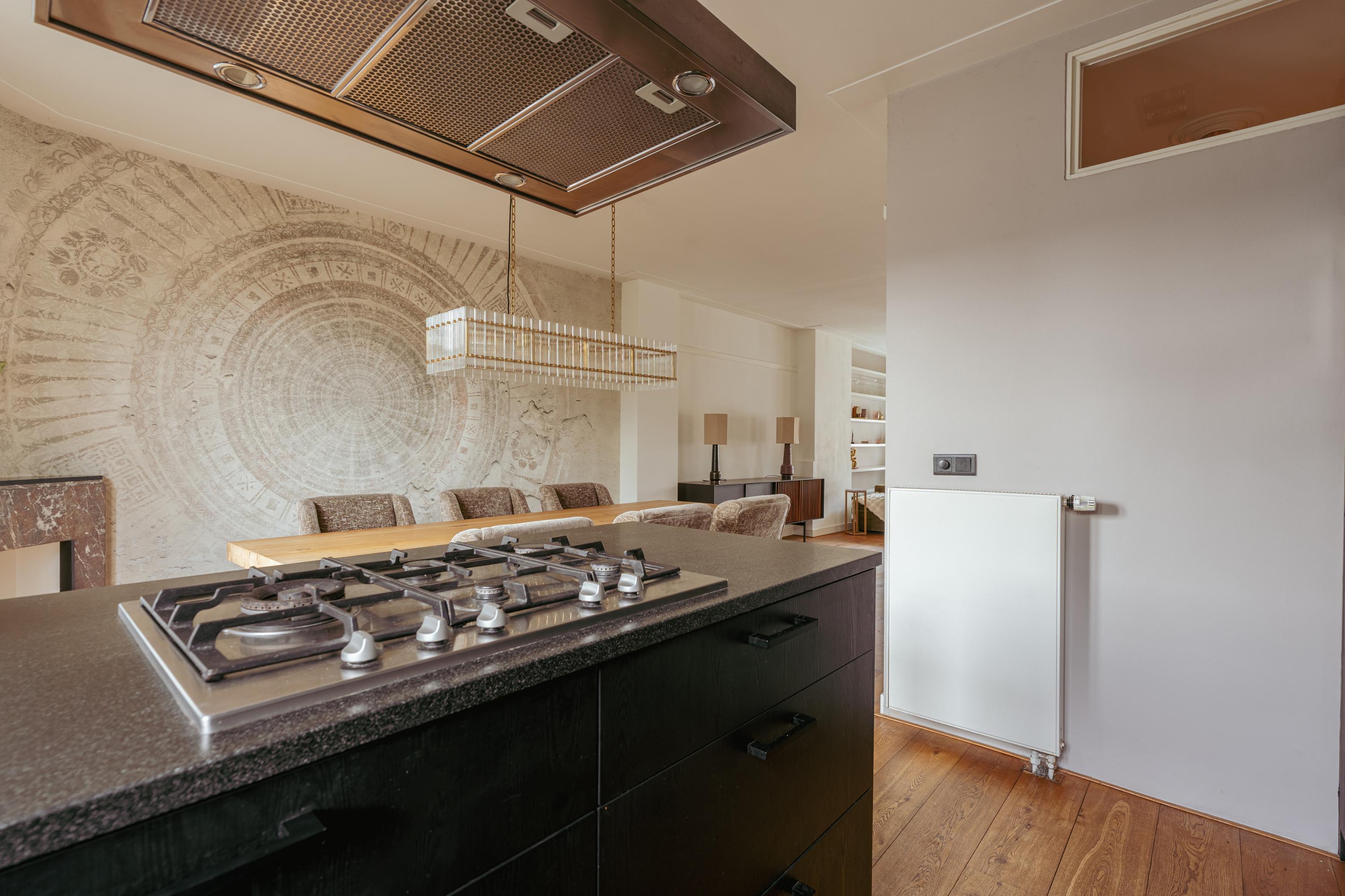 Im ruhigen rückwärtigen Bereich ist die offene Wohnküche mit Kochinsel, integrierten Siemens-Geräten und viel Tageslicht durch französische Türen zum zweiten Balkon ausgestattet. Zwei Schlafzimmer bieten Flexibilität für Erholung, Arbeit oder das Familienleben. Die Hauptsuite verfügt über ein Ankleidezimmer sowie direkten Zugang zur großzügigen, mit viel Sorgfalt gestalteten Dachterrasse von 33 m², entworfen von Erik van Gelder. Integrierte Beleuchtung, Bewässerung, eine Außenküche und ein Green Egg Barbecue schaffen einen einzigartigen Rückzugsort für gesellige Stunden im Freien über den Dächern der Stadt.