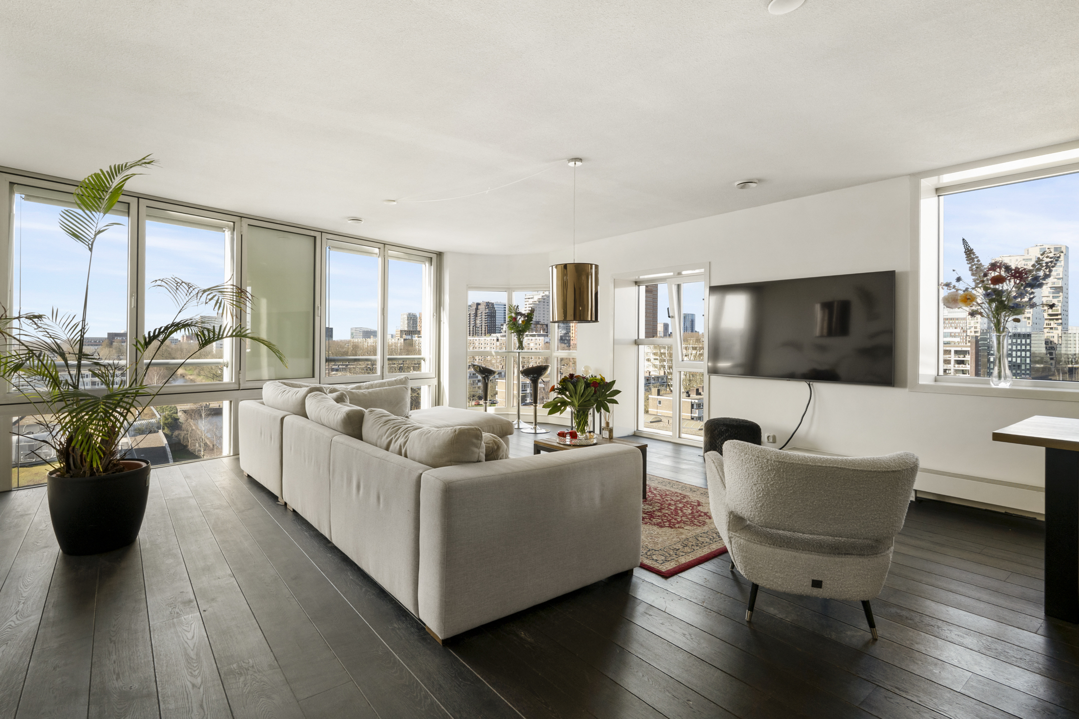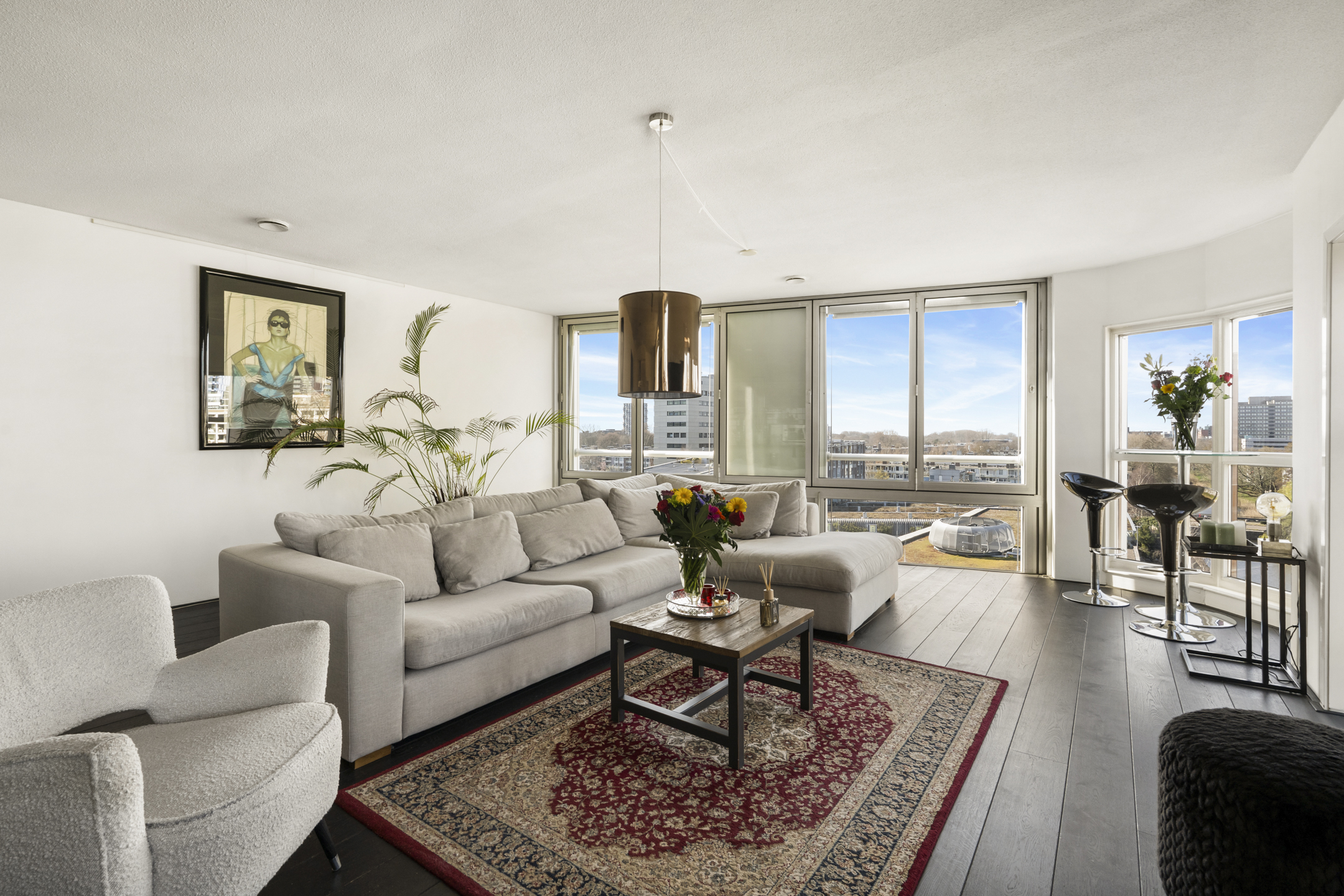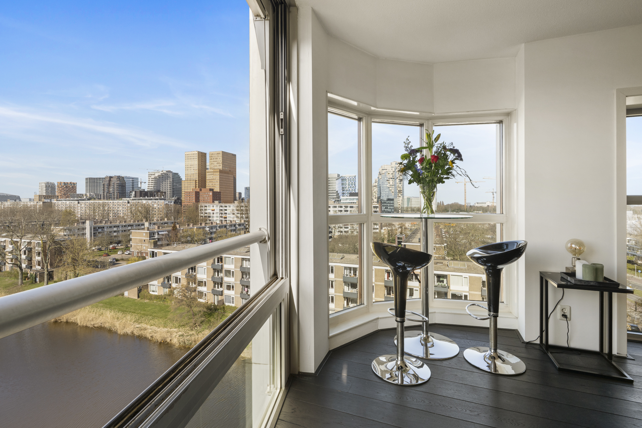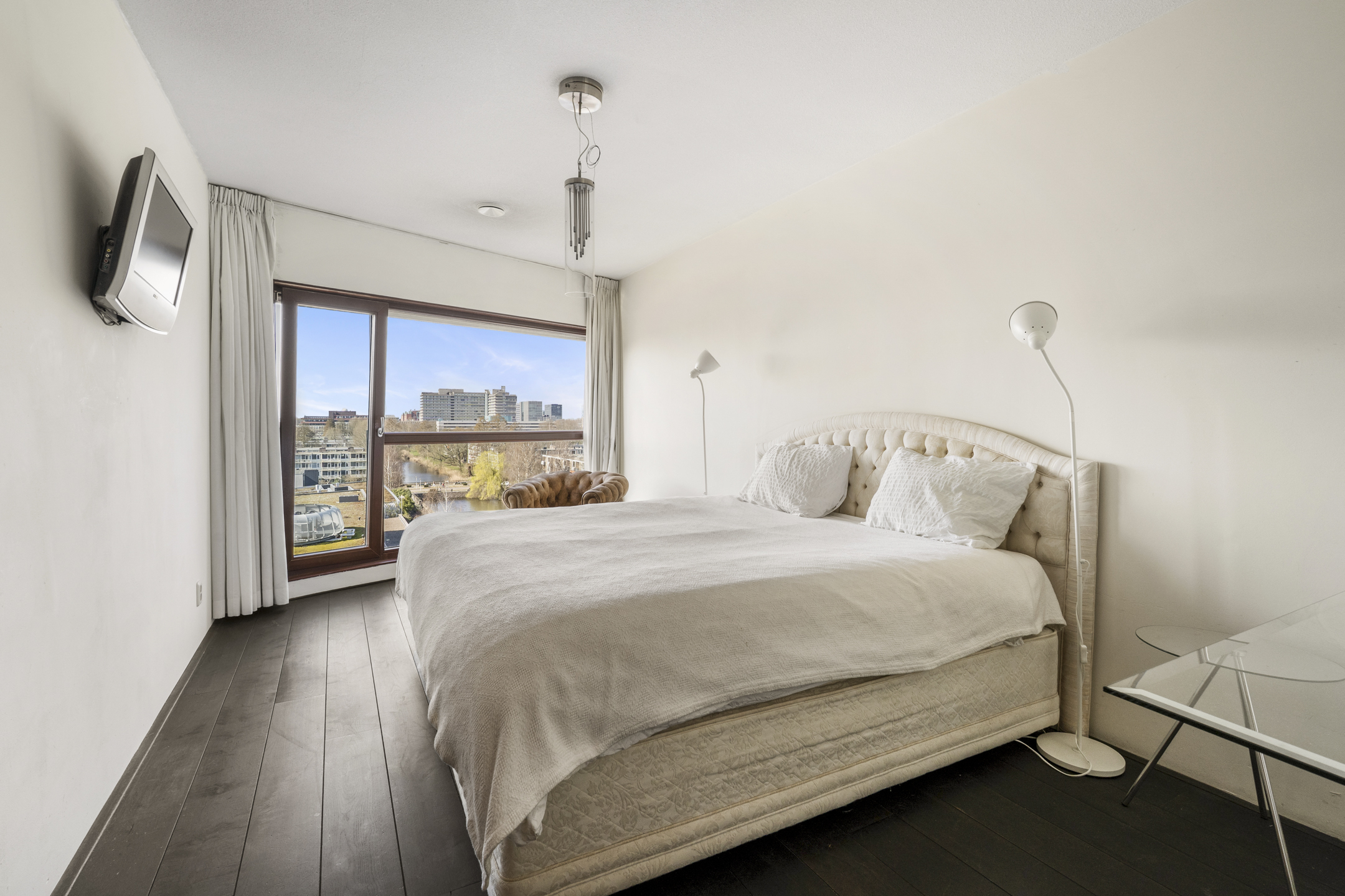 Das Apartment in Amsterdam im siebten Stock des Gelderhof-Komplexes bietet auf 117 m² Wohnfläche ein elegantes Wohnambiente sowie einen Panoramablick über das Wasser und die Skyline des Zuidas. Diese Eckwohnung ist für maximales Tageslicht konzipiert und verfügt über raumhohe Fenster zur Südwest- und Nordseite, die den Blick auf Stadt und Wasser eindrucksvoll einrahmen. Die Immobilie verfügt über zwei großzügige Schlafzimmer, die derzeit als Hauptsuite mit begehbarem Kleiderschrank eingerichtet sind, einen lichtdurchfluteten Wohnbereich mit Glaswänden und öffnender Fassadenfront sowie eine erstklassige Küche mit Kochinsel, massivem Eichenparkett und hochwertigen Einbaugeräten, alles stilvoll und durchdacht umgesetzt.
