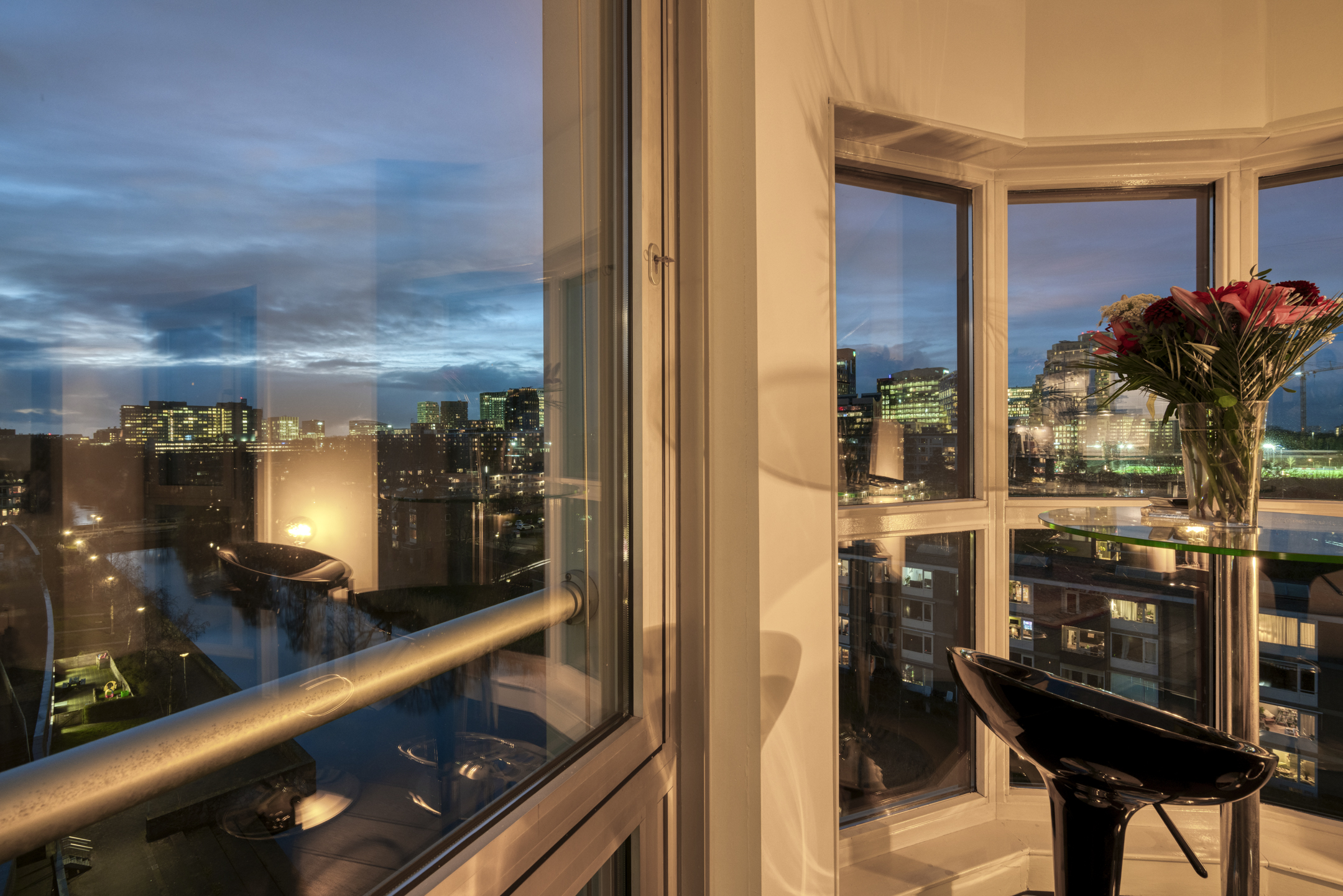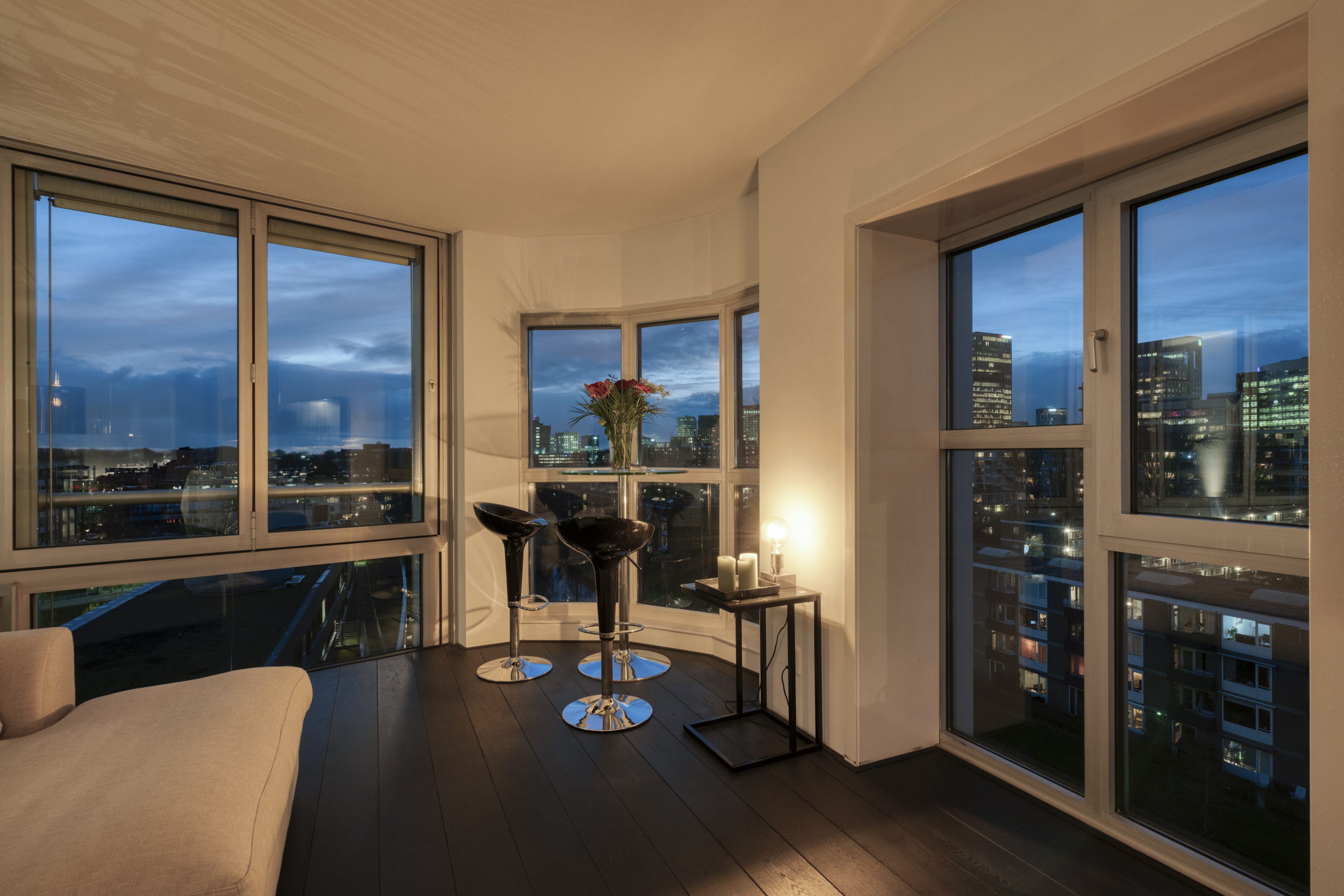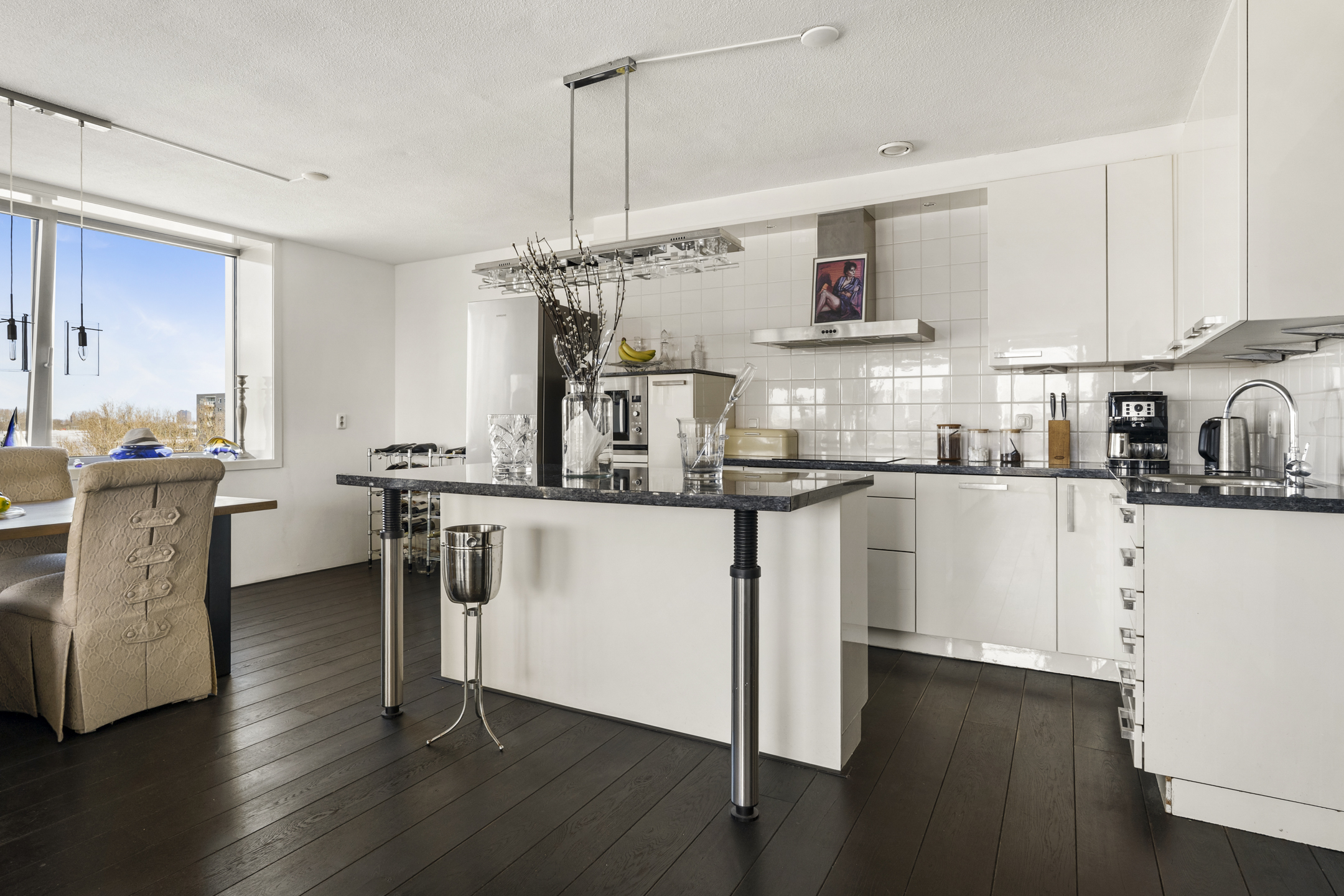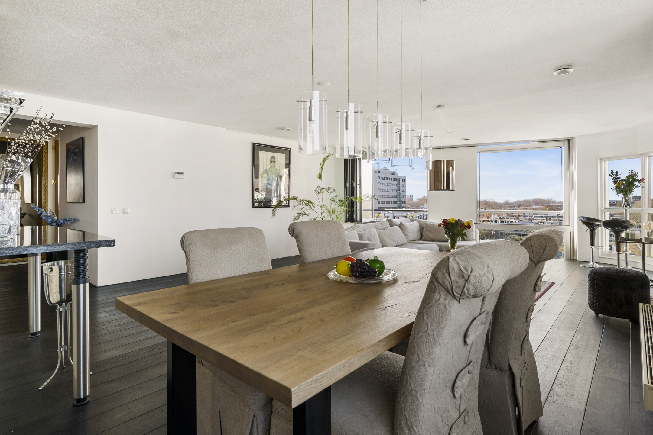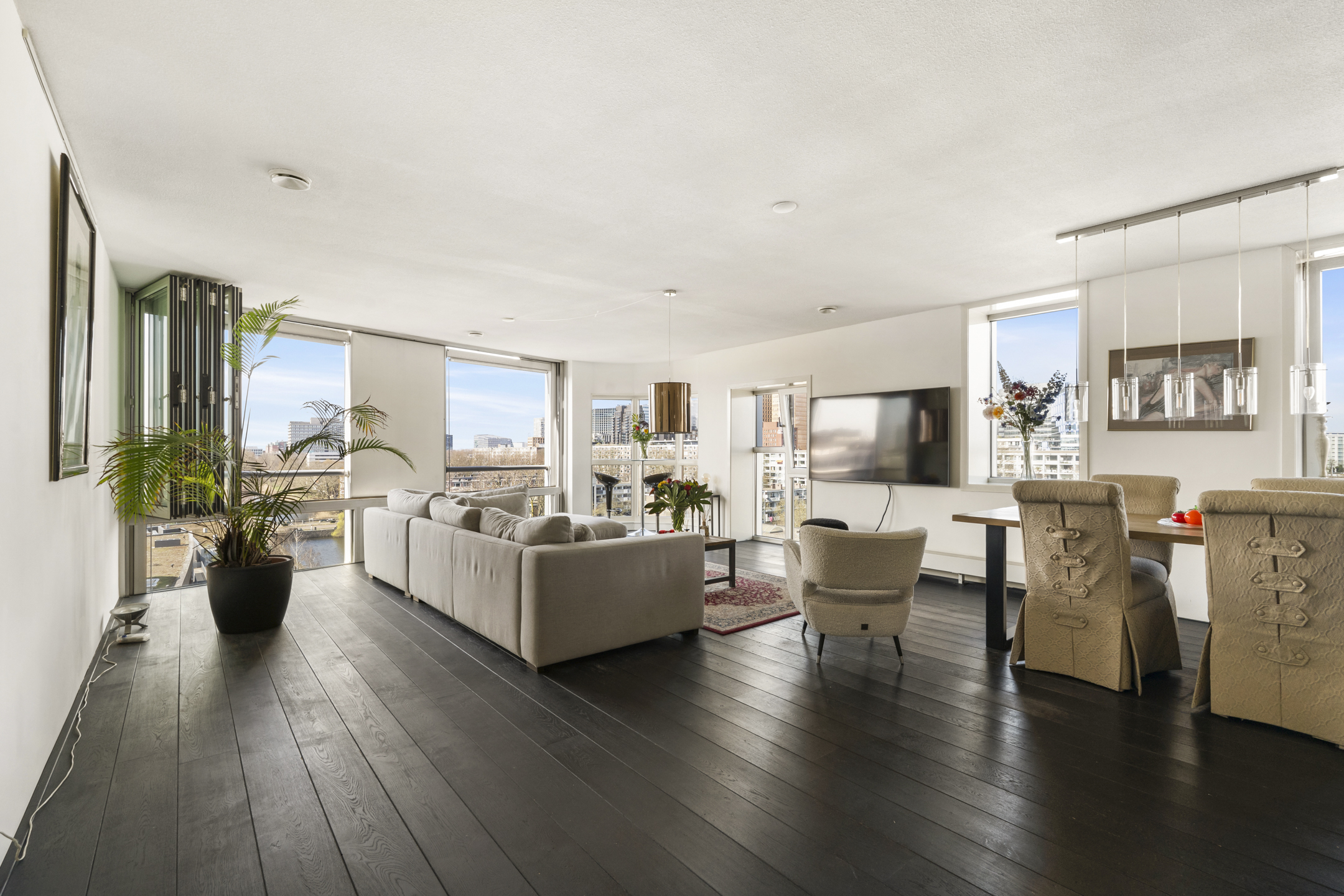 Das Apartment in Amsterdam im siebten Stock des Gelderhof-Komplexes bietet auf 117 m² Wohnfläche ein elegantes Wohnambiente sowie einen Panoramablick über das Wasser und die Skyline des Zuidas. Diese Eckwohnung ist für maximales Tageslicht konzipiert und verfügt über raumhohe Fenster zur Südwest- und Nordseite, die den Blick auf Stadt und Wasser eindrucksvoll einrahmen. Die Immobilie verfügt über zwei großzügige Schlafzimmer, die derzeit als Hauptsuite mit begehbarem Kleiderschrank eingerichtet sind, einen lichtdurchfluteten Wohnbereich mit Glaswänden und öffnender Fassadenfront sowie eine erstklassige Küche mit Kochinsel, massivem Eichenparkett und hochwertigen Einbaugeräten, alles stilvoll und durchdacht umgesetzt.