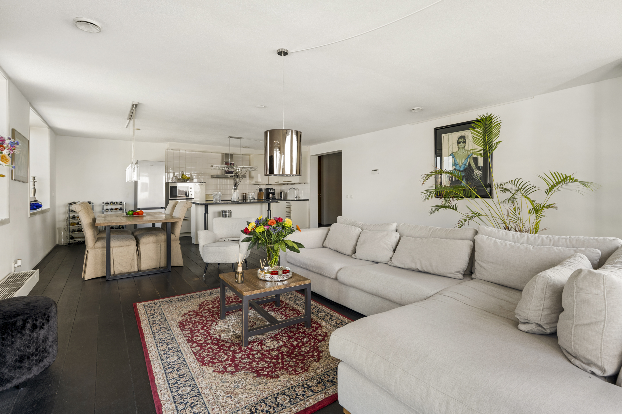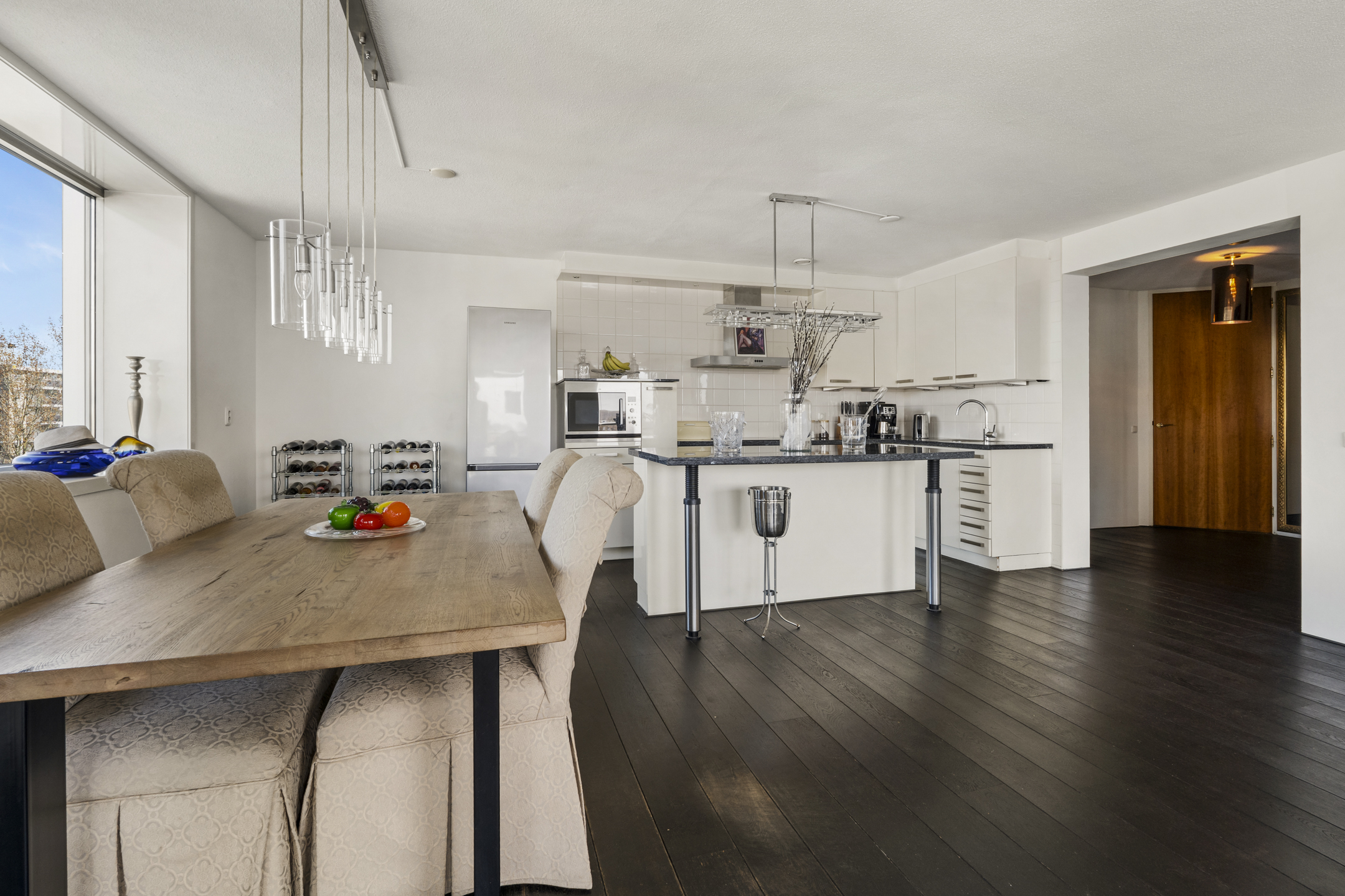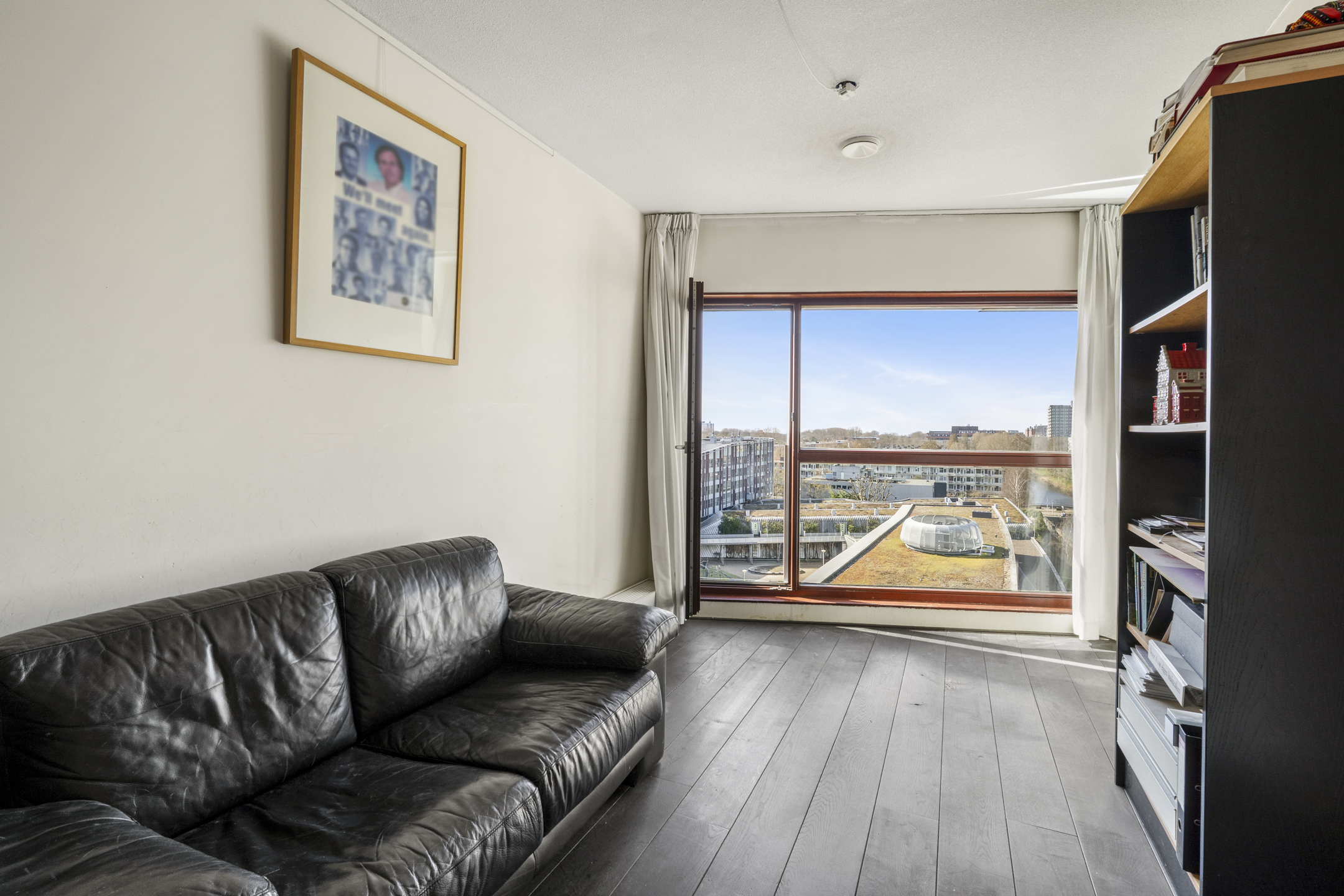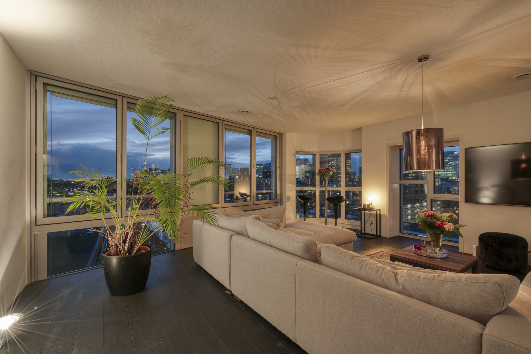 Das Apartment in Amsterdam im siebten Stock des Gelderhof-Komplexes bietet auf 117 m² Wohnfläche ein elegantes Wohnambiente sowie einen Panoramablick über das Wasser und die Skyline des Zuidas. Diese Eckwohnung ist für maximales Tageslicht konzipiert und verfügt über raumhohe Fenster zur Südwest- und Nordseite, die den Blick auf Stadt und Wasser eindrucksvoll einrahmen. Die Immobilie verfügt über zwei großzügige Schlafzimmer, die derzeit als Hauptsuite mit begehbarem Kleiderschrank eingerichtet sind, einen lichtdurchfluteten Wohnbereich mit Glaswänden und öffnender Fassadenfront sowie eine erstklassige Küche mit Kochinsel, massivem Eichenparkett und hochwertigen Einbaugeräten, alles stilvoll und durchdacht umgesetzt.