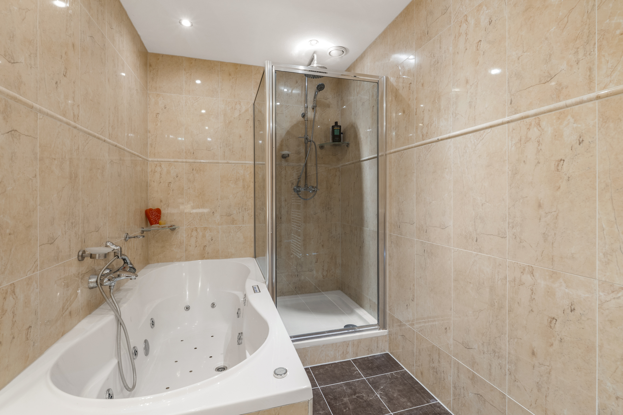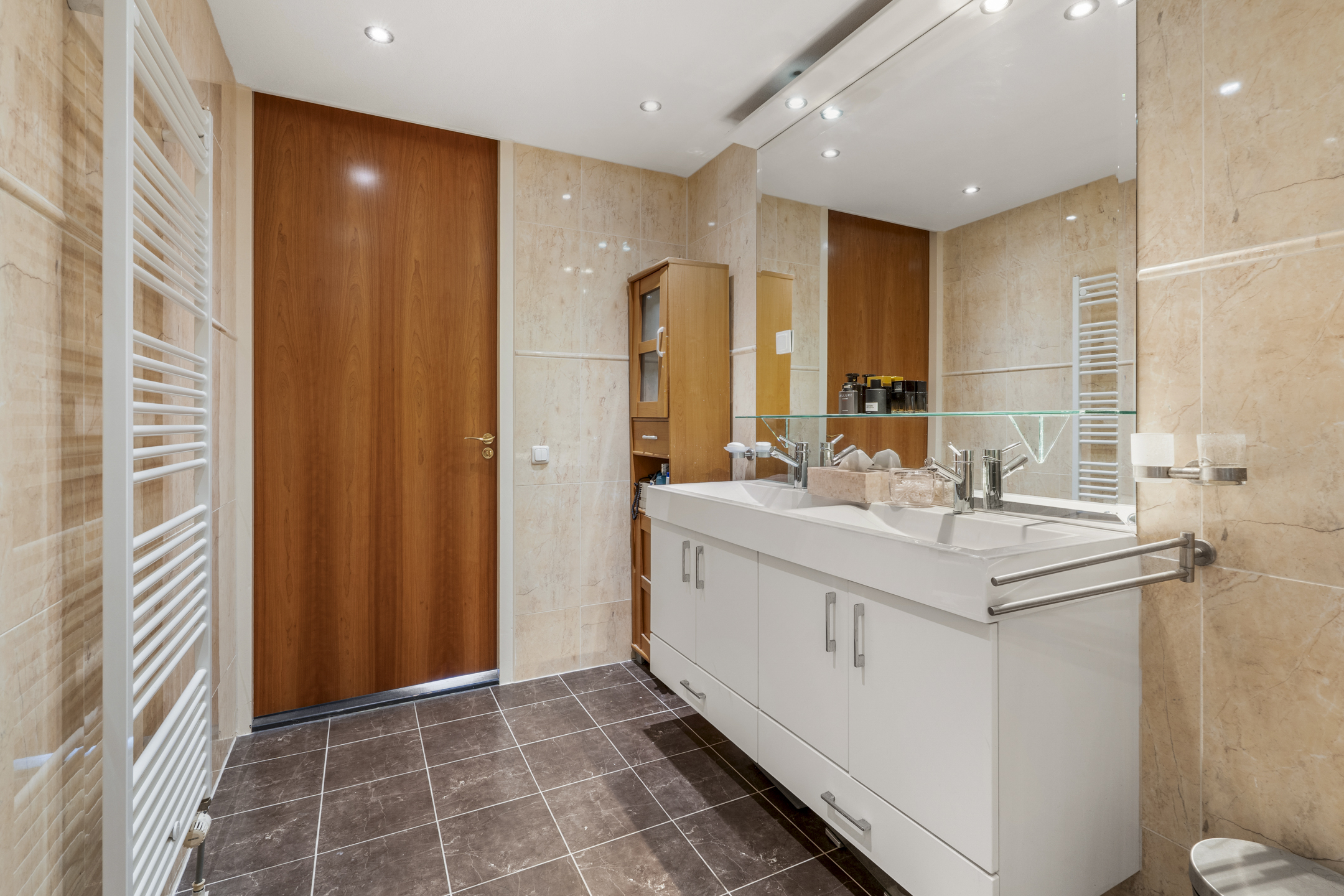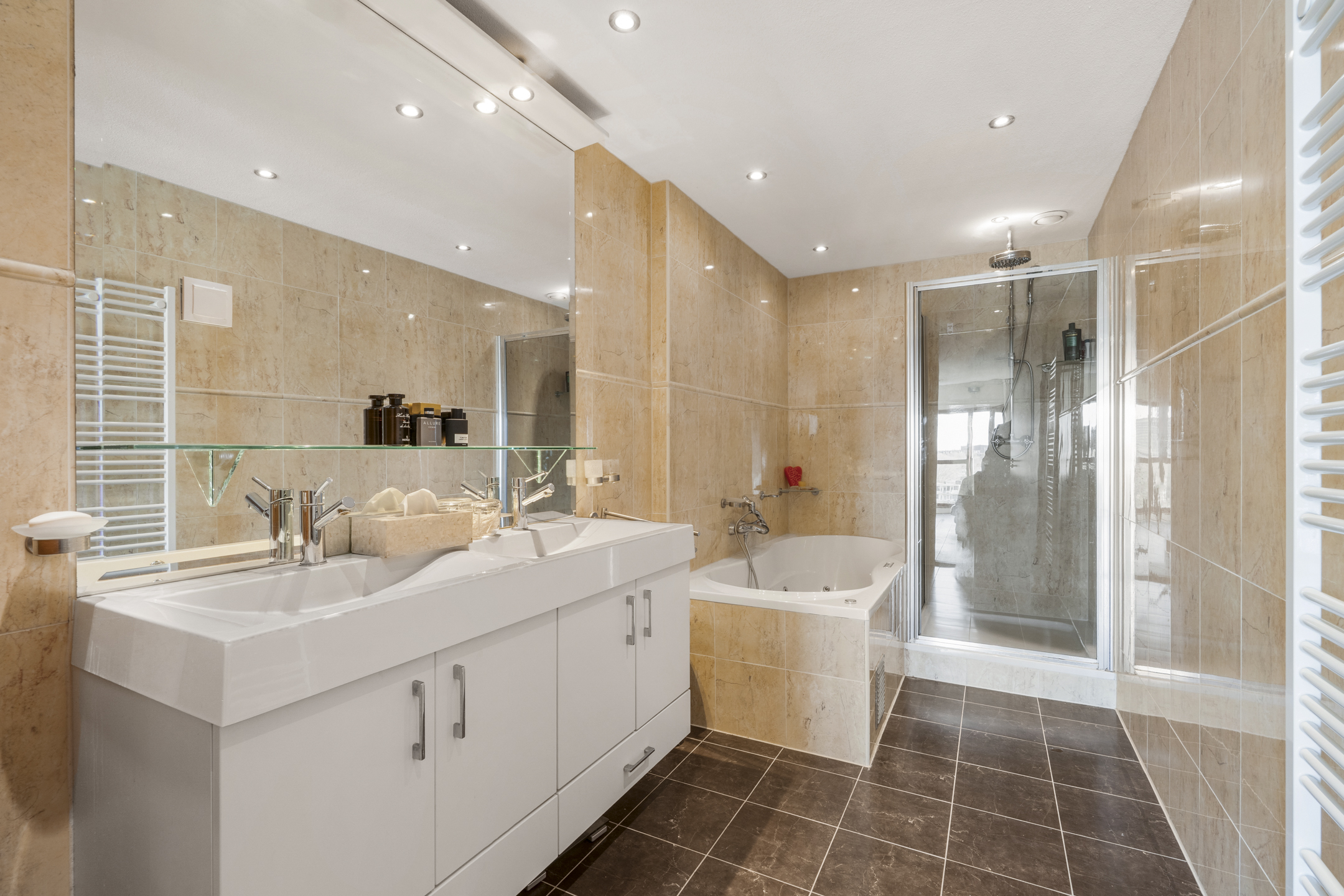Das Badezimmer ist mit hellen Materialien ausgestattet und umfasst einen Doppelwaschtisch, eine Regendusche sowie eine Whirlpool-Badewanne. Elektrische Sonnenschutzrollos an den Hauptfenstern sorgen an sonnigen Tagen für angenehmen Komfort. Zur Wohnung gehört ein privater Abstellraum, eine gemeinschaftliche Fahrradgarage und ein optionaler Stellplatz in der gesicherten Tiefgarage, der für 59.000 € verfügbar ist. Das 2004 fertiggestellte Gebäude wird professionell verwaltet und bietet Aufzugszugang sowie ein Fitnessstudio im Erdgeschoss.