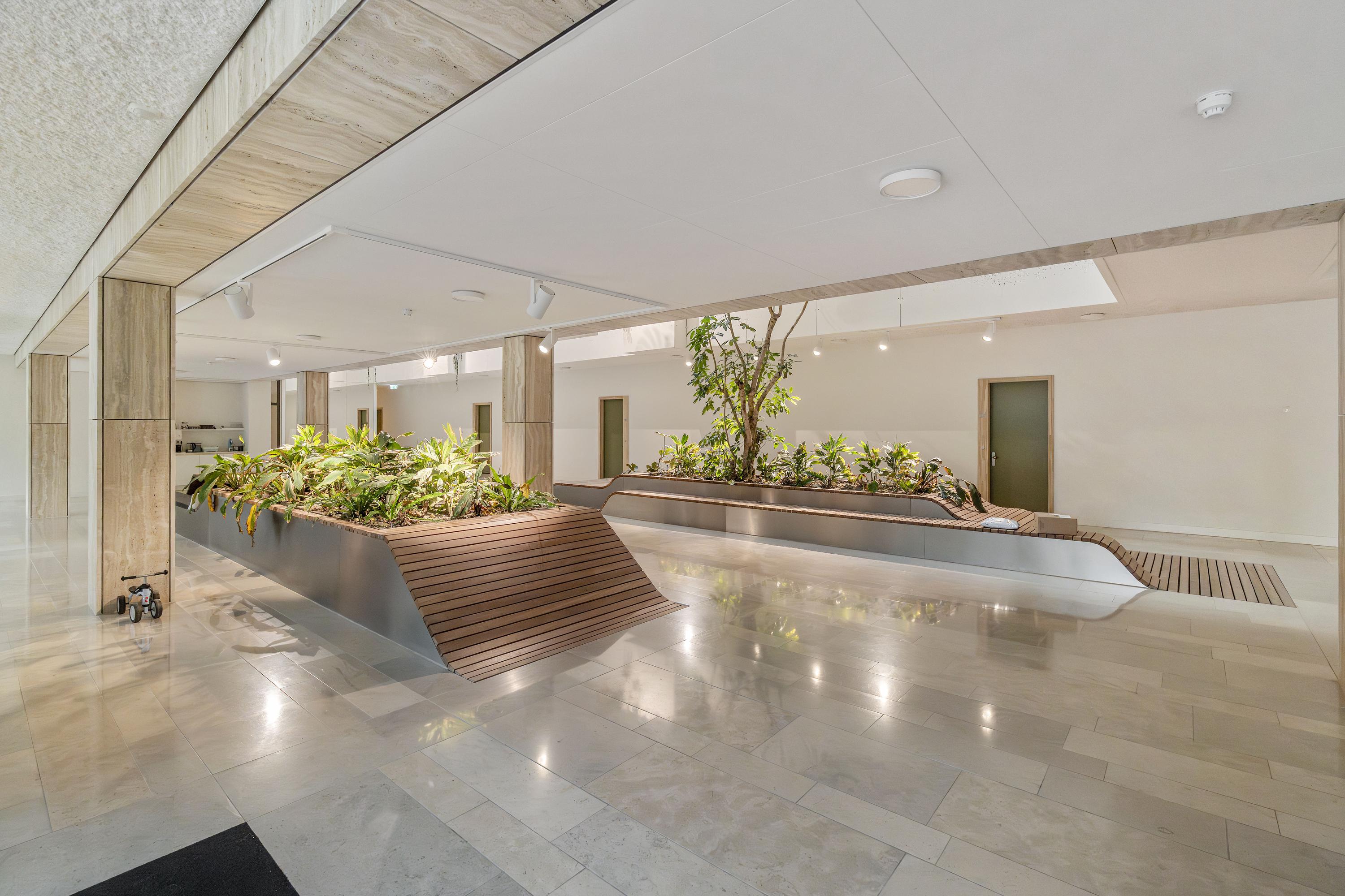 What makes The Cube unique is its hotel-suite concept: the entrance and impressive atrium have been designed as a warm, light-filled meeting space with abundant greenery, natural materials, and seating areas. Here, the outdoors and indoors blend seamlessly. The façades are clad in Portuguese travertine, and the roofs are fitted with solar panels and green vegetation.