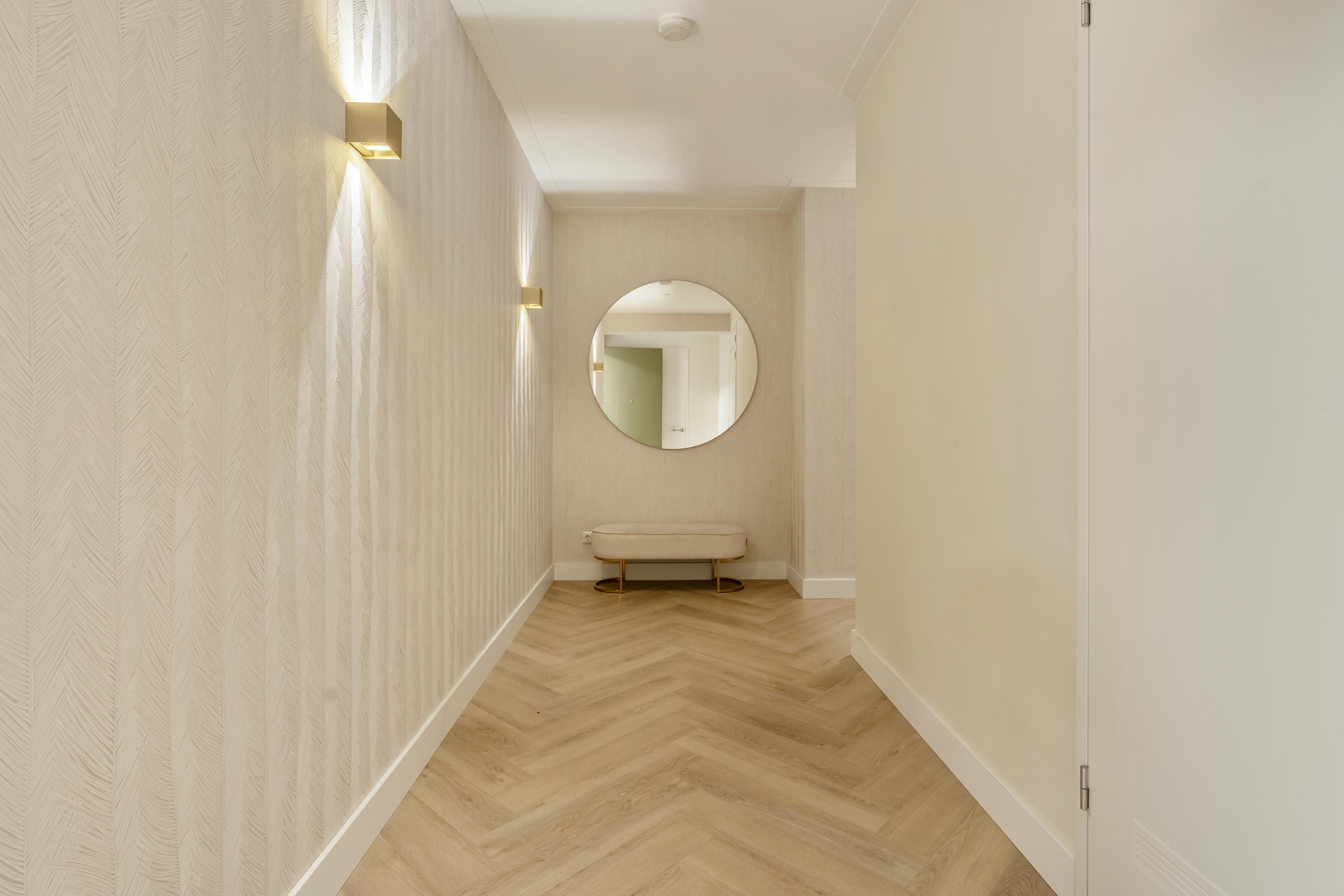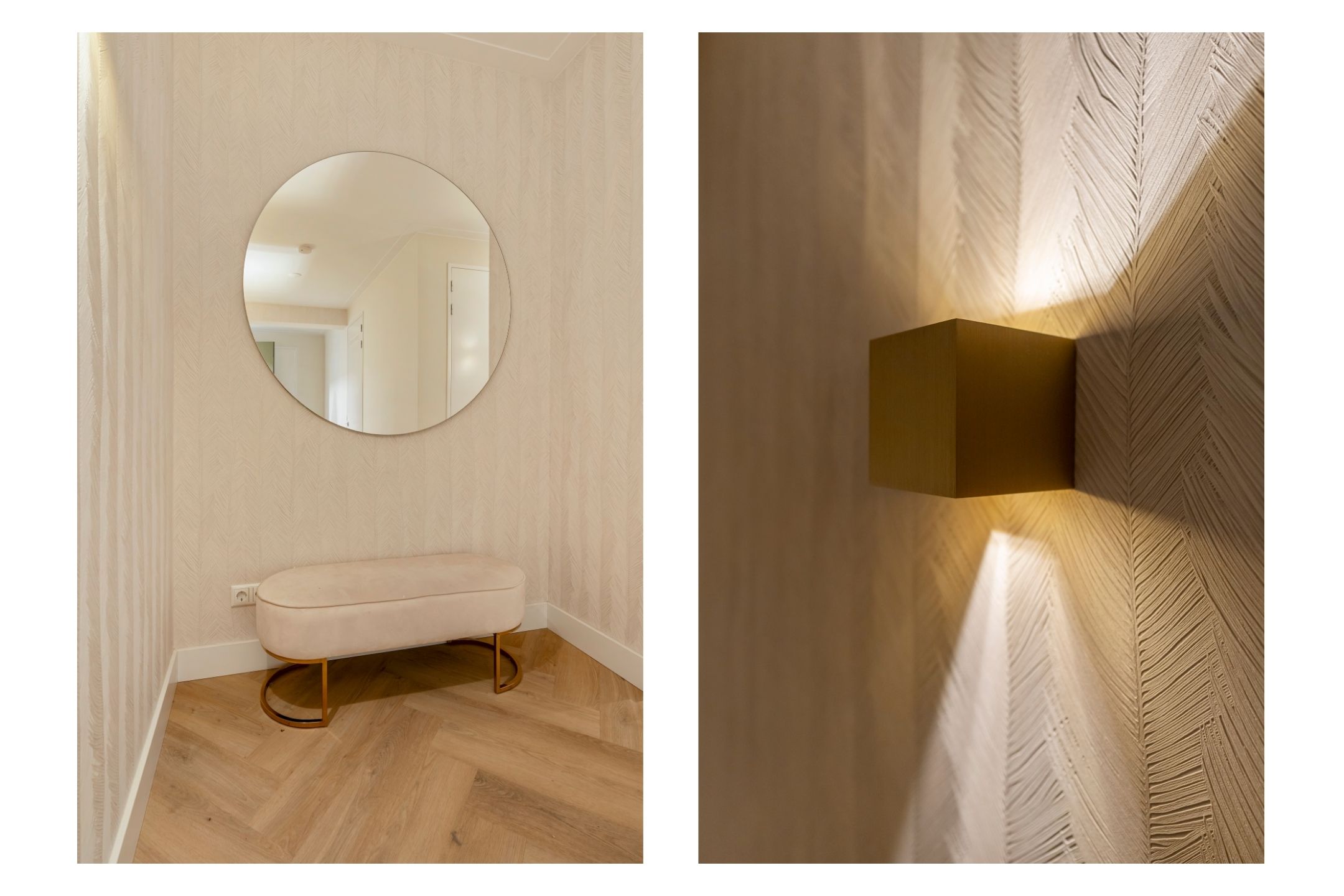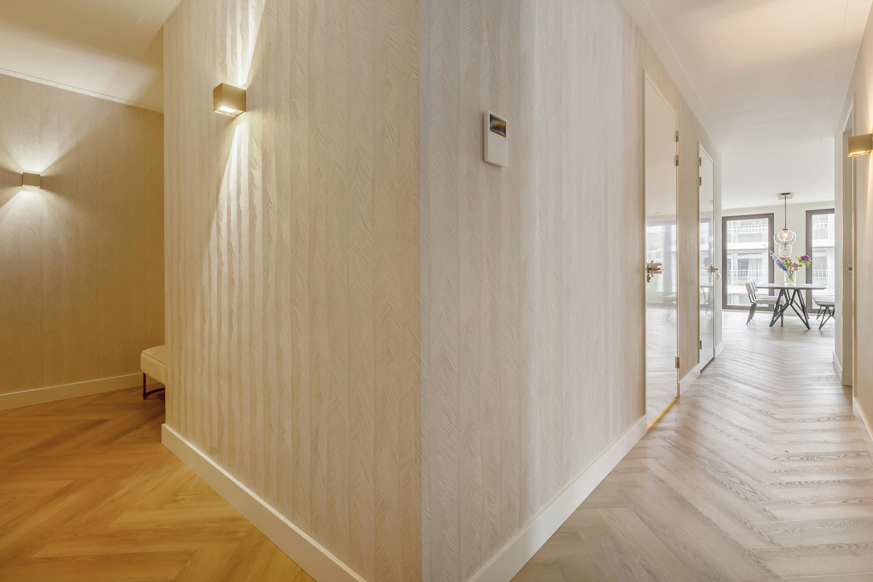Upon entering the spacious hallway, the refined finish immediately stands out: a light herringbone floor, soft tones, and subtle wall lighting create a calm and modern atmosphere. The hallway provides access to all rooms and includes a large storage room, a separate laundry area with connections for a washing machine and dryer, and a separate toilet with wash basin.