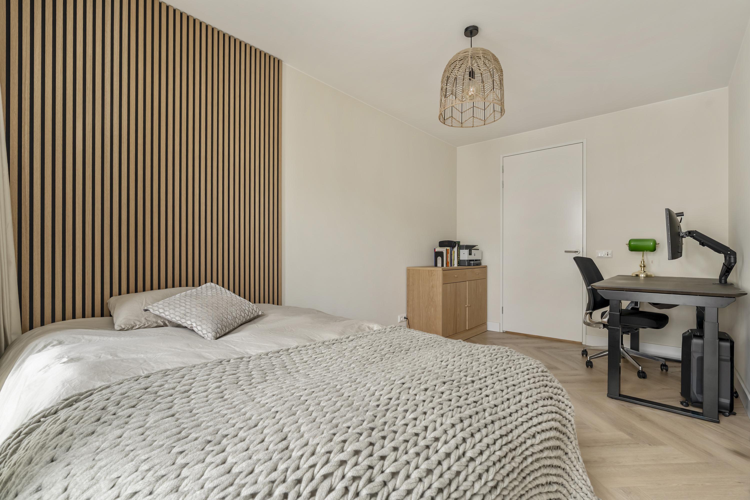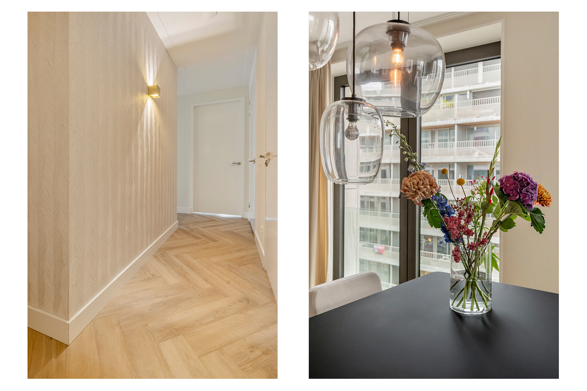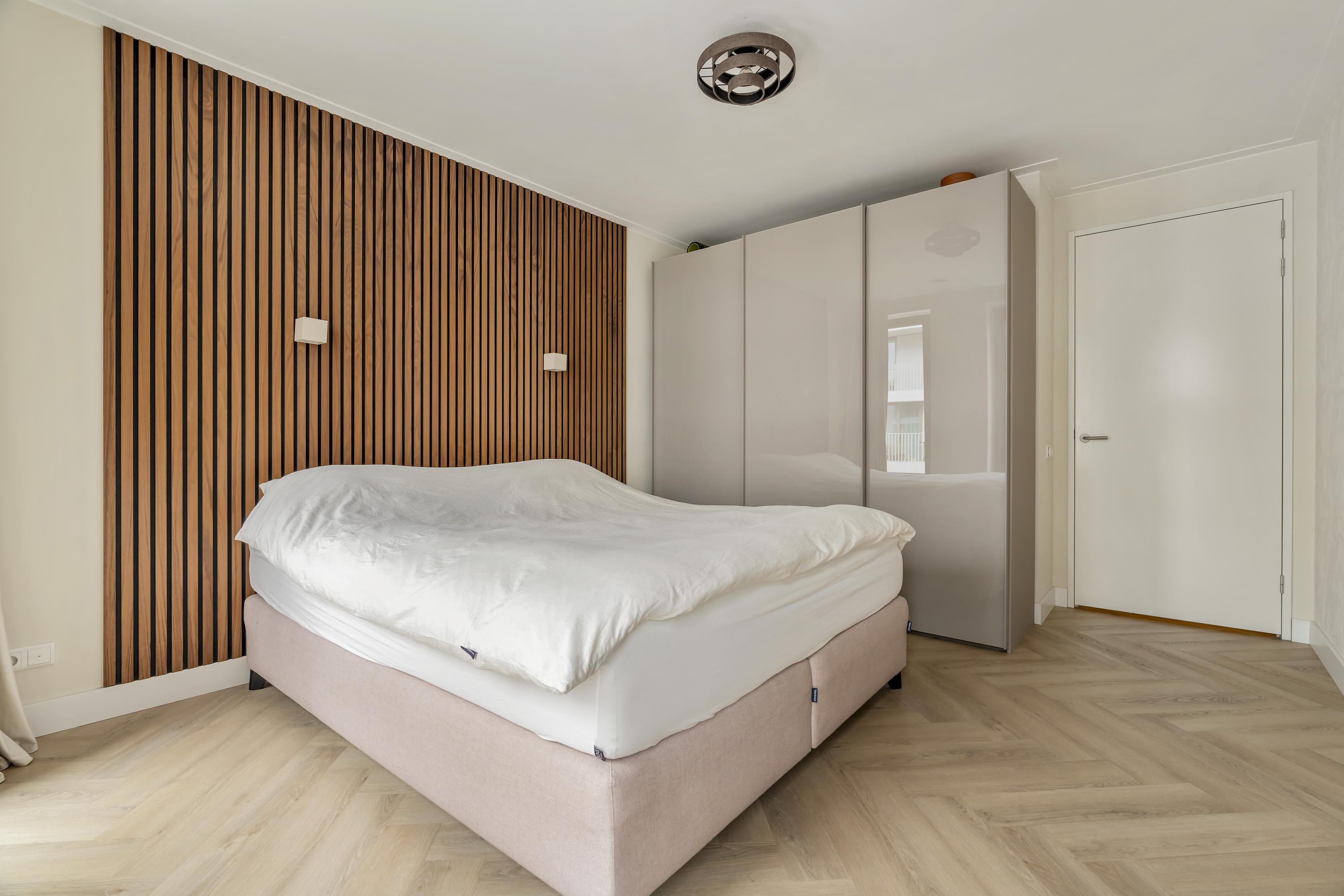 The kitchen is finished in a matte black design and fitted with all modern built-in appliances, including an induction hob, combi oven, dishwasher, and Quooker. There is ample storage space throughout. From the living room, you have access to the spacious southwest-facing balcony, where you can enjoy the afternoon and evening sun and a beautiful view over the green square below.