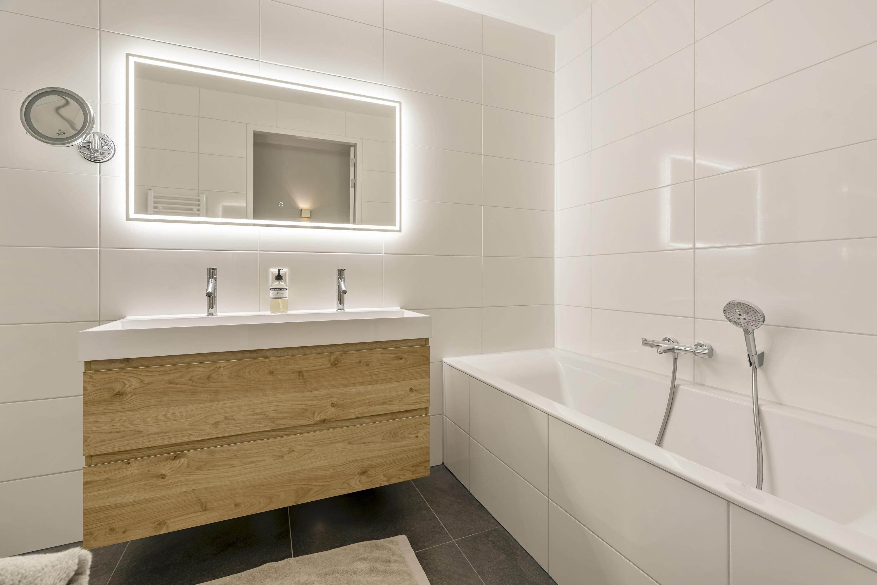 The bathroom is modern and comfortable, equipped with a walk-in shower, bathtub, double washbasin unit, and a large mirror with integrated lighting and heating. At the end of the hallway is the bright living room, surrounded by large windows — a welcoming space with lovely views of the surrounding area and greenery. The living room and open kitchen flow seamlessly together, creating a pleasant and open layout.