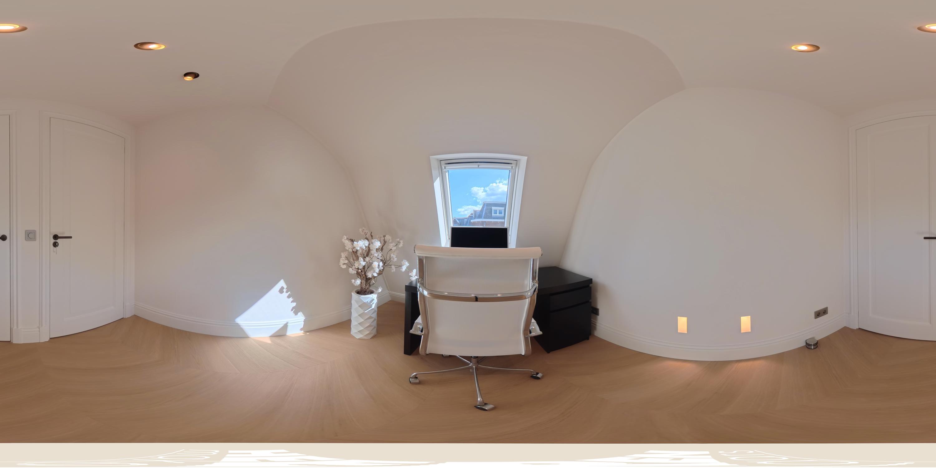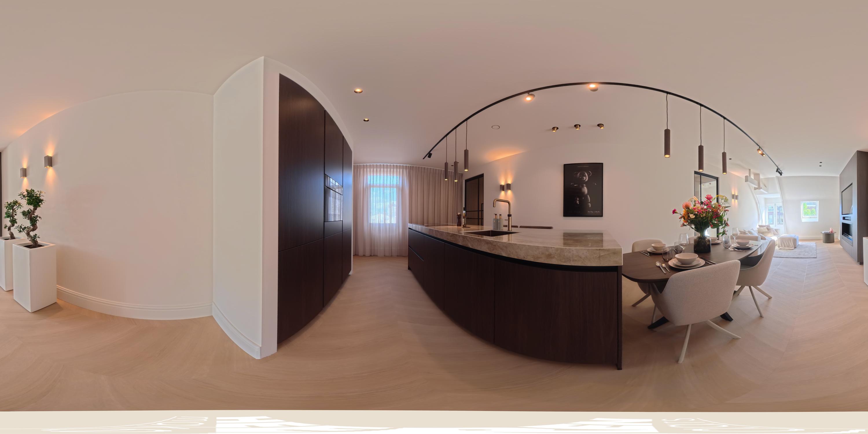 On the top floor, you enter through a sleek integrated sliding door into a beautiful, spacious hallway that provides access to all rooms. The heart of the home is the open-plan living and dining area, which spans the entire length of the apartment. With windows on both sides, the space is flooded with natural light. At the front is the sitting area, complete with a cozy bio-ethanol fireplace stylishly integrated into a built-in cabinet with TV. At the rear lies the modern open kitchen with a cooking island. Finished with a Dekton countertop, the kitchen is equipped with every luxury appliance imaginable, including a wine cooler, Quooker tap, dishwasher, fridge/freezer, Miele combi-oven, and a Miele induction hob with integrated extraction system. The bar section of the island also makes this a sociable spot to cook together or enjoy a glass of wine with family and friends.
