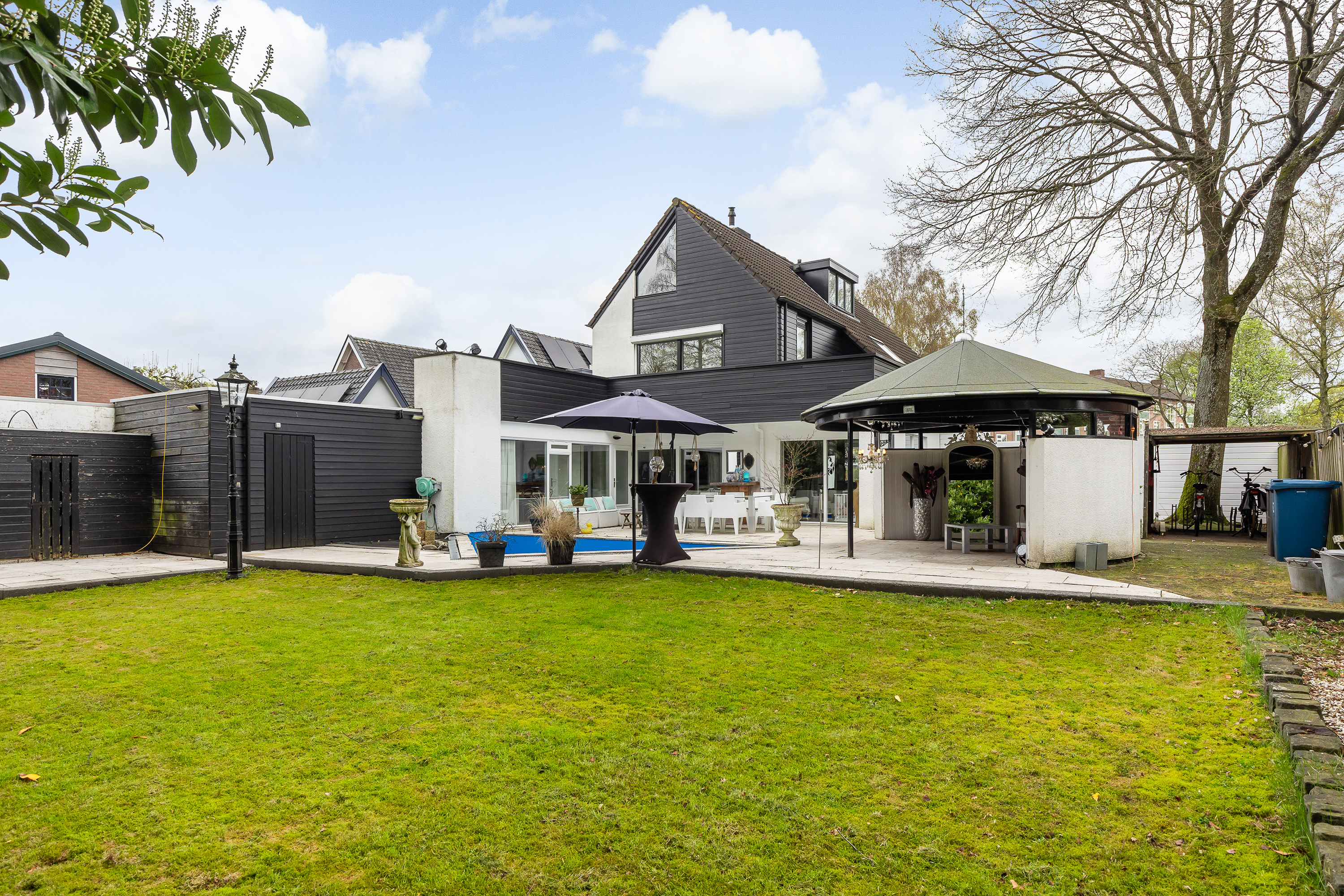 Die Villa Apeldoorn verbindet moderne Architektur mit ruhigem Wohnen in einer etablierten, von Bäumen gesäumten Nachbarschaft. Dieses freistehende Haus bietet 230 m² Wohnfläche über drei Ebenen und integriert nahtlos sechs Schlafzimmer und zwei Bäder für das Familienleben sowie diskretes Arbeiten von zu Hause. Das durchdachte Design aus dem Jahr 1987 spiegelt das Zuhause des Architekten wider und zeigt sich im fließenden T-förmigen Wohnbereich sowie der lichtdurchfluteten Wohnküche mit Fußbodenheizung und Einbaugeräten. Überall sorgen Schiebetüren und maßgefertigte Verglasungen für Tageslicht und schaffen zugleich Verbindung zum südlich ausgerichteten Garten.