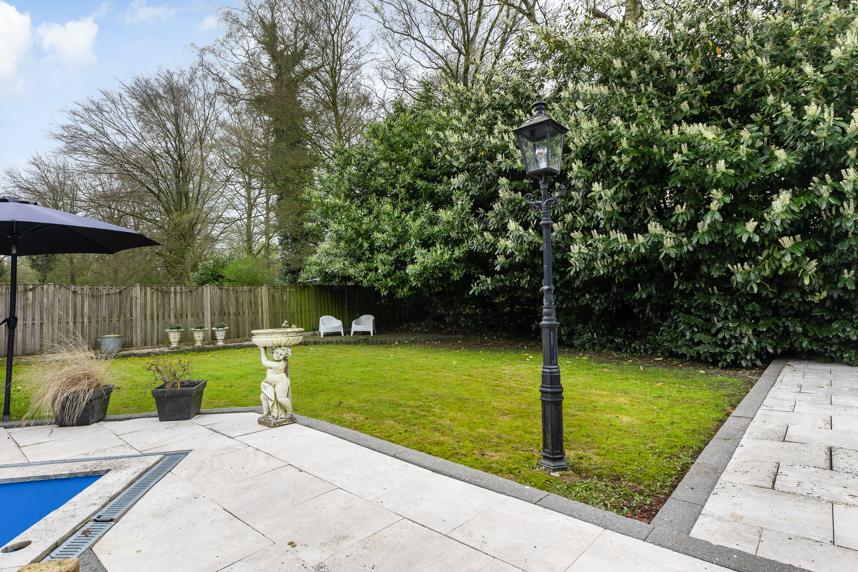 Der Garten ist ein privater Rückzugsort, eingerahmt von gemeinschaftlichem Grün und einem ruhigen Teich. Eine großzügige Terrasse führt zu einem überdachten Pavillon und einer Lounge, einem fantasievoll geformten, drachenartigen Swimmingpool und einem eigenen Grillbereich. Die pflegeleichte Bepflanzung sorgt für Komfort, ohne das Outdoor-Erlebnis einzuschränken. Mehrere Zufahrten bieten Platz für bis zu sechs Fahrzeuge, darunter eine Doppelgarage mit Zugang über die rechte Einfahrt und einem separaten Eingang sowie Fahrradschuppen für praktische Abläufe. Zu den jüngsten Modernisierungen zählen frische Außenanstriche und neue Dächer für Pavillon und Schuppen.
