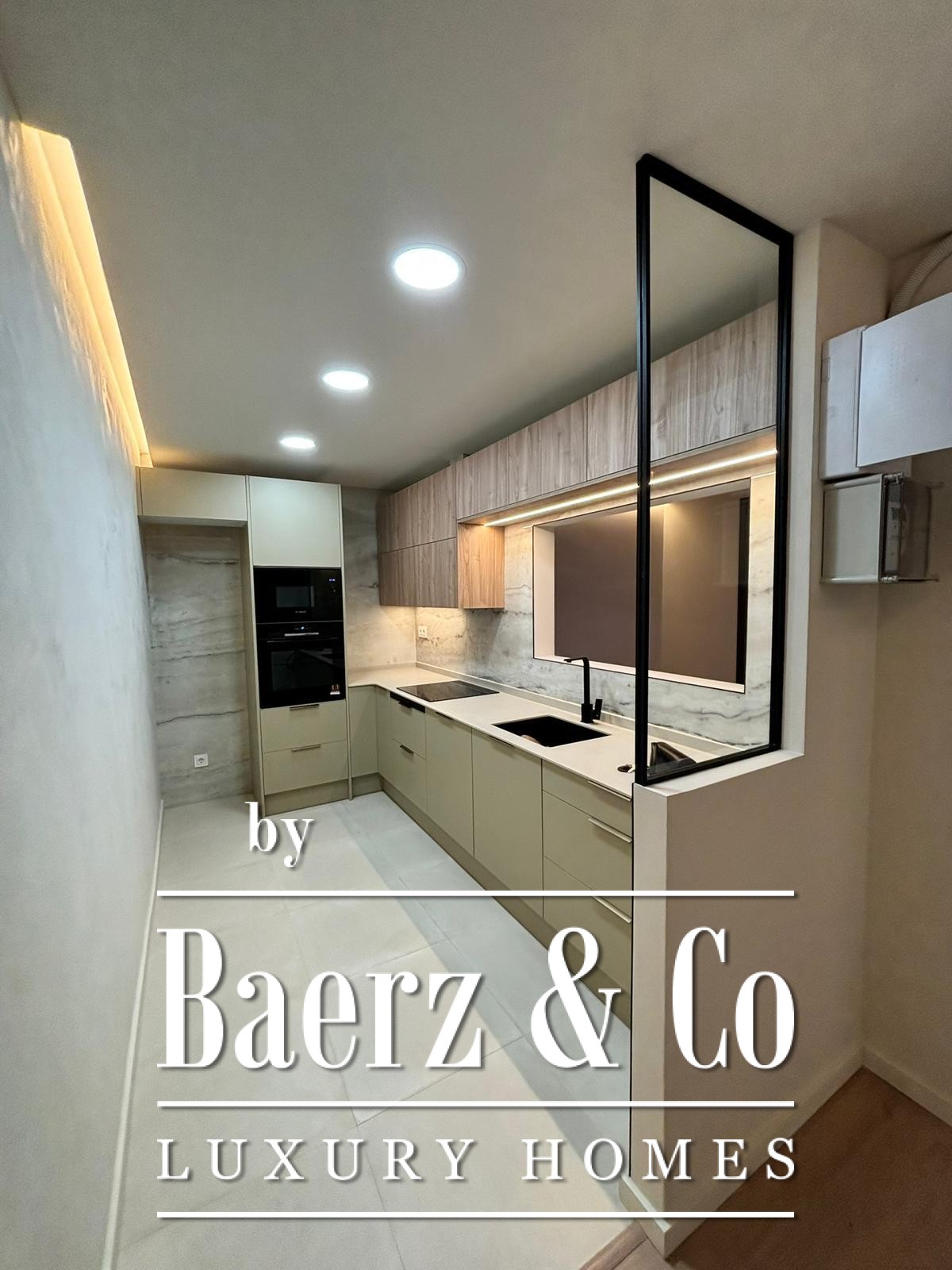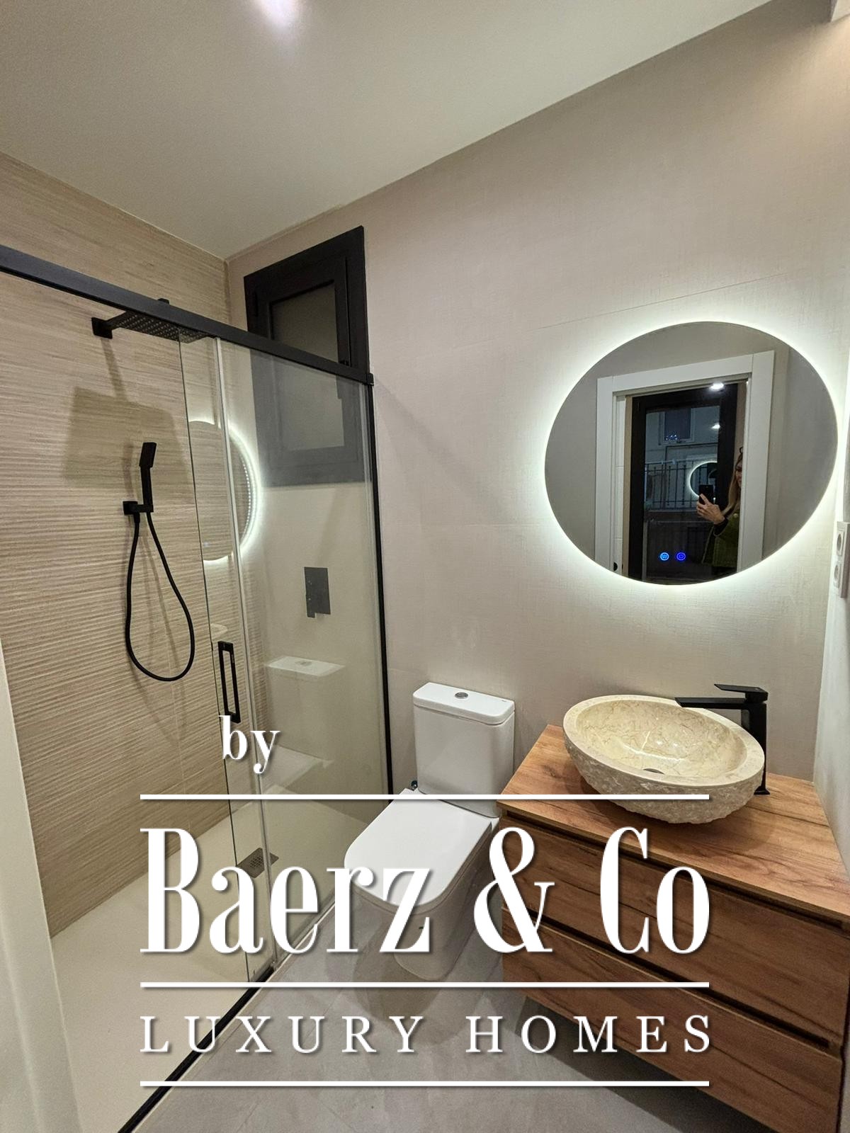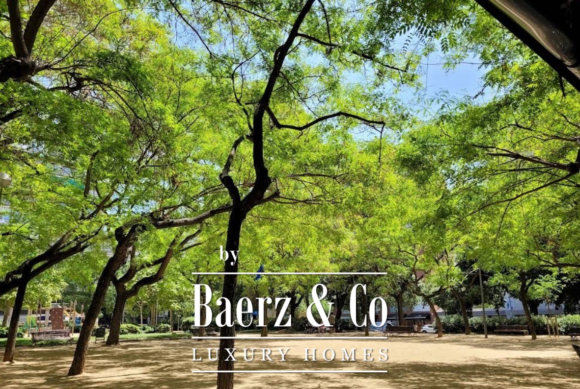 Die ostseitig gelegene Wohn- und Esszimmer empfängt das Morgenlicht und bietet beruhigenden Parkblick, was eine Rückzugsoase im urbanen Raum schafft. Die separate, teilweise offene Küche ist mit Bosch-Geräten und Marmoroptik ausgestattet, die sich harmonisch in den Flur fortsetzt. Katalanische Gewölbedecken verleihen architektonische Authentizität. Modernes Wohnen wird durch zentrale Klimaanlage, doppelt verglaste Fenster und hochwertige LED-Beleuchtung abgerundet.
