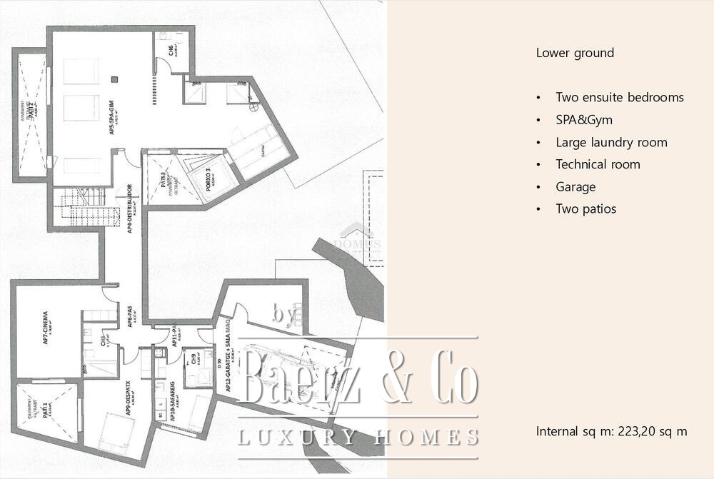 Auf einem großzügigen Grundstück von 2.037 m² entfalten sich prachtvoll angelegte Gärten, die den Rahmen für einen beeindruckenden Infinity-Pool, ein Solarium und einen entspannten Chill-out-Bereich mit Außenkamin bieten. Das Innere erstreckt sich über 446 m² auf zwei Ebenen: Das Hauptgeschoss verfügt über einen großzügigen Wohn- und Essbereich, der nahtlos auf überdachte Terrassen hinausführt, eine moderne Küche, vier Schlafzimmer mit Bad en Suite sowie ein Gäste-WC. Im Untergeschoss befinden sich sorgfältig gestaltete Annehmlichkeiten wie ein Büro mit Patio, ein separates Personalzimmer, ein exklusiver Wellnessbereich mit Fitnessraum, Sauna, Whirlpool, Kinoraum, Abstell- und Waschraum.