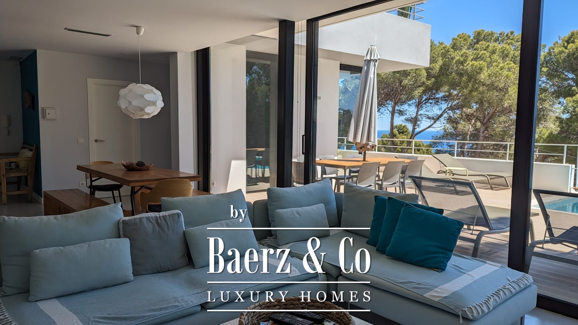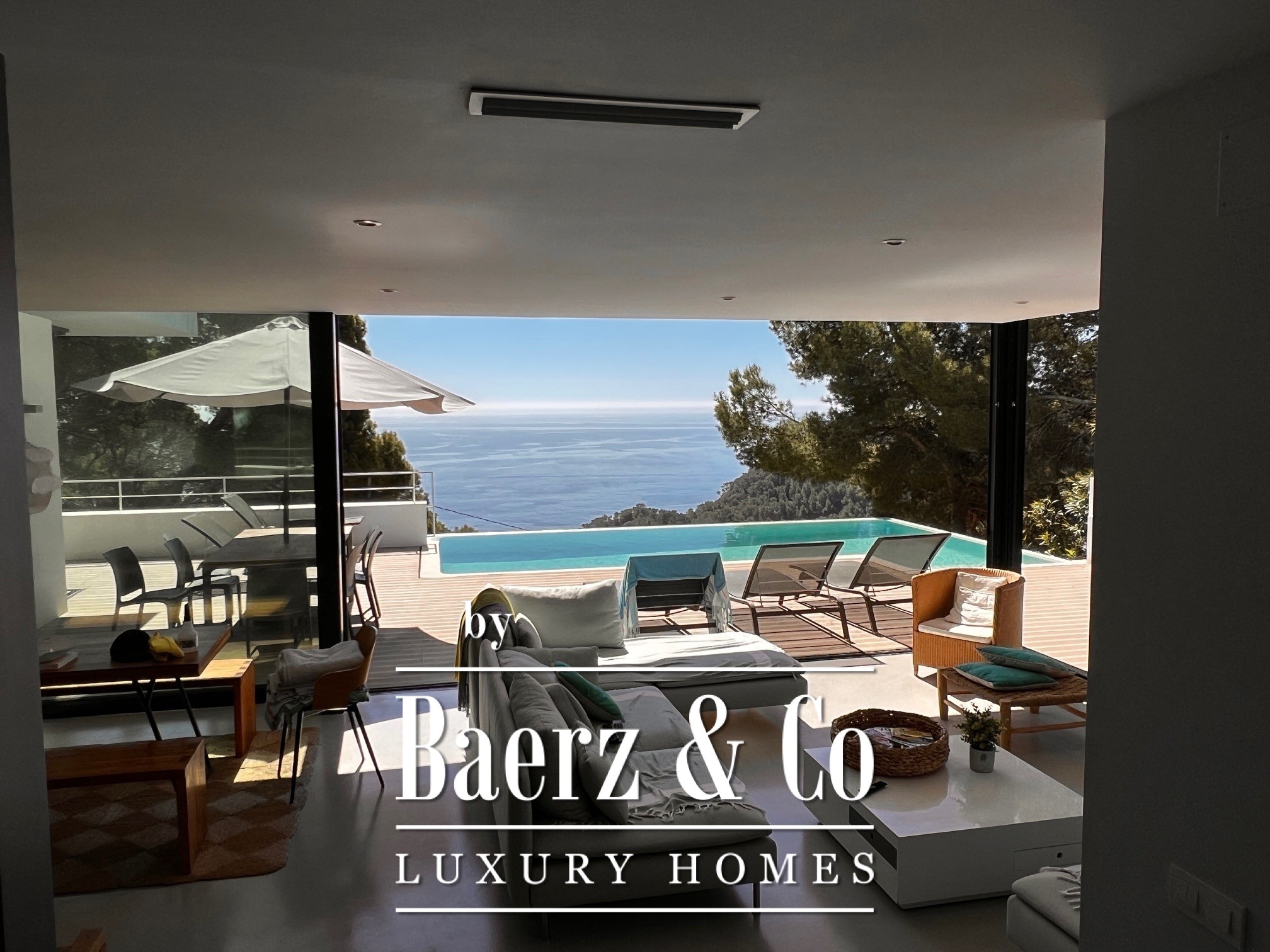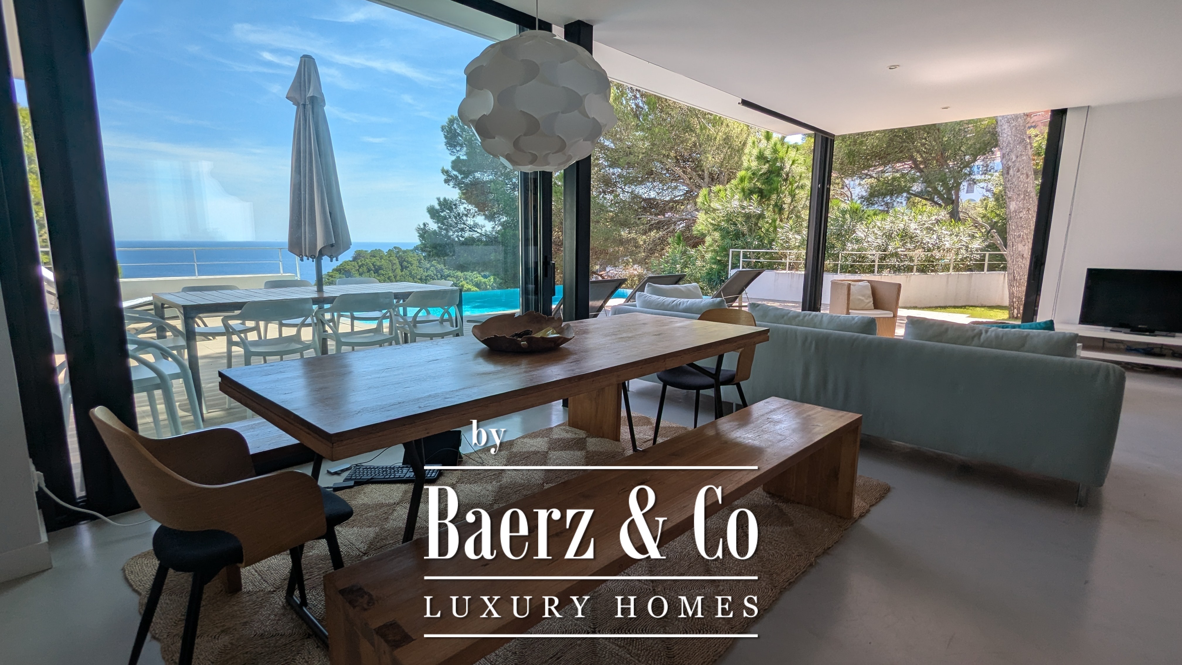 Im Herzen des Hauses laden der großzügige Wohn- und Essbereich sowie die voll ausgestattete Küche zu geselligem Beisammensein ein und öffnen sich direkt zu einer weiten Terrasse, auf der ein spektakulärer Infinity-Pool den Blick auf das Meer einrahmt. Die Verbindung zum Außenbereich unterstützt einen harmonischen Fluss von Licht und Luft über den gesamten Tag hinweg.