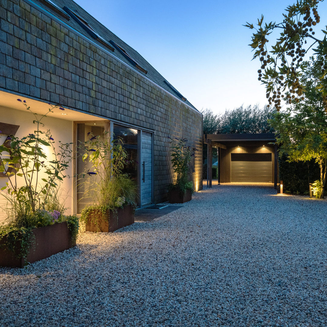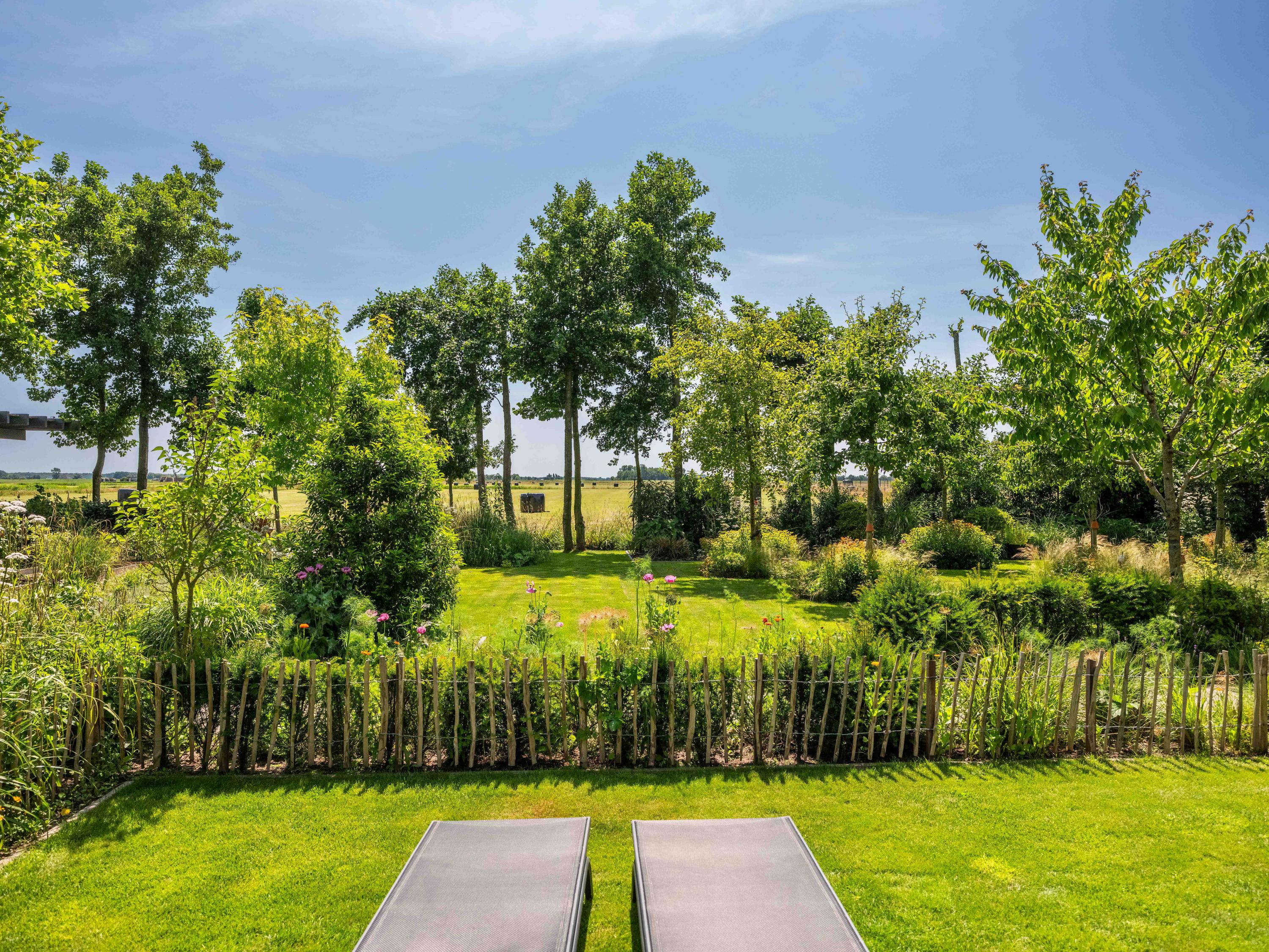 Die gestalteten Außenanlagen bieten Rückzugs- und Inspirationsbereiche: ein Gewächshaus, Küchengarten, Hühnerstall und eine geräumige Terrasse für das Leben im Freien. Von hier schweift der Blick über eine grüne, unverbaute Weite – friedvoll und voller kontemplativer Schönheit.