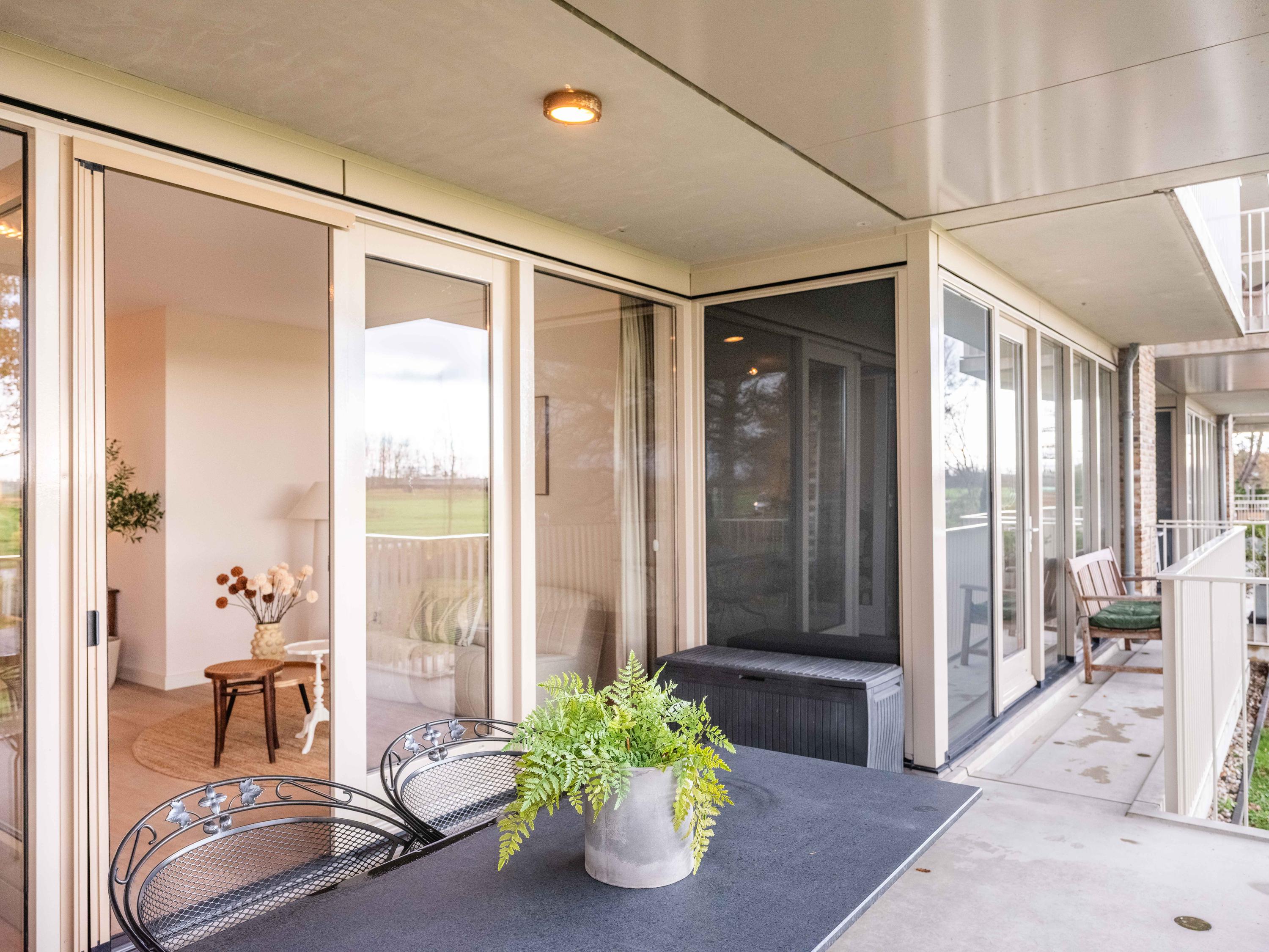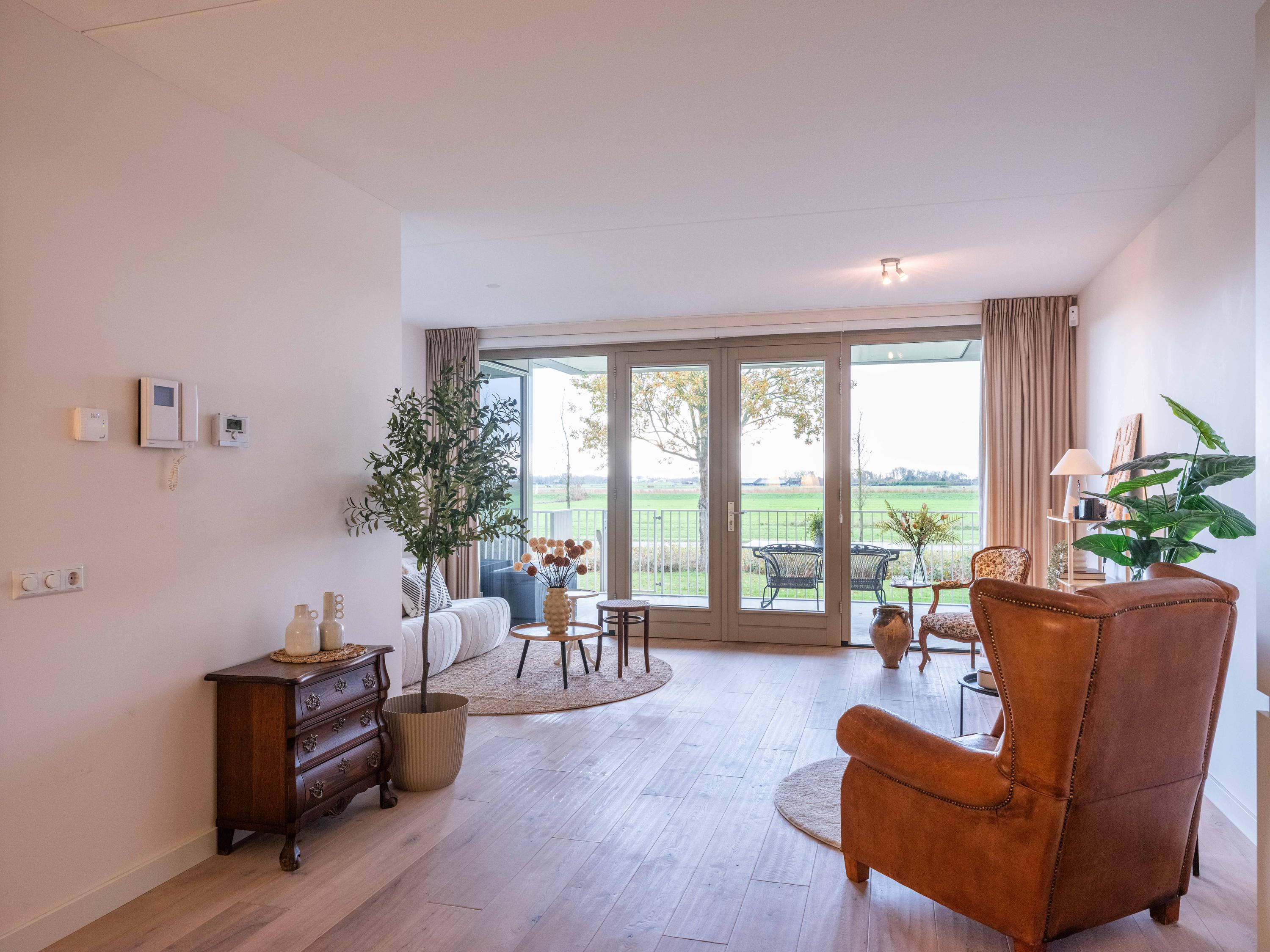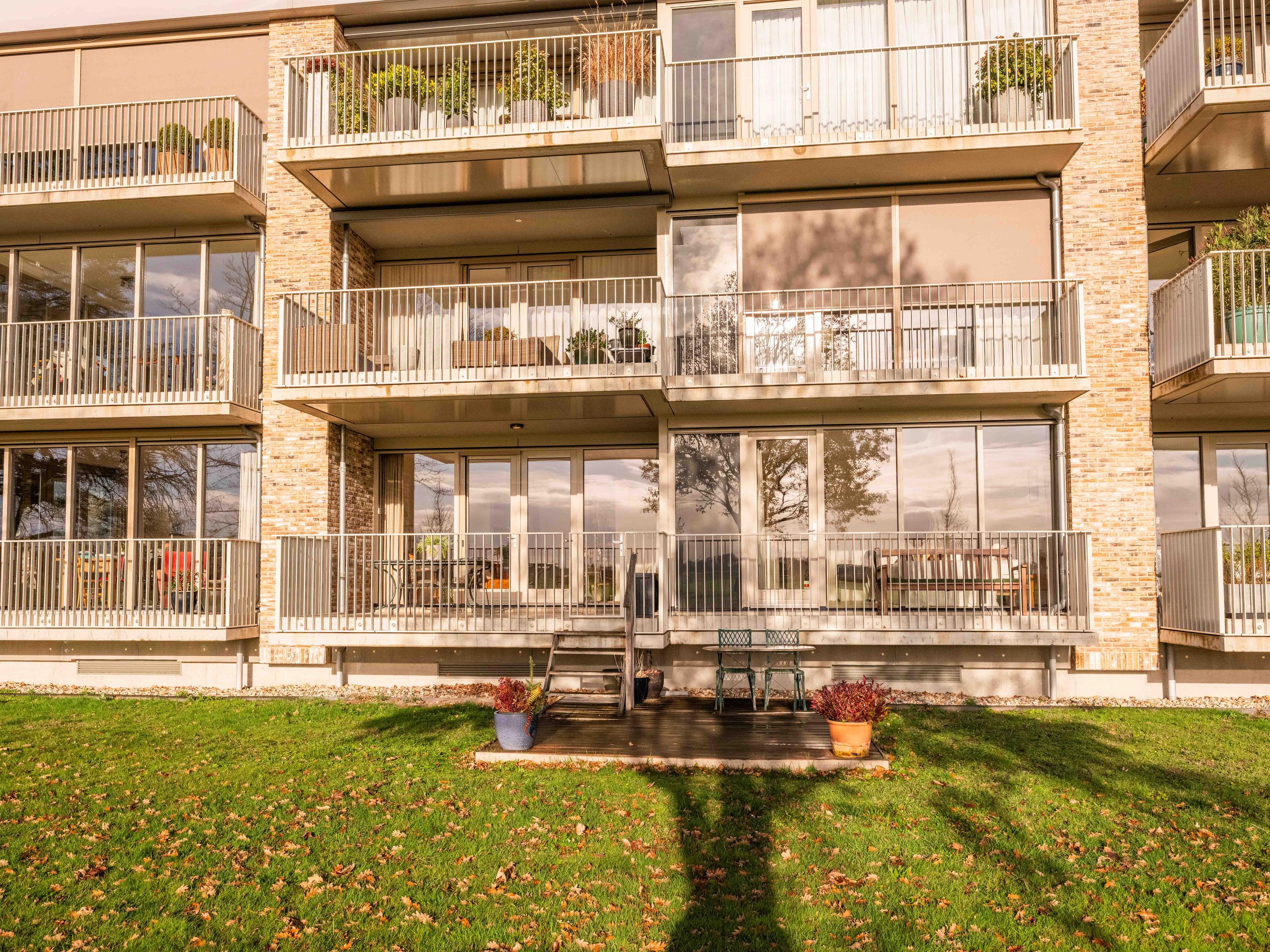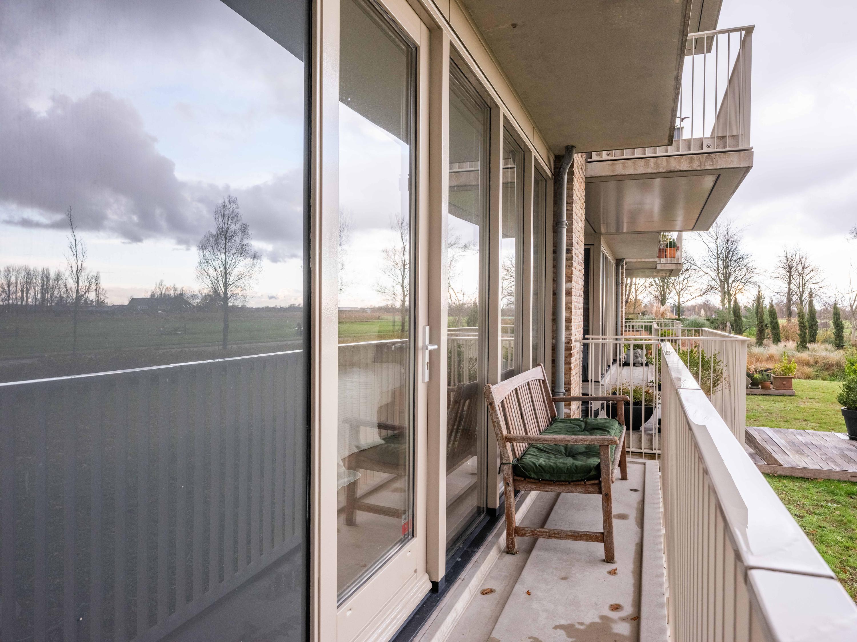 Große Fenster und ein Balkon verbinden das Innere mit dem weiten Himmel, den Gärten und der darunterliegenden Terrasse, wodurch ein Dialog zwischen Wohnen und Landschaft entsteht. Zwei private Pkw-Stellplätze und ein Abstellraum mit Strom sorgen für Alltagstauglichkeit, während Aufzug, Videofon und automatische Türen den Komfort erhöhen. Die Option für Solarpaneele unterstreicht das Engagement für Effizienz. Hier verläuft das Leben im ruhigen Rhythmus der Polderlandschaft von Bergen, verwurzelt in der Tradition und zugleich auf der Höhe der Zeit.
