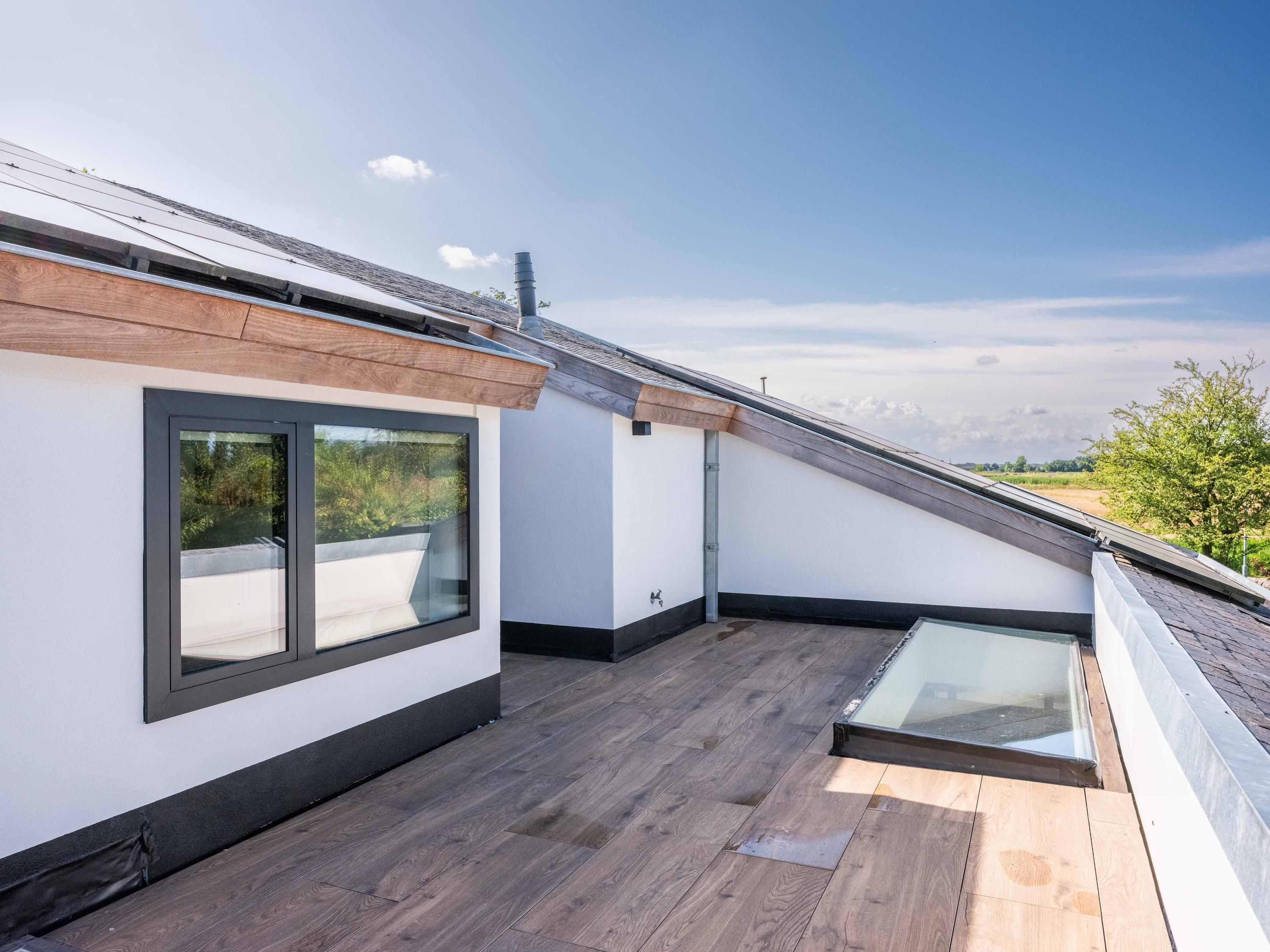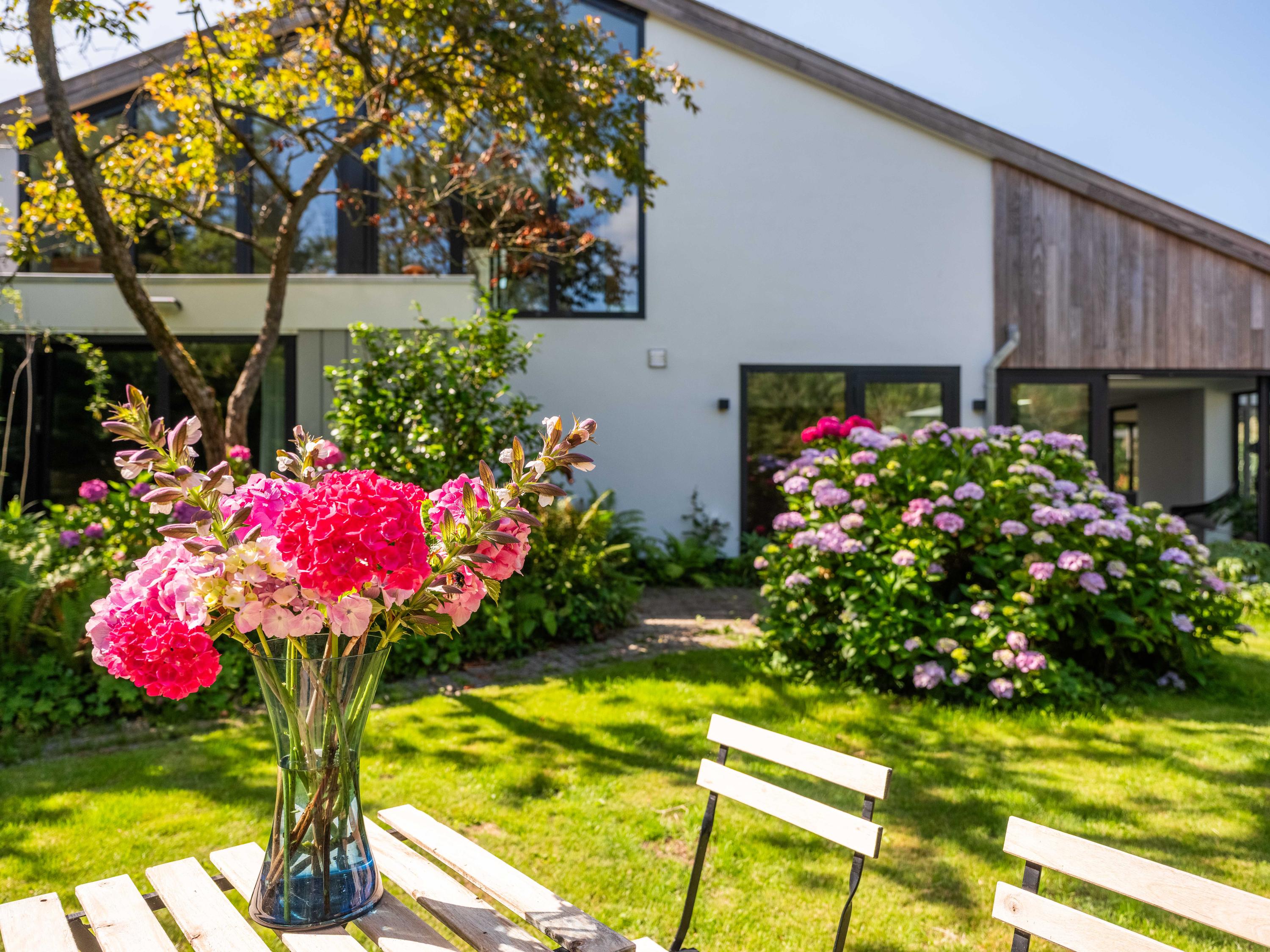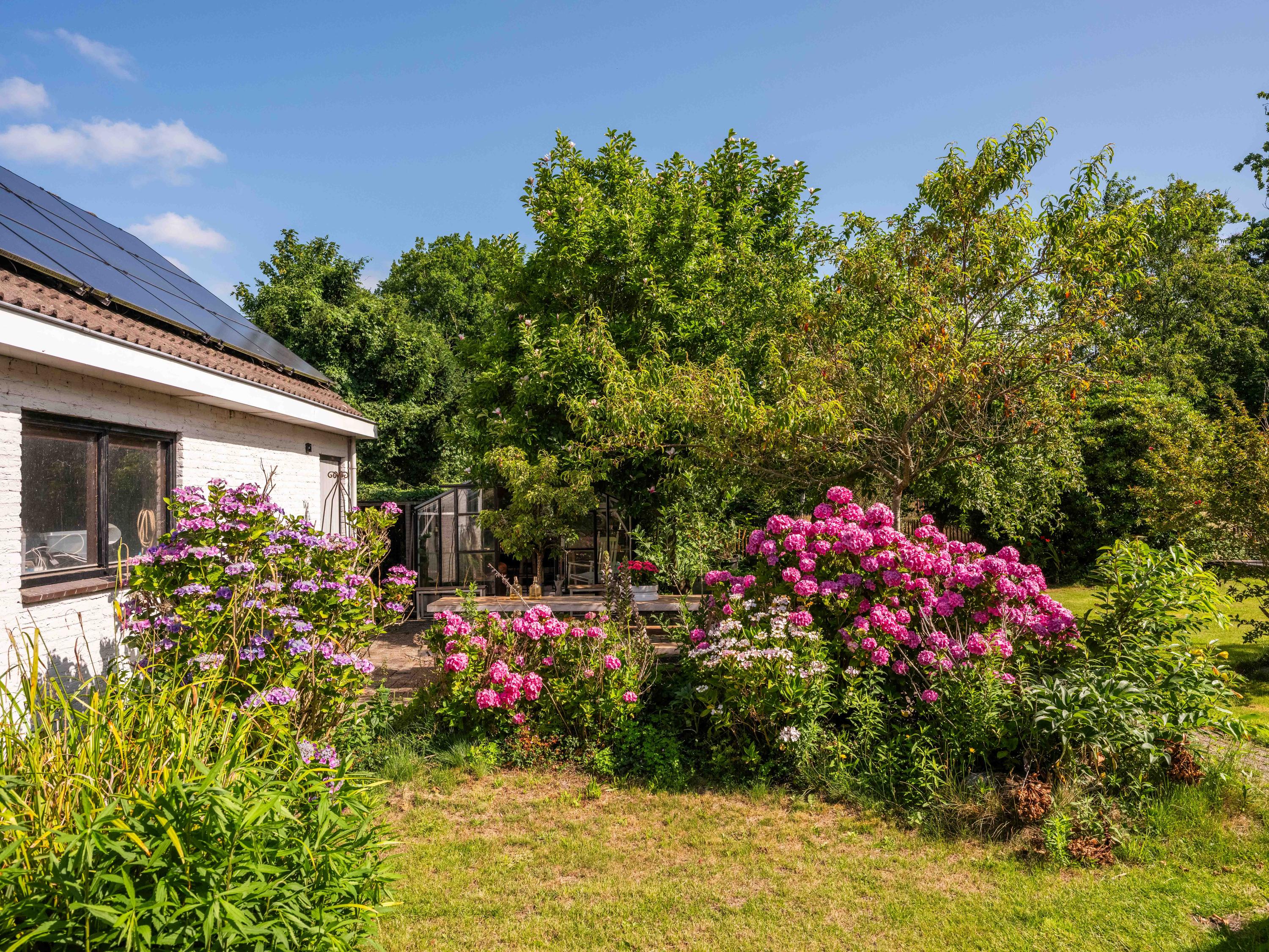 Im Außenbereich genießen Sie echte Privatsphäre, Sonne und Schatten, ein zum Entspannen eingerichtetes Gewächshaus am Außenkamin und eine 50 m² große freistehende Steingarage für zwei Autos. Zwei Einfahrten sowie zwei Ladestationen für Elektrofahrzeuge bieten zusätzlichen Komfort für Familie und Gäste.