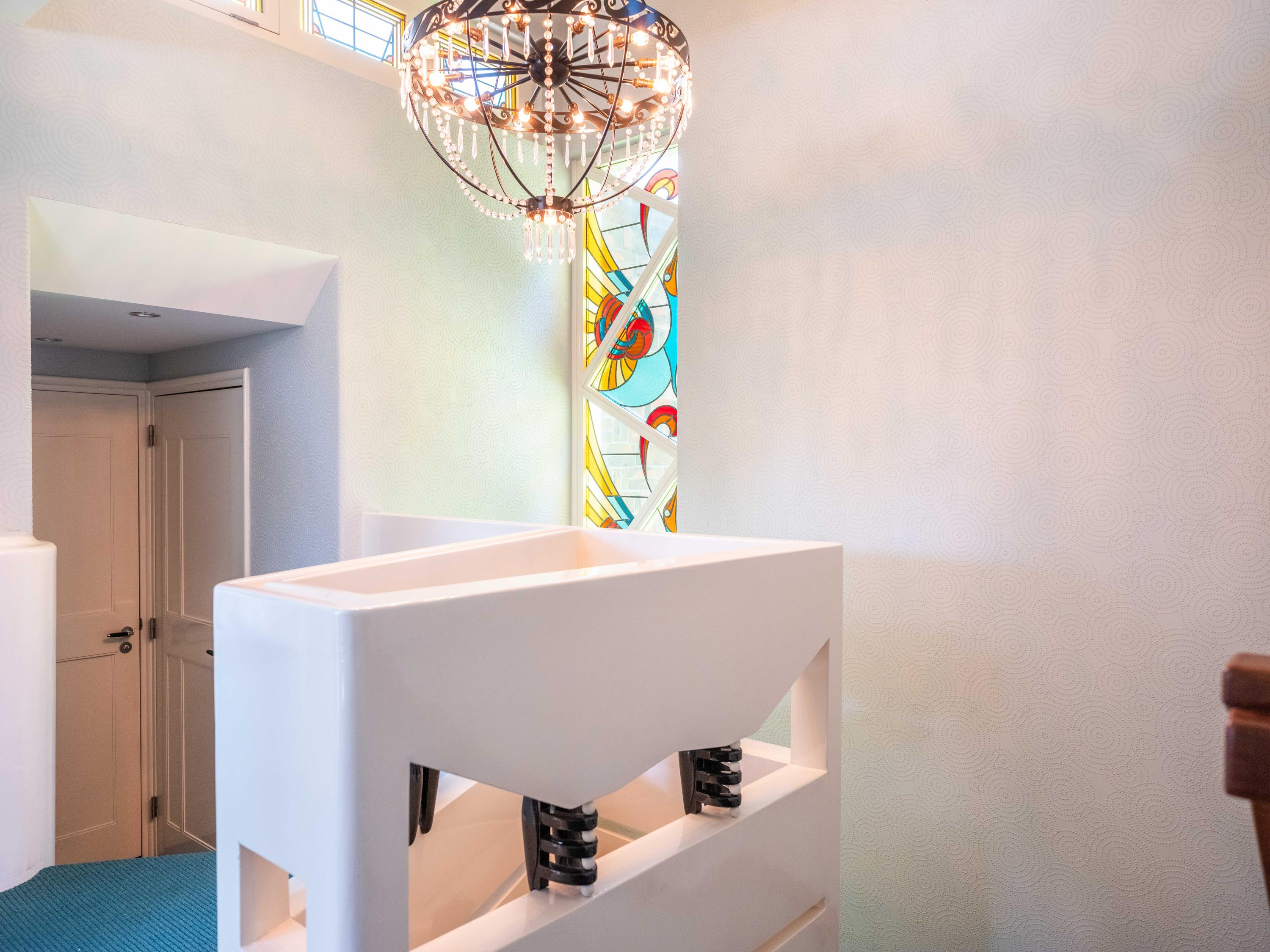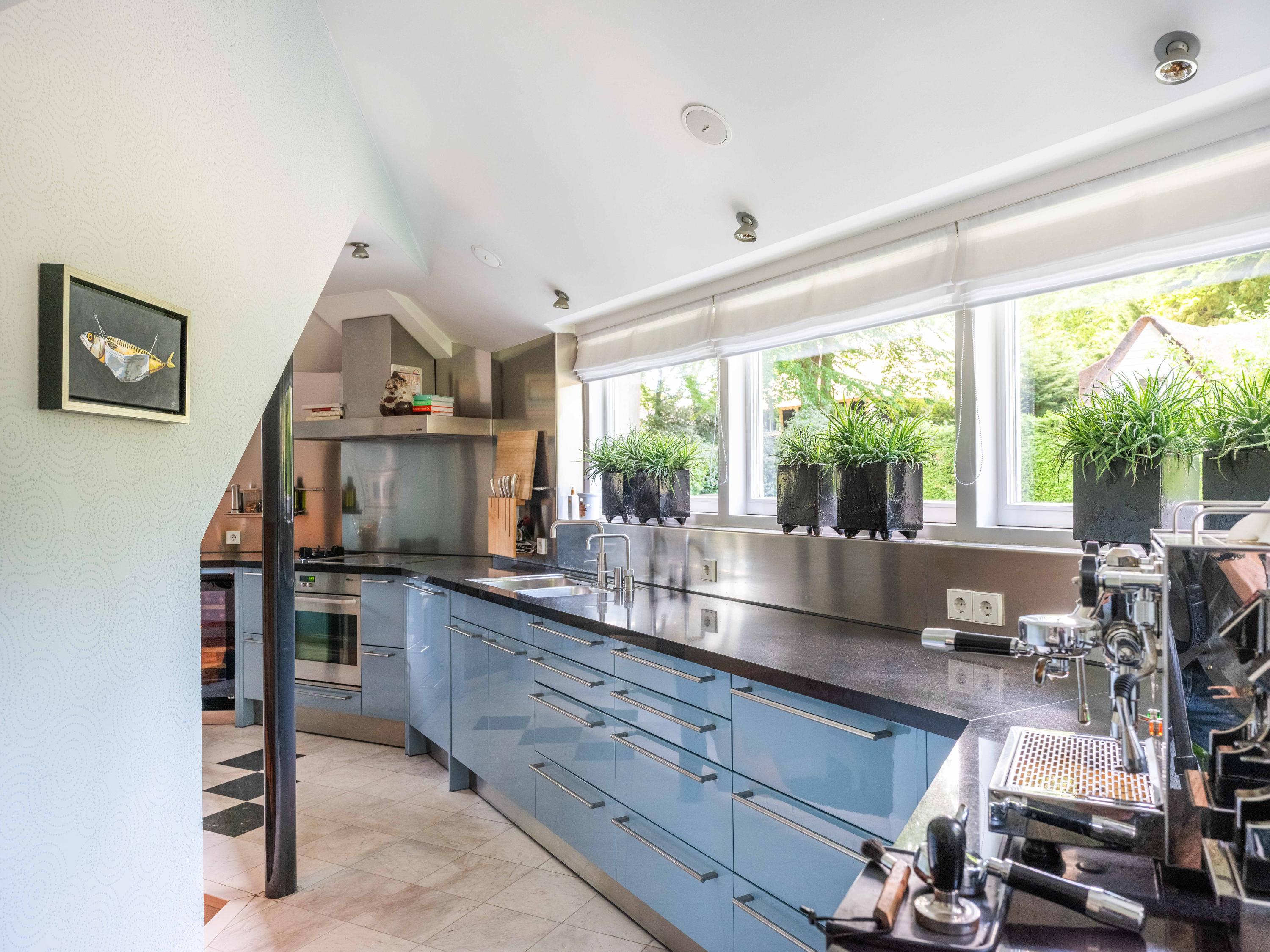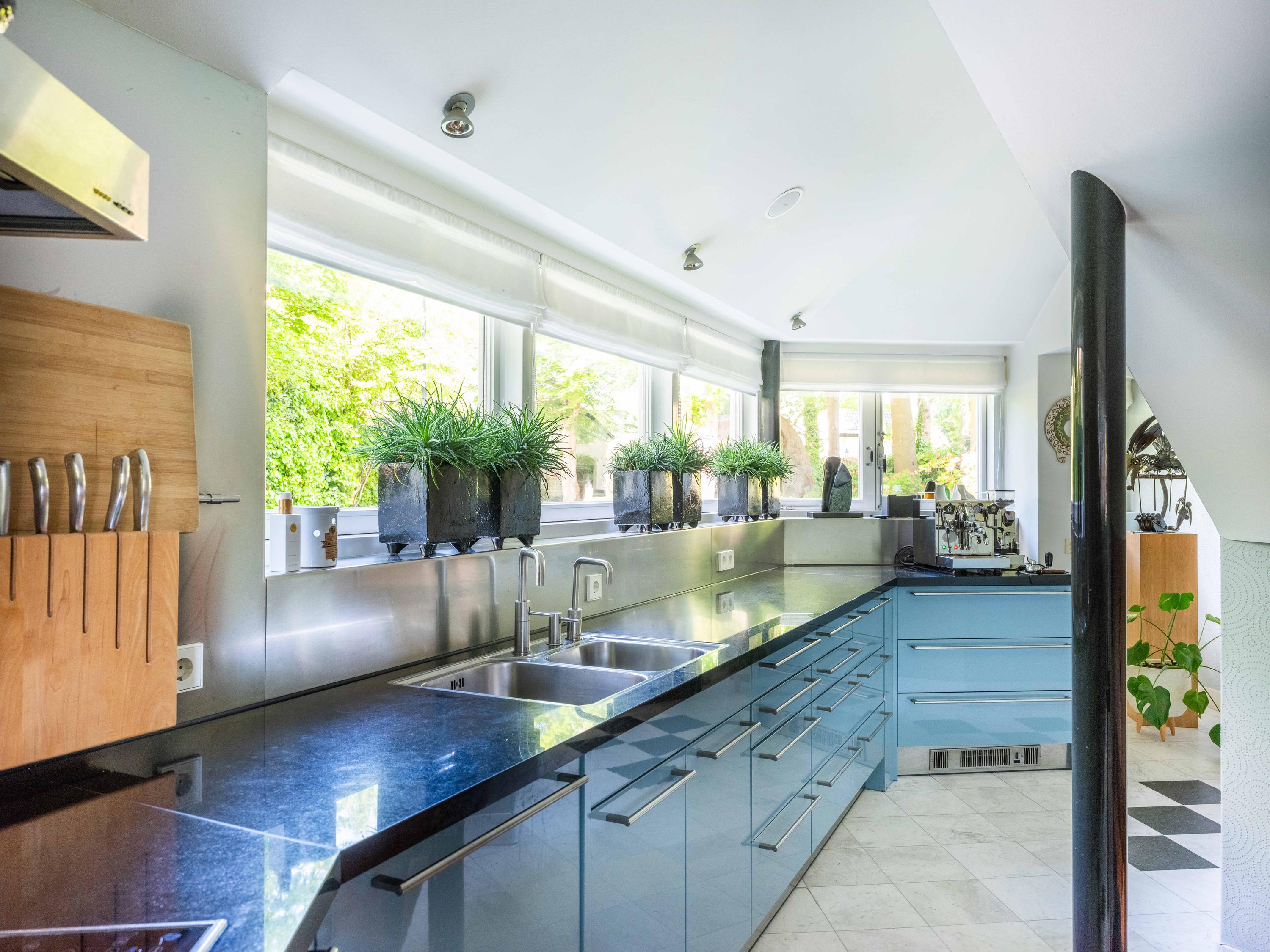 French doors lead to the spacious living room with fireplace, a dining area and conservatory. A striking feature is the raised section, known as the ‘wheelhouse’, which has monumental value. A beautiful parquet floor with piping, the rounded shapes of the fireplace, the ‘compass balls’ near the raised section and the trapezoidal window with columns give the whole a special appearance.