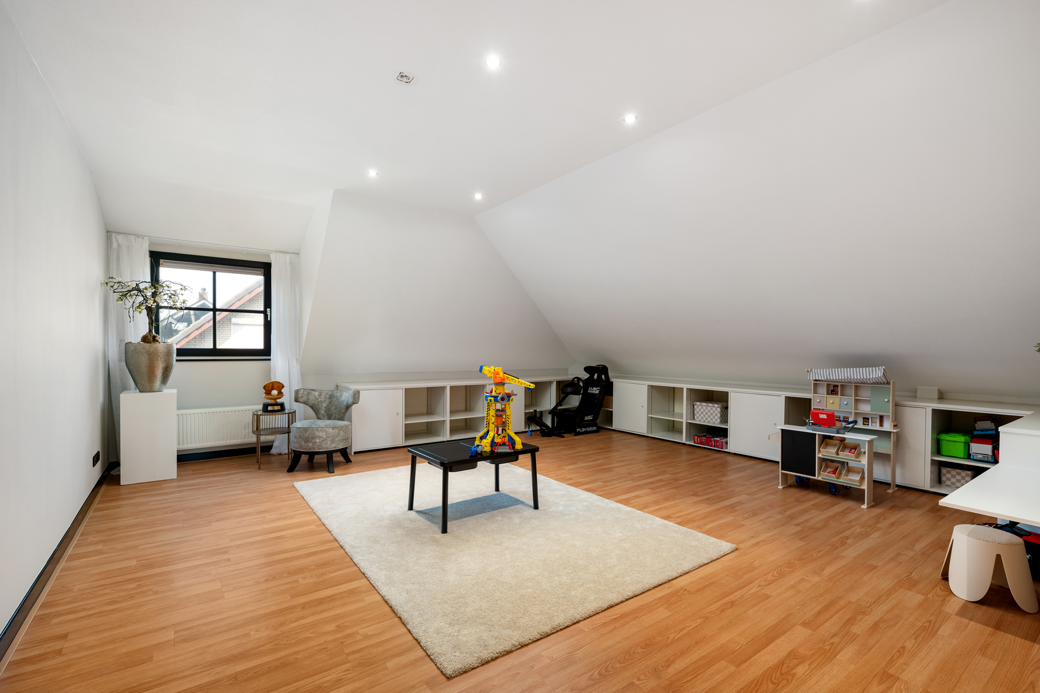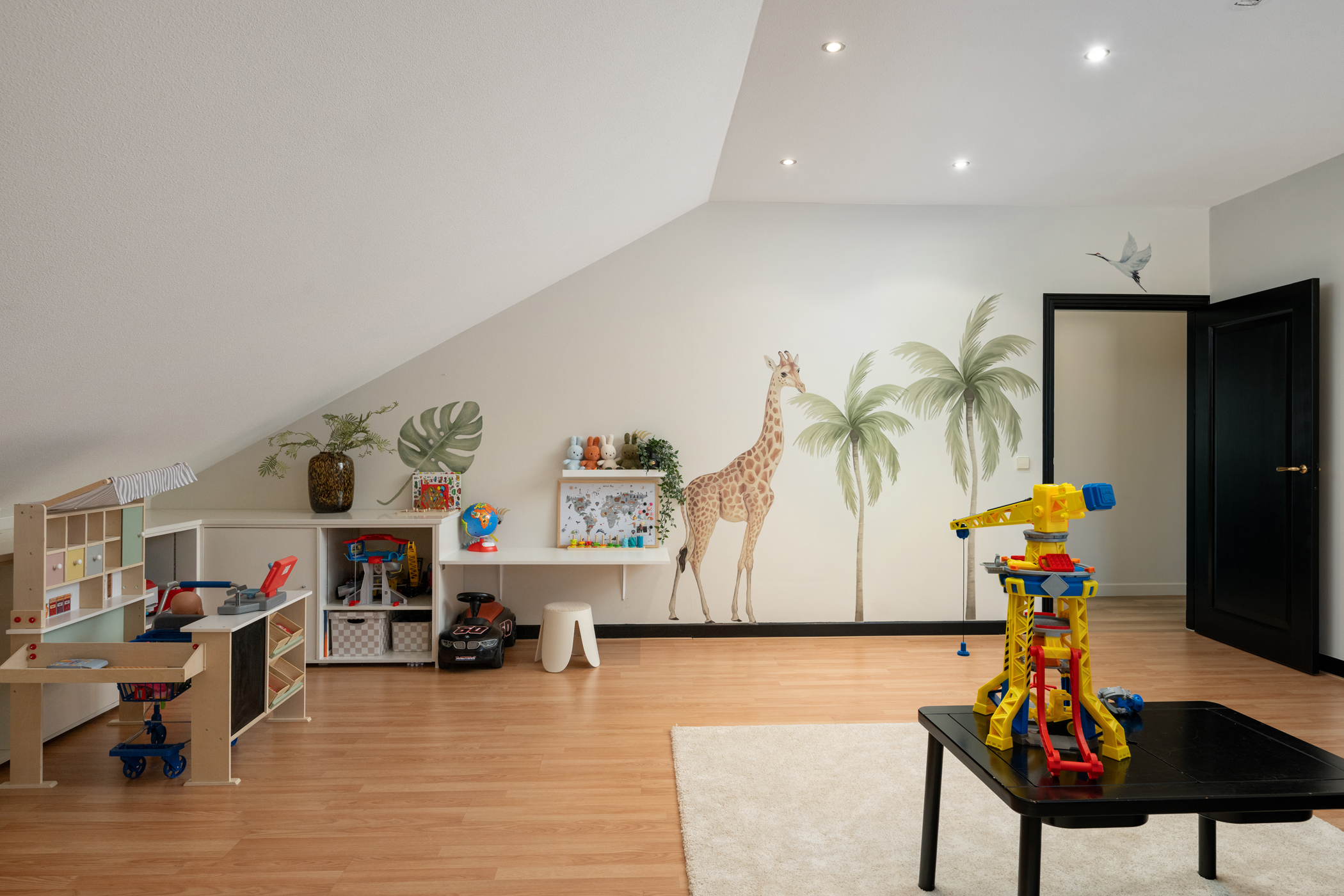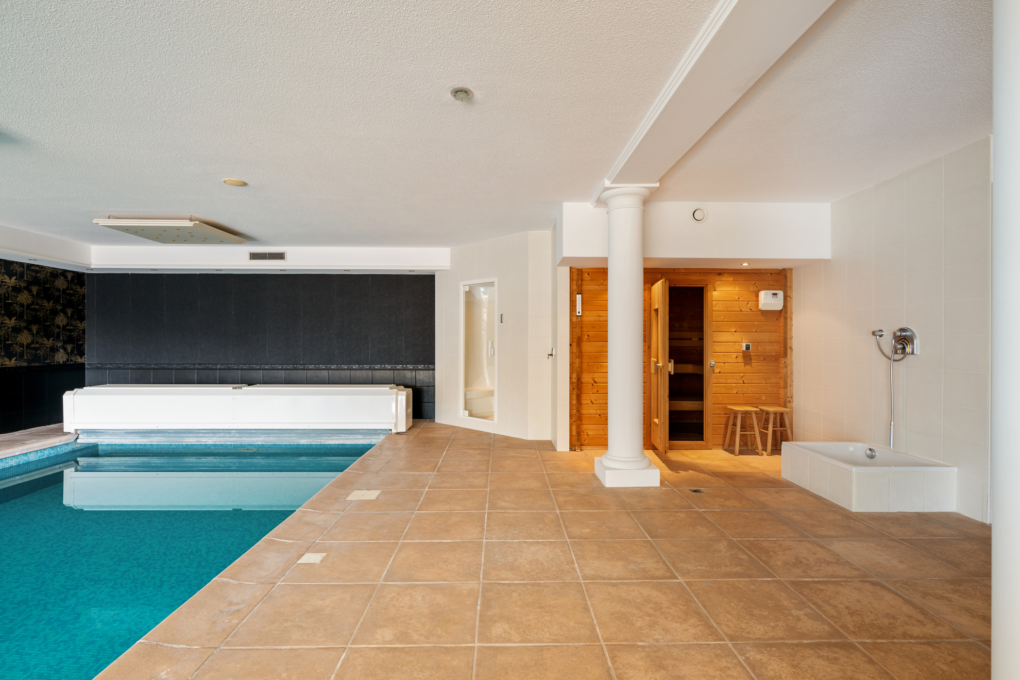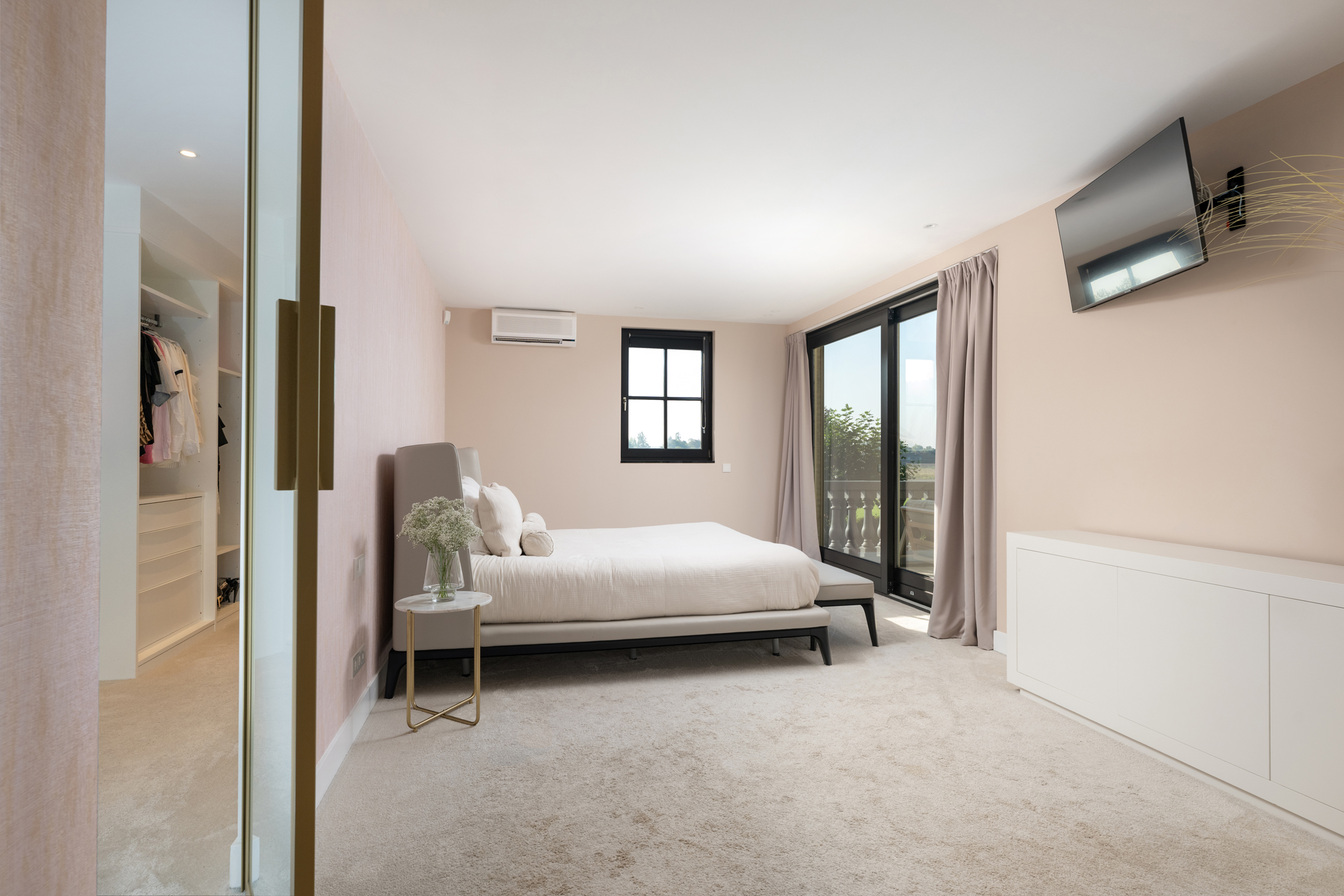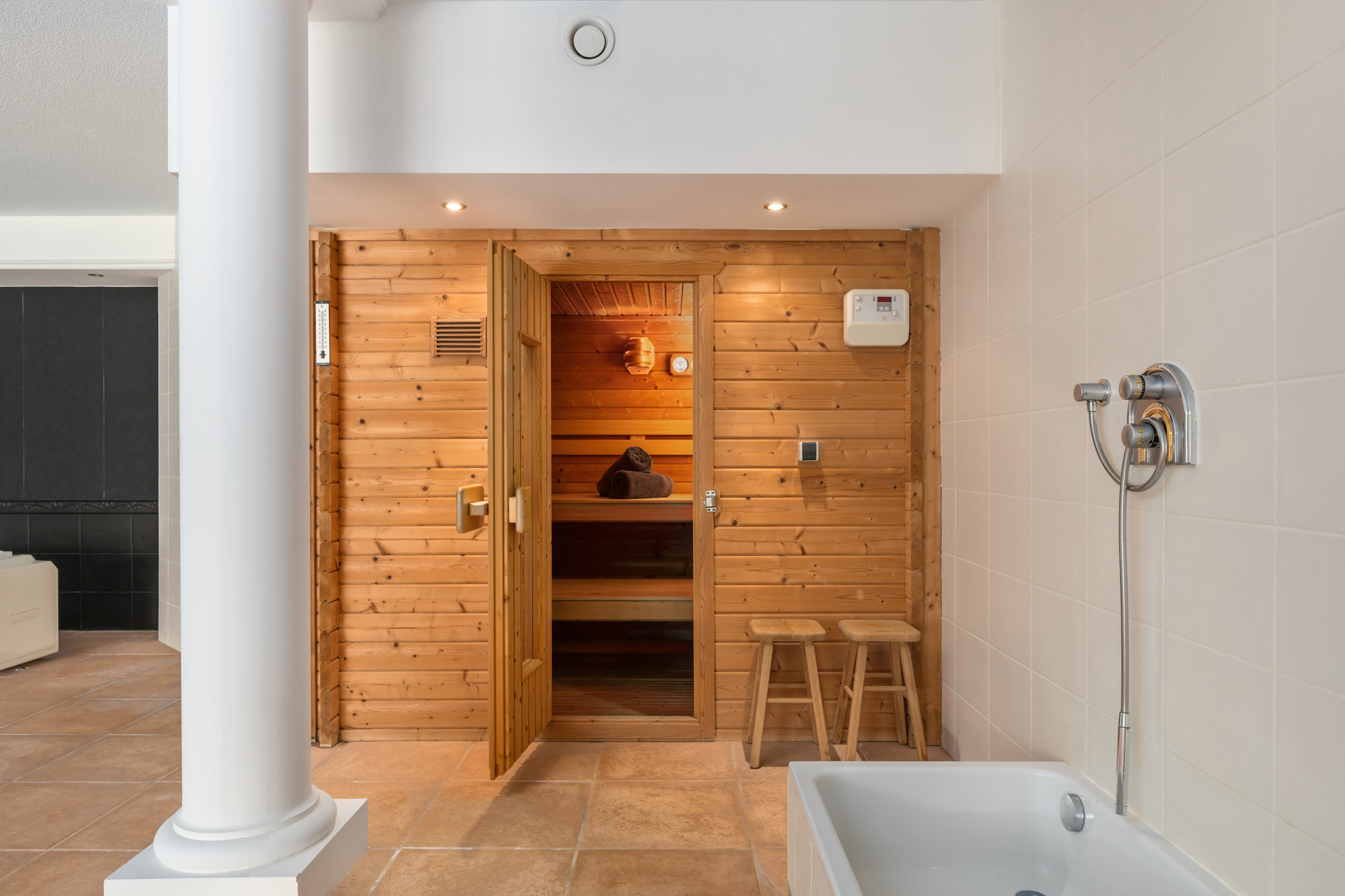 Die Mastersuite im Erdgeschoss überzeugt durch Privatsphäre und Offenheit zugleich, mit eigenem Terrassenzugang, begehbarem Kleiderschrank und edlem Bad en Suite. Im Obergeschoss bieten vier weitere Schlafzimmer Flexibilität und Platz für Familie oder Gäste, ergänzt durch ein zweites Badezimmer und Abstellflächen. Im Untergeschoss befinden sich ein vielseitiges Büro, zusätzliche Lagerräume und insbesondere ein exklusiver Wellnessbereich: ein ruhiger Rückzugsort mit Hallenbad, Sauna sowie direktem Zugang zum rückwärtigen Garten und zum Hobbygewächshaus.