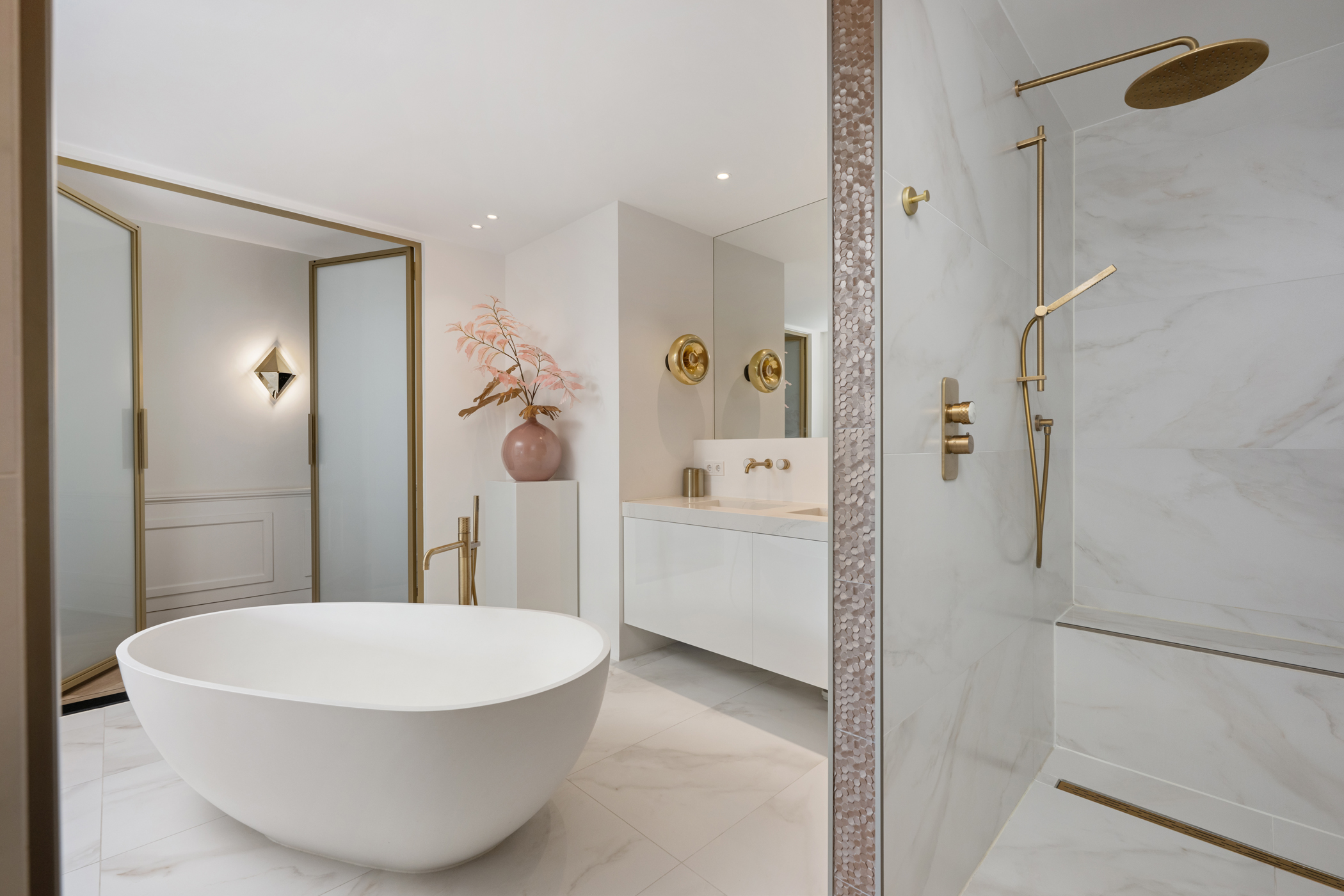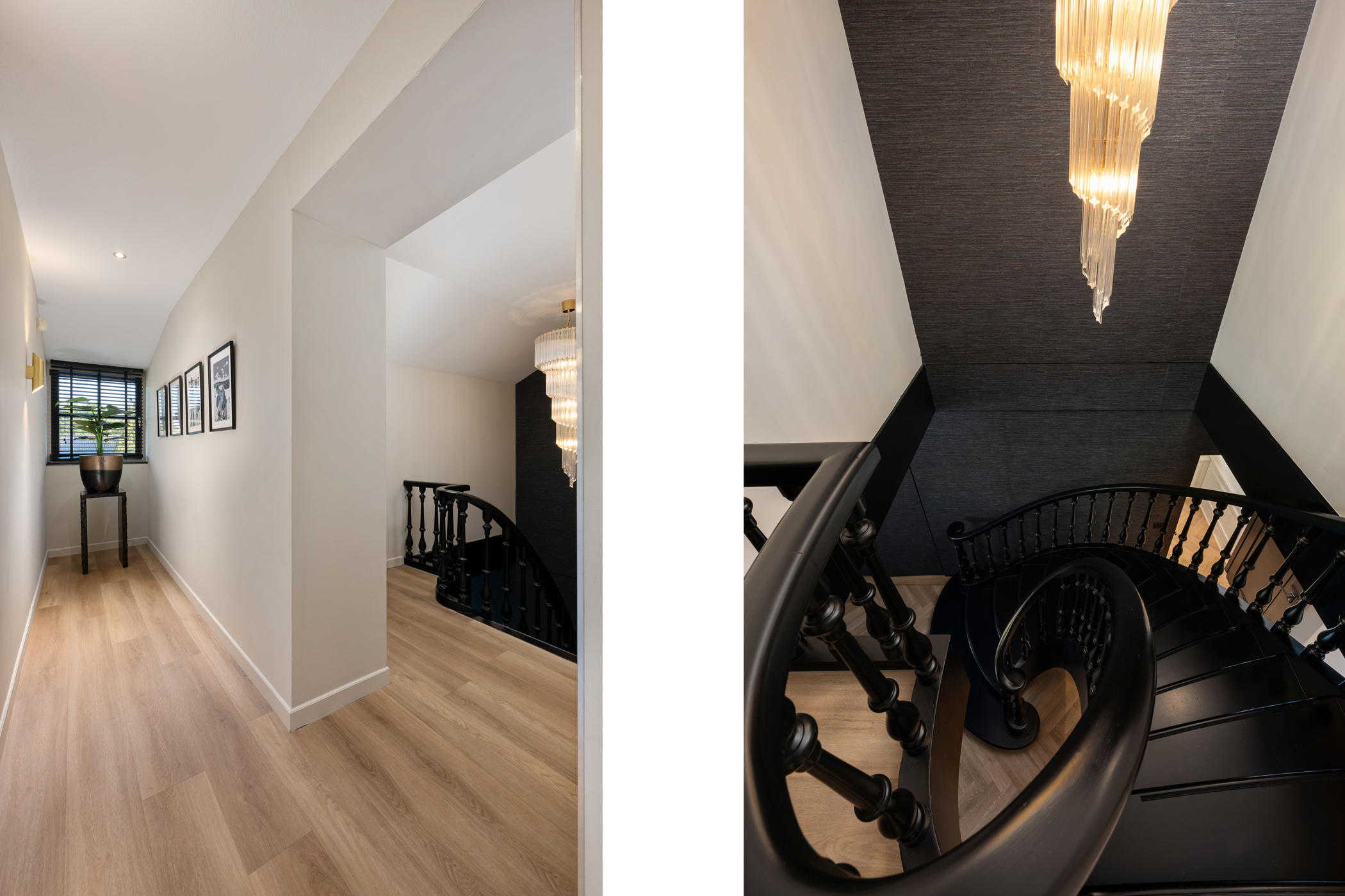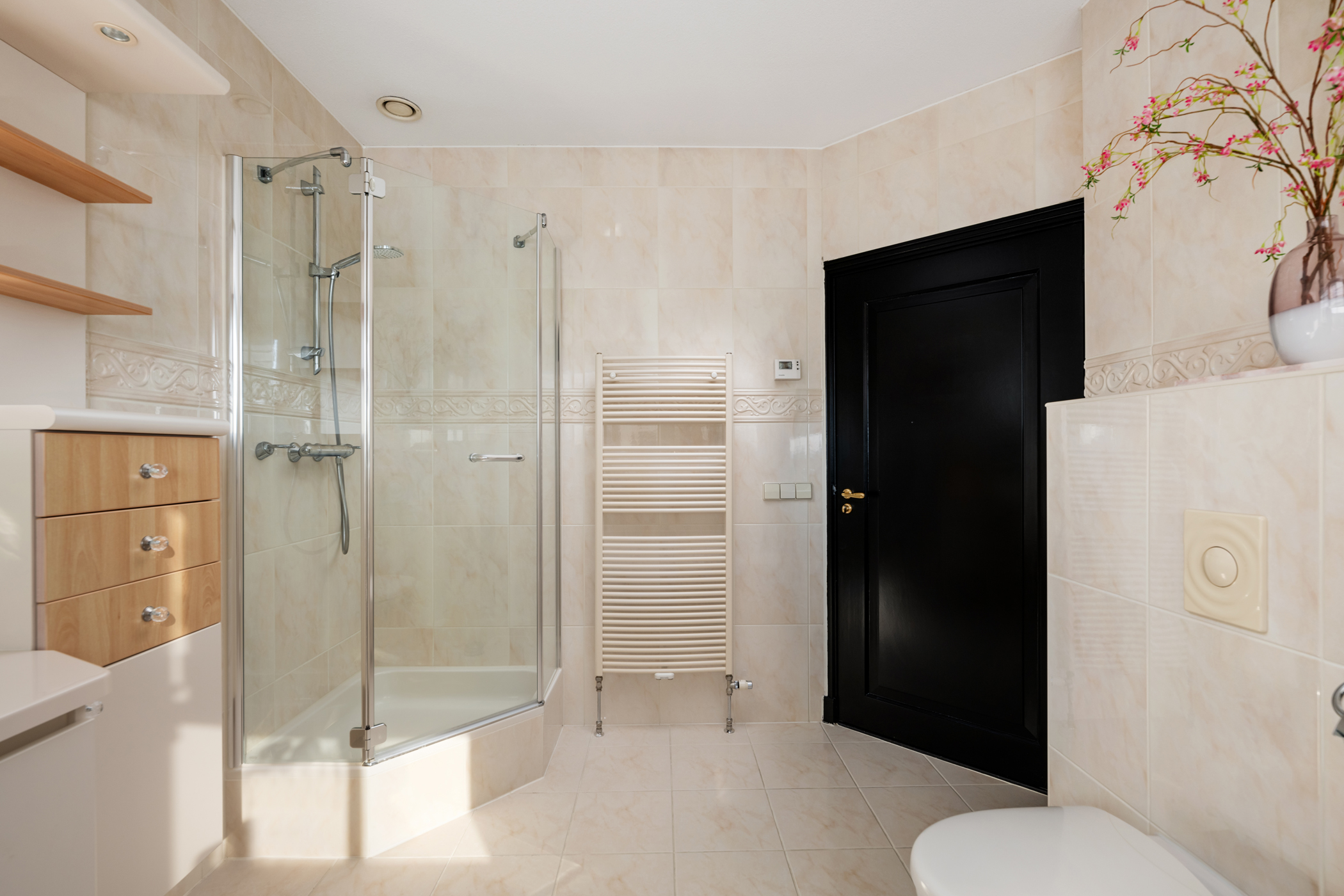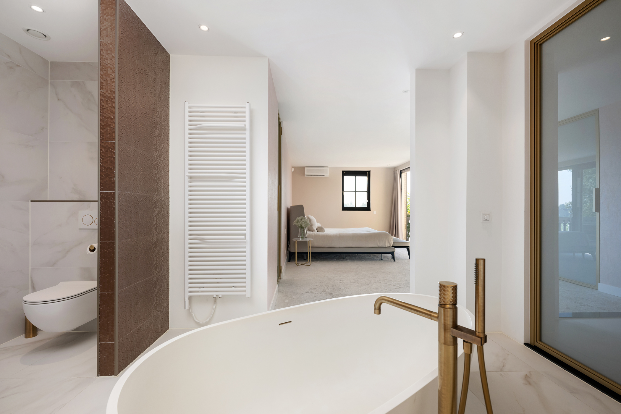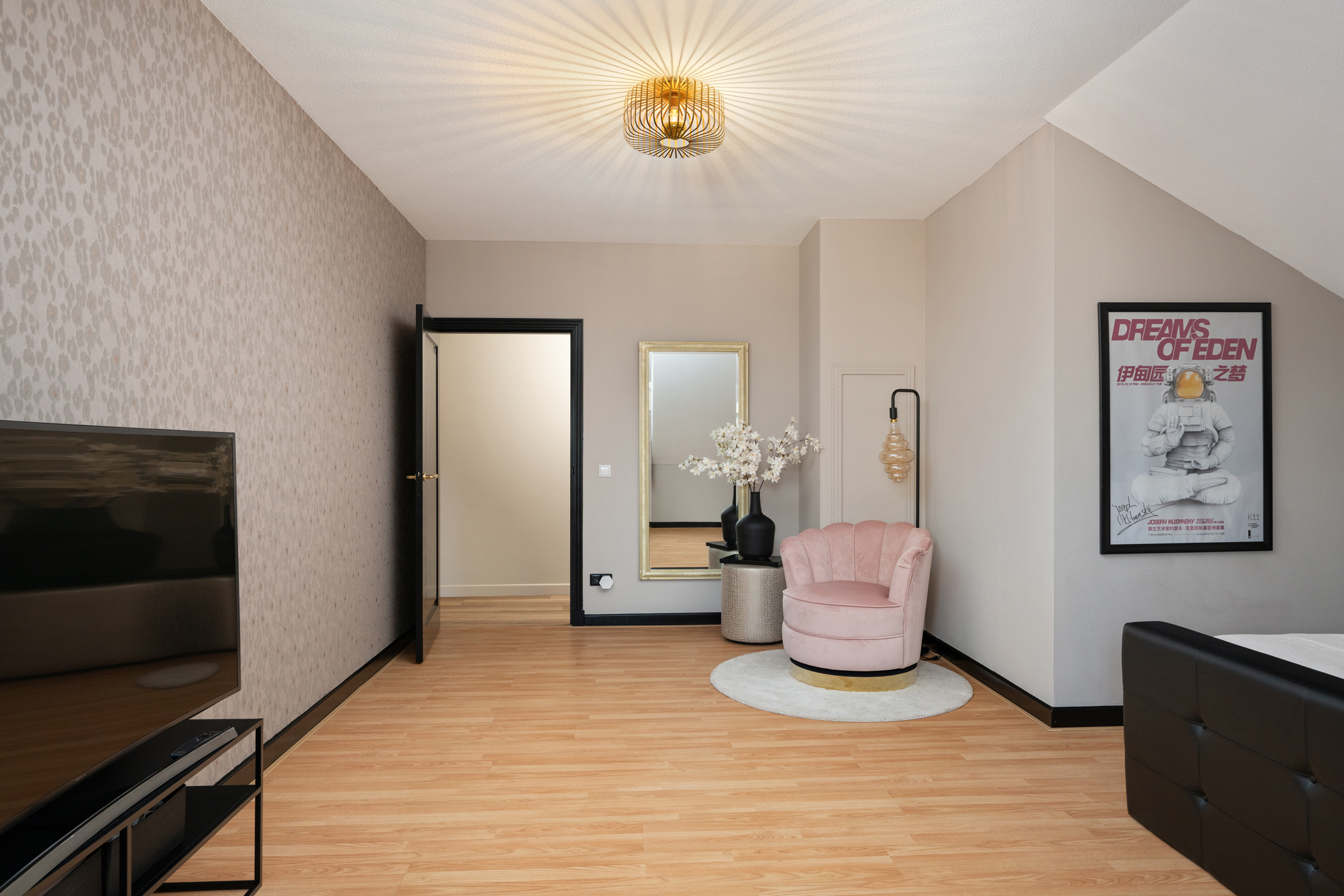 Die Mastersuite im Erdgeschoss überzeugt durch Privatsphäre und Offenheit zugleich, mit eigenem Terrassenzugang, begehbarem Kleiderschrank und edlem Bad en Suite. Im Obergeschoss bieten vier weitere Schlafzimmer Flexibilität und Platz für Familie oder Gäste, ergänzt durch ein zweites Badezimmer und Abstellflächen. Im Untergeschoss befinden sich ein vielseitiges Büro, zusätzliche Lagerräume und insbesondere ein exklusiver Wellnessbereich: ein ruhiger Rückzugsort mit Hallenbad, Sauna sowie direktem Zugang zum rückwärtigen Garten und zum Hobbygewächshaus.