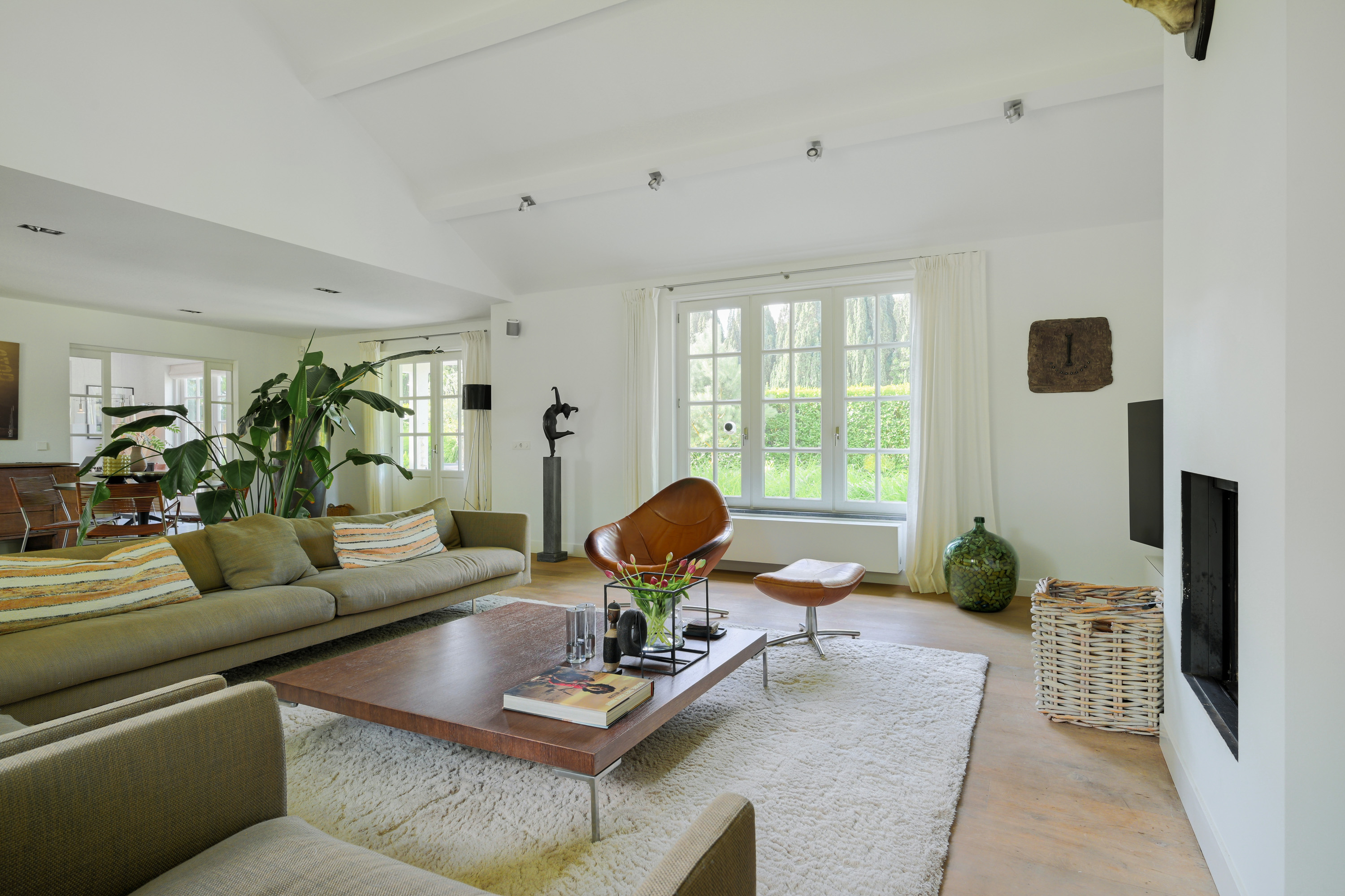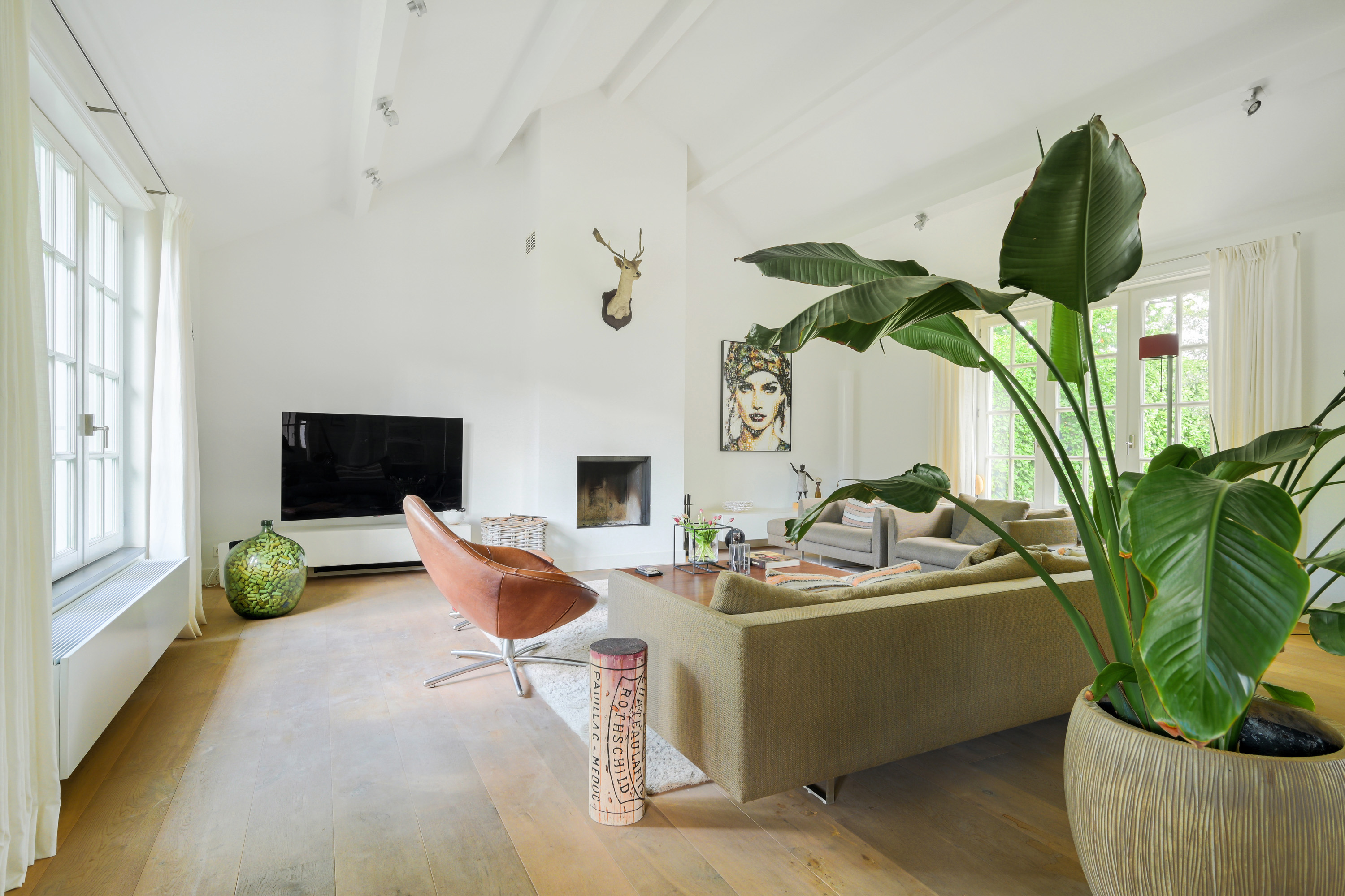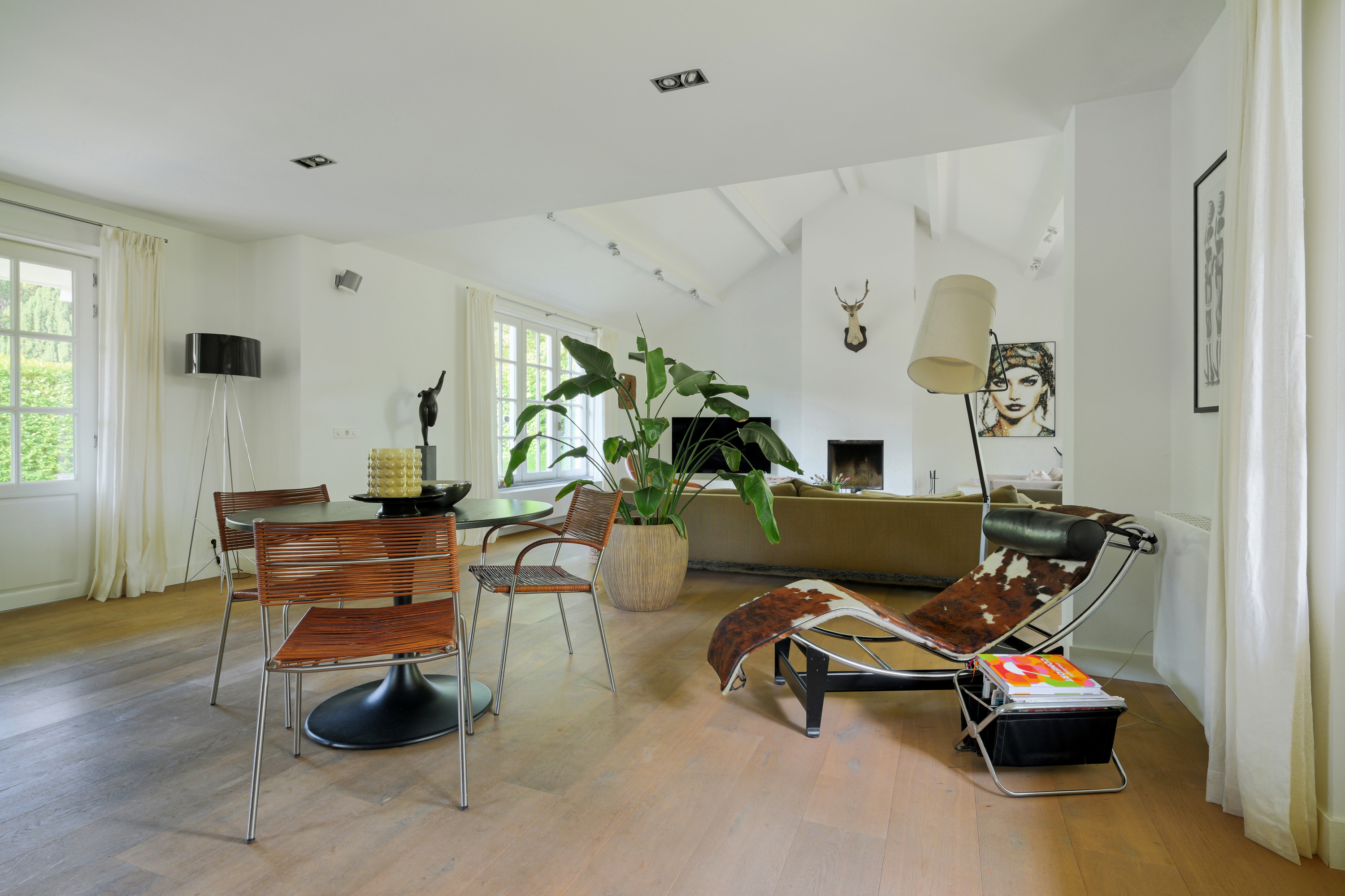 This room, fully fitted with wide wooden floorboards, features a modern mantelpiece with a wood-burning insert. The lofty, open ceiling enhances the airy atmosphere. Large windows offer stunning views of both gardens.