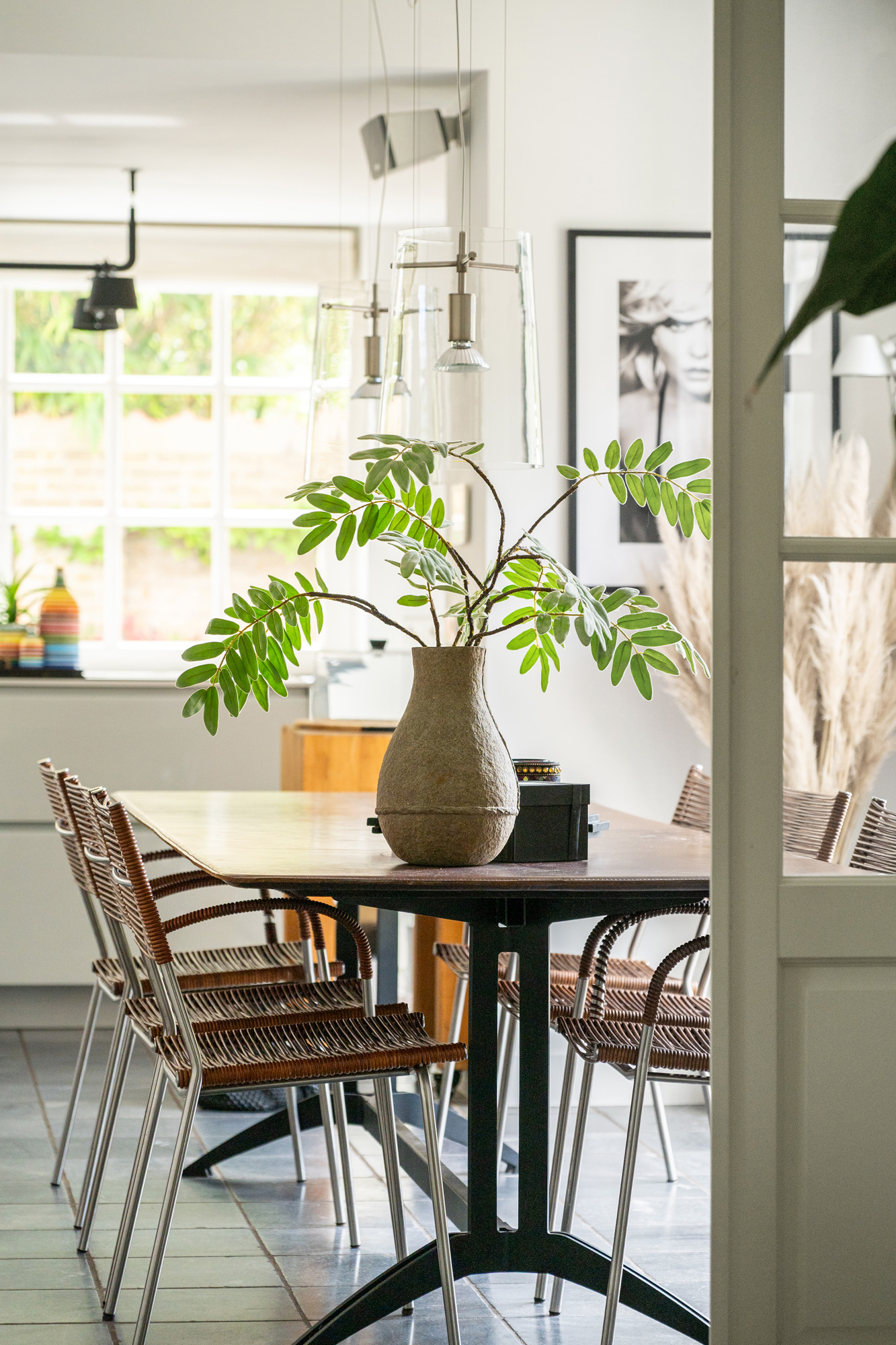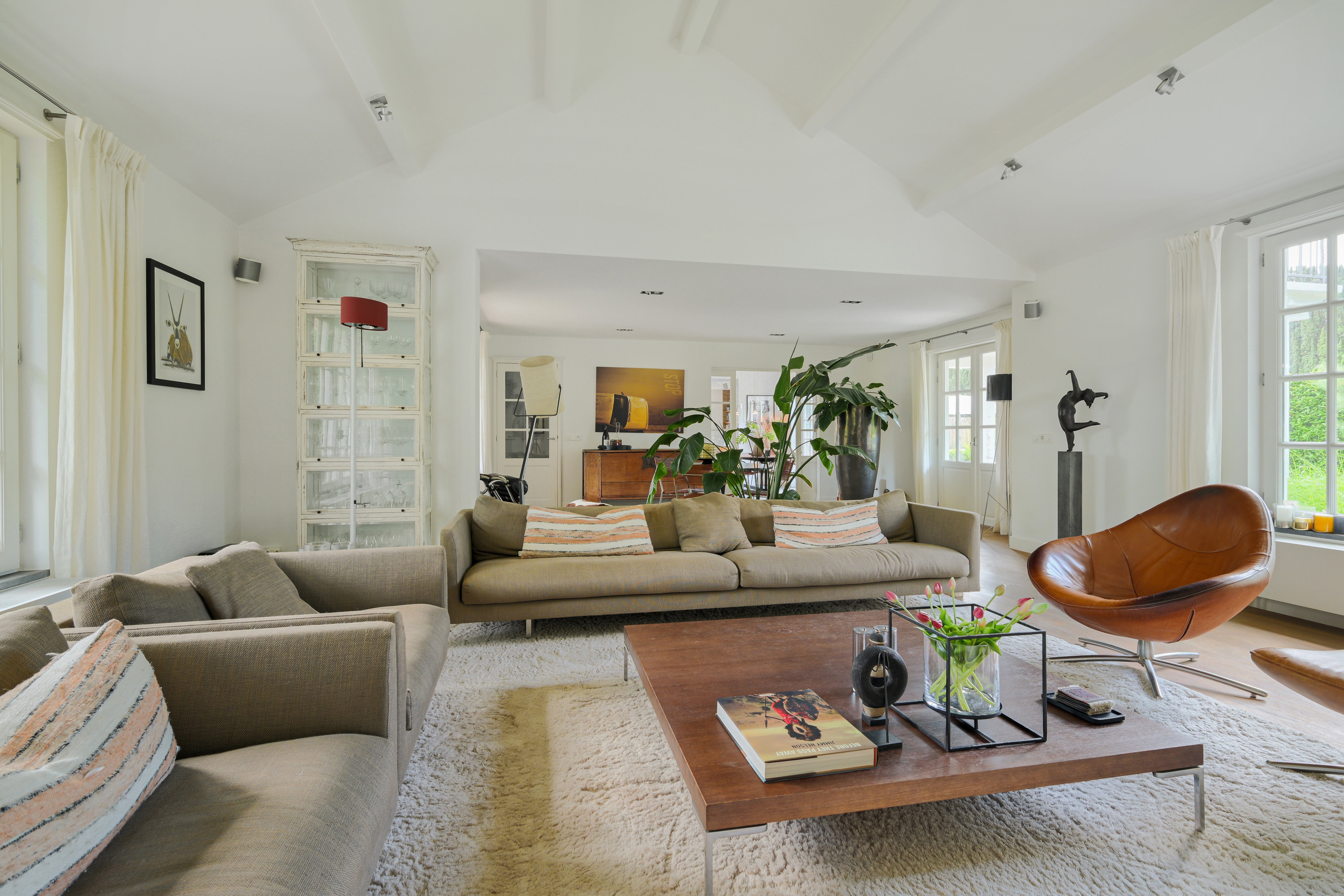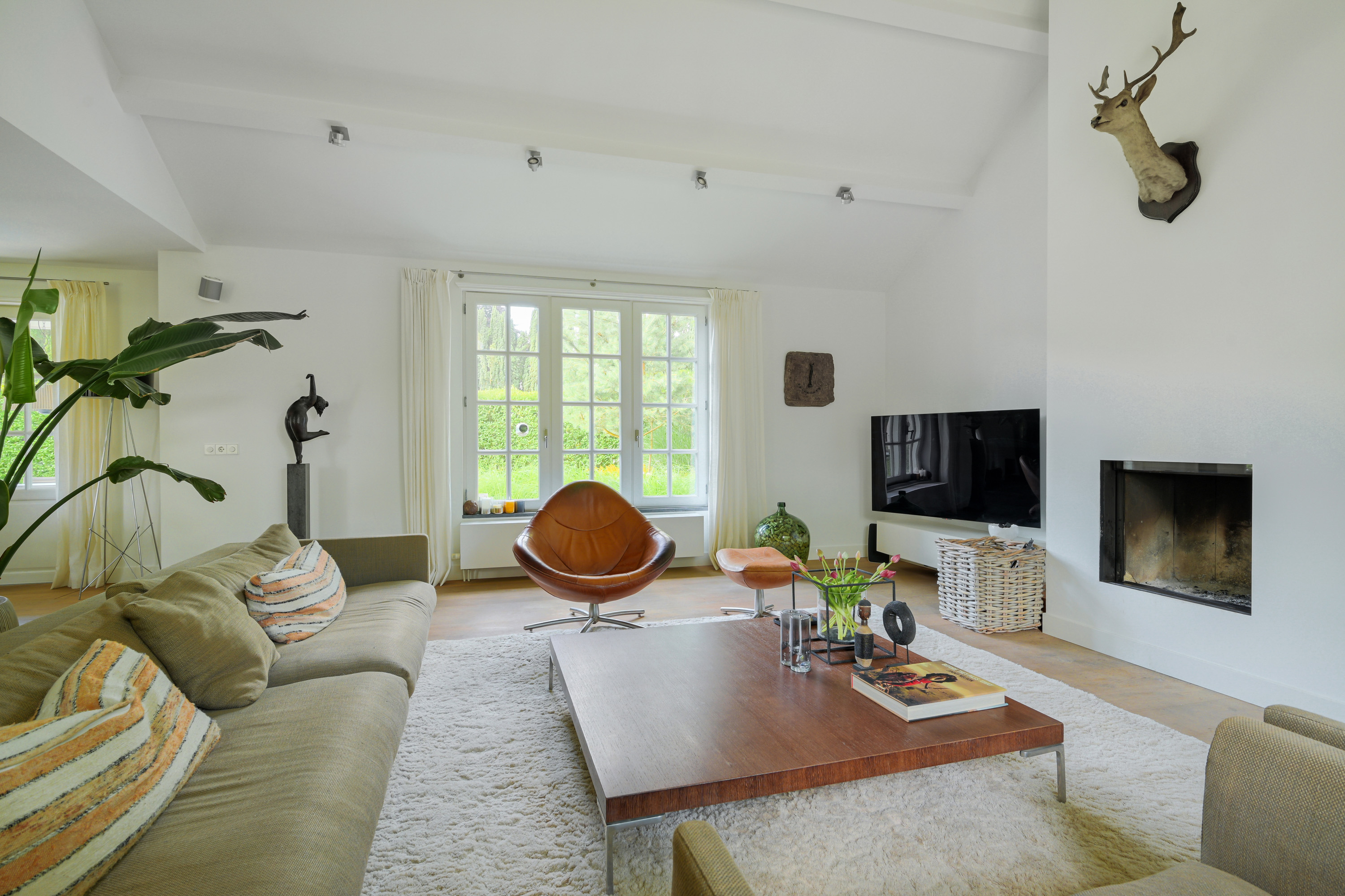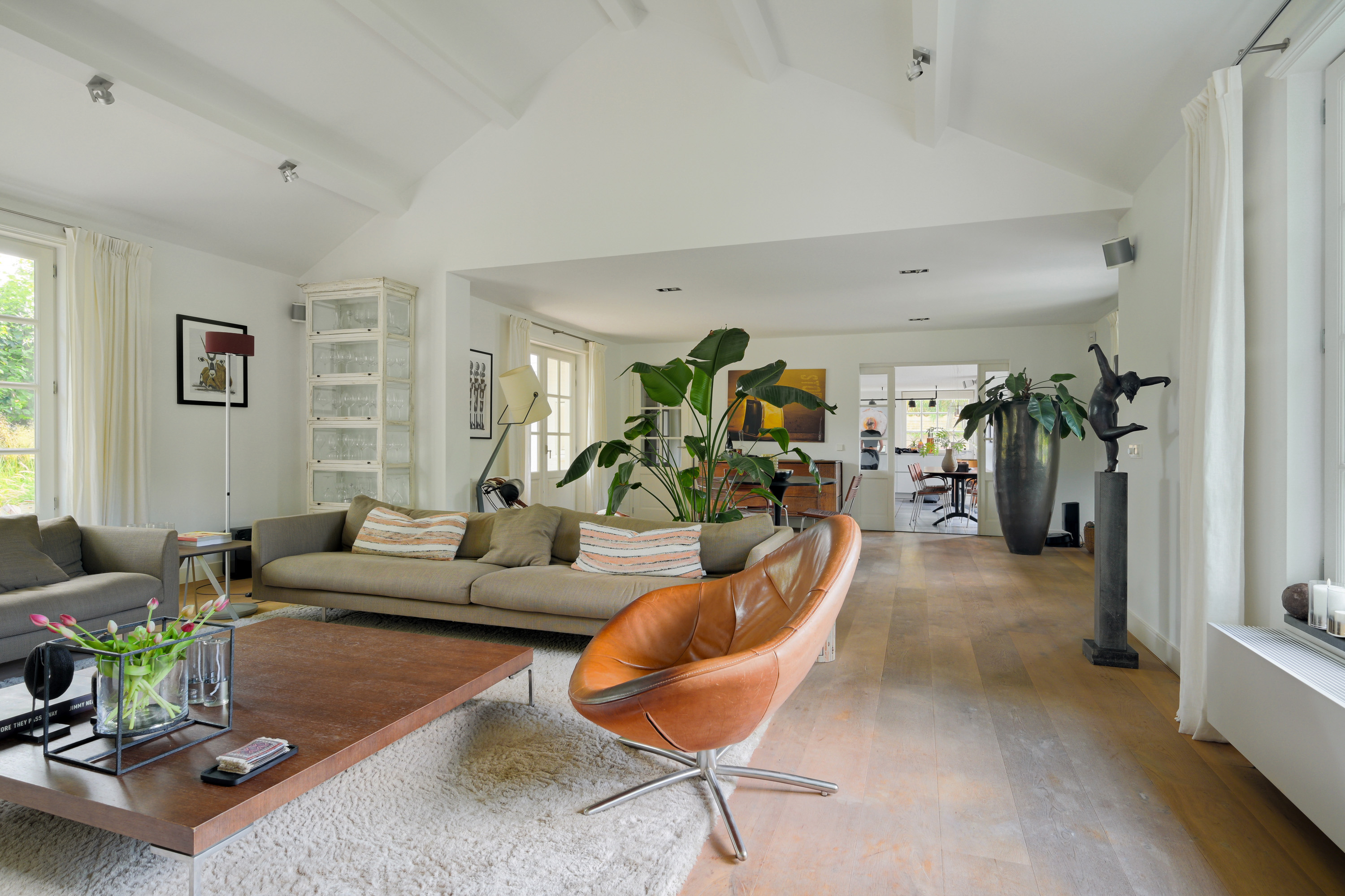 This room, fully fitted with wide wooden floorboards, features a modern mantelpiece with a wood-burning insert. The lofty, open ceiling enhances the airy atmosphere. Large windows offer stunning views of both gardens.