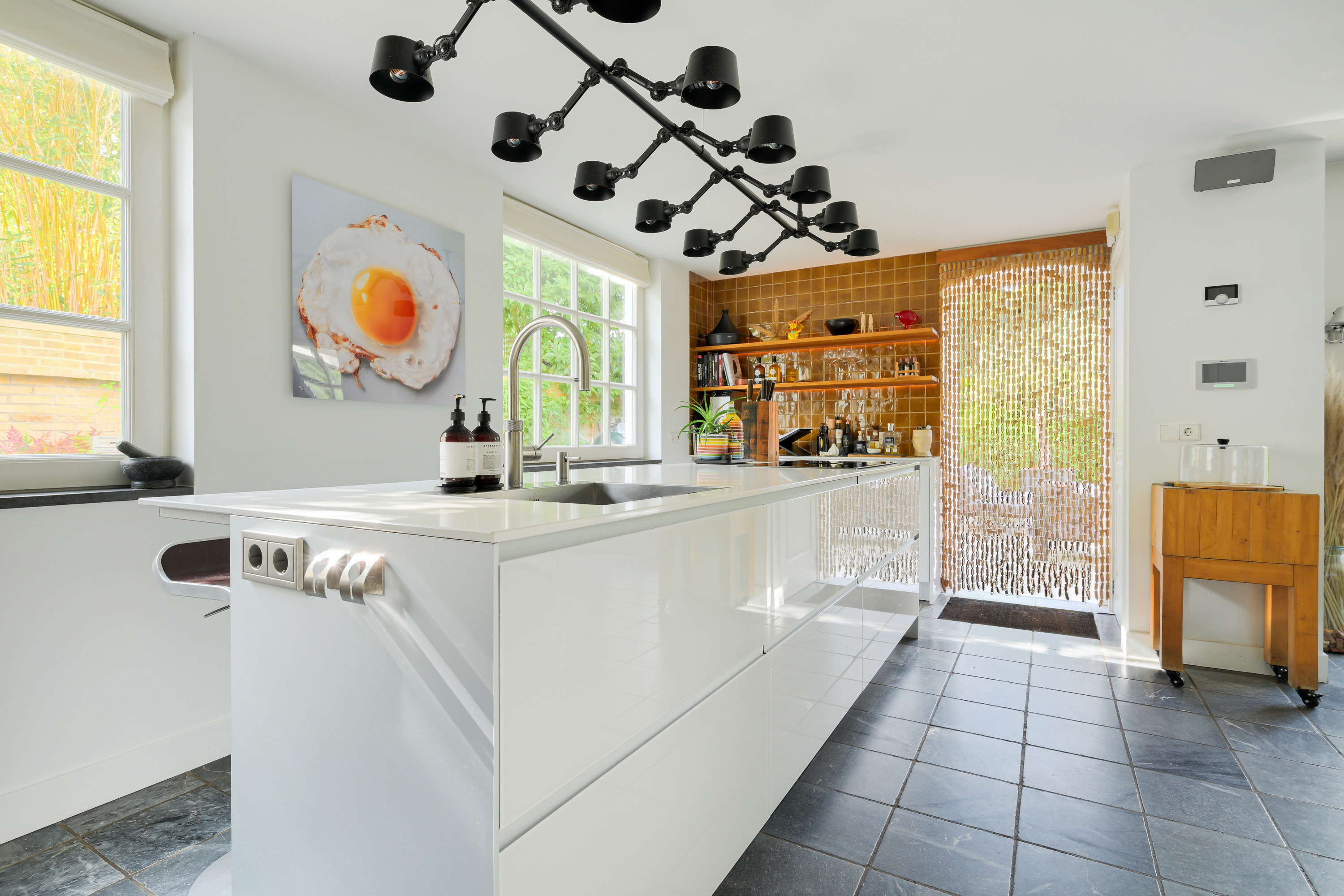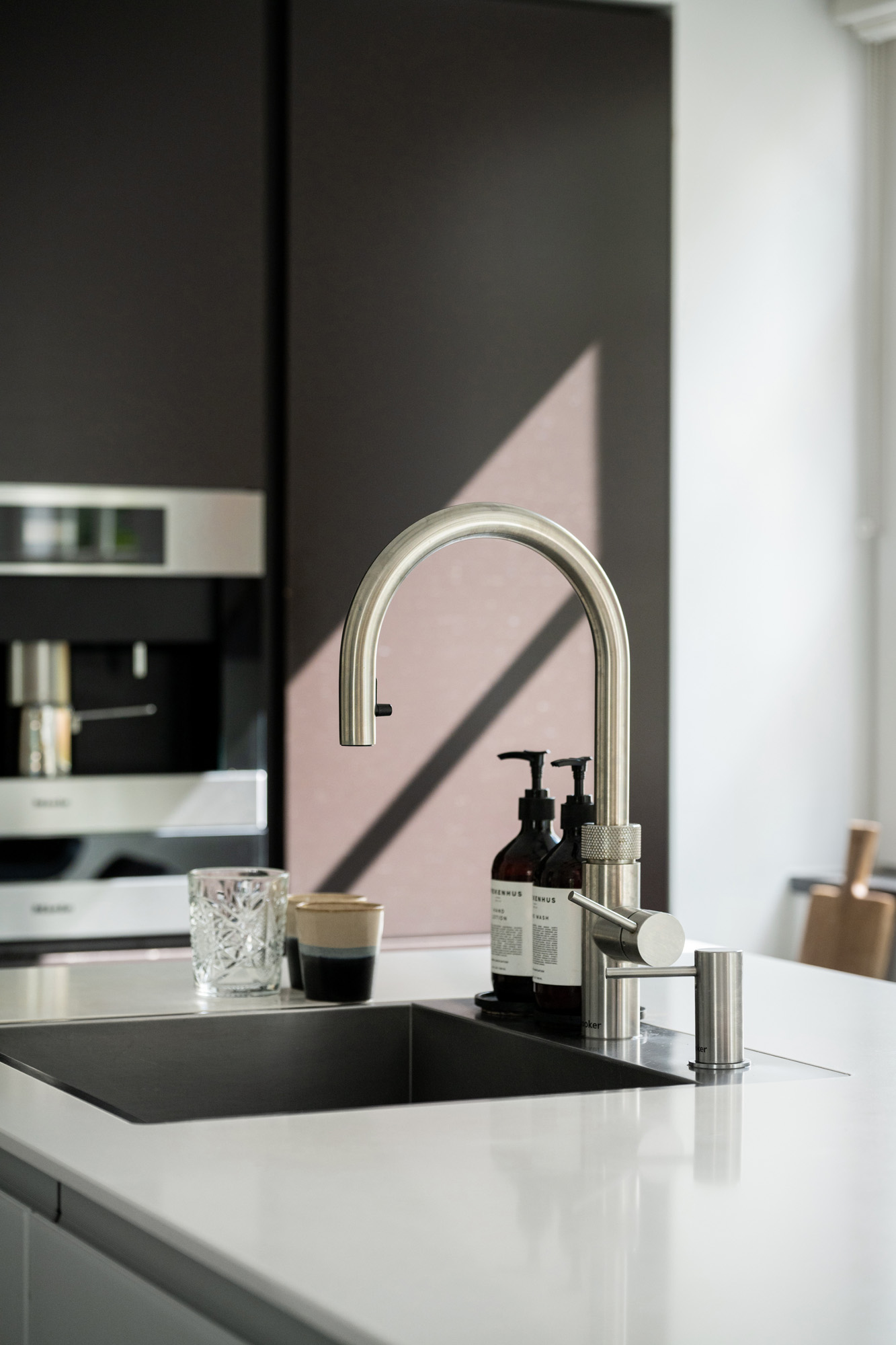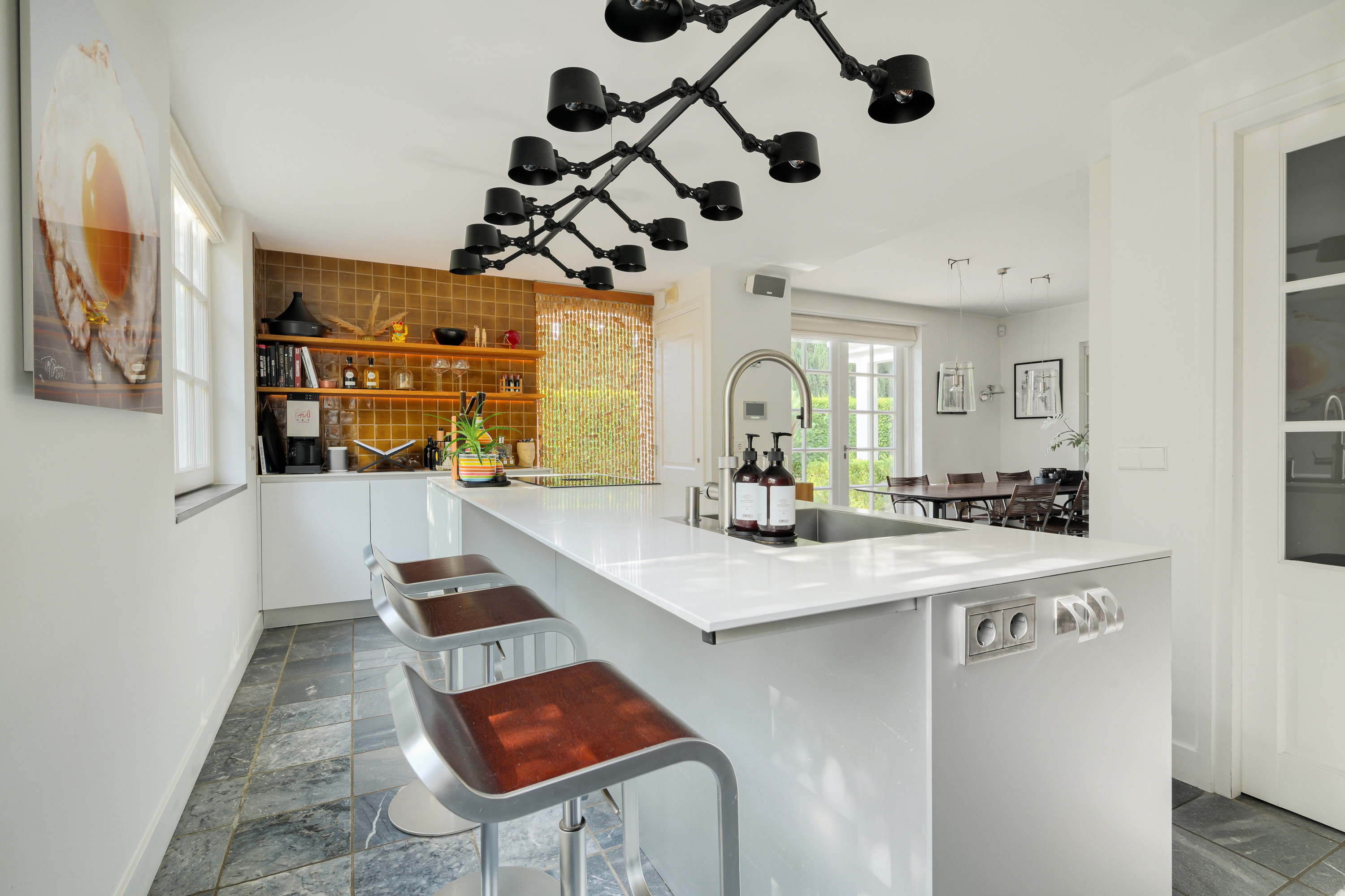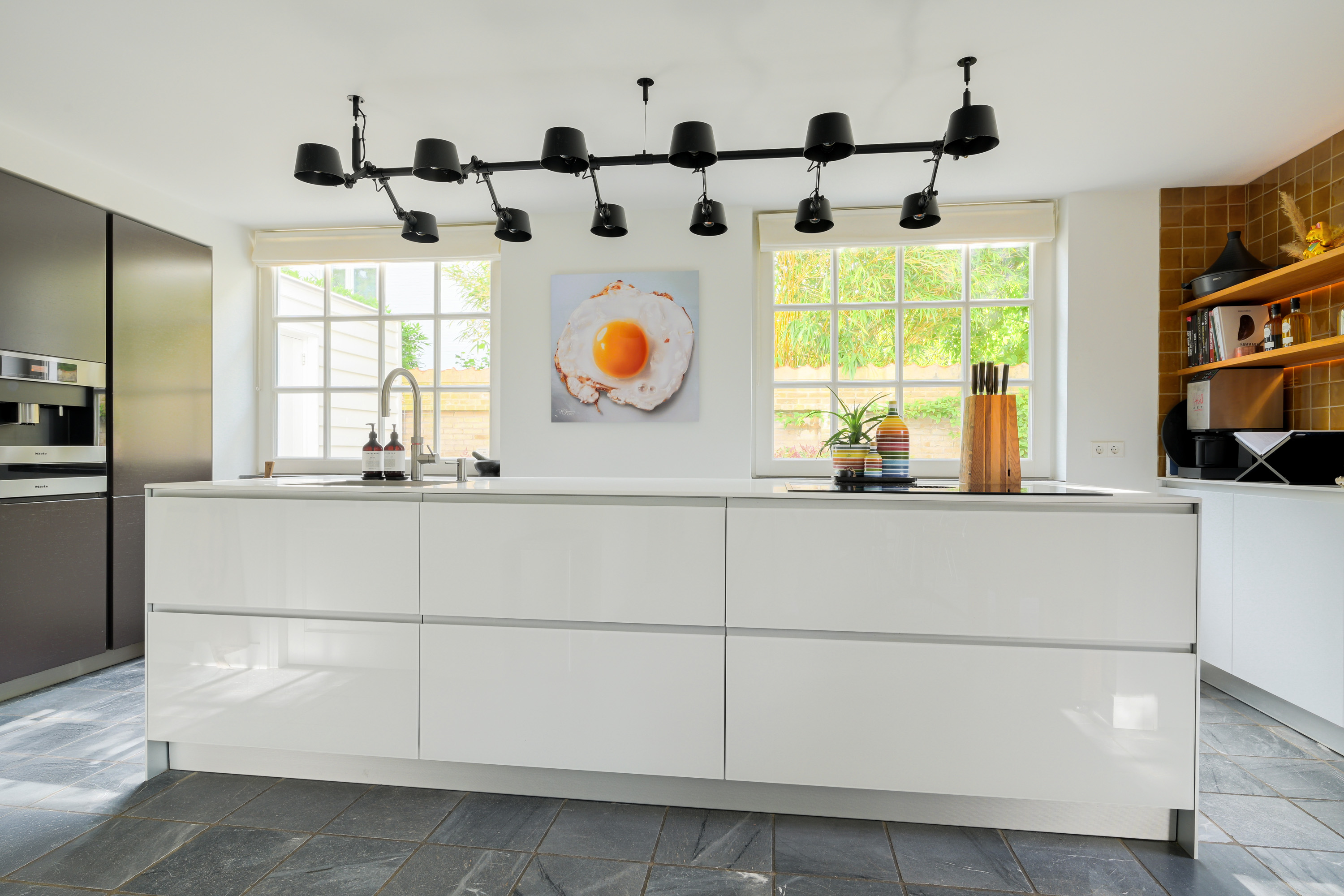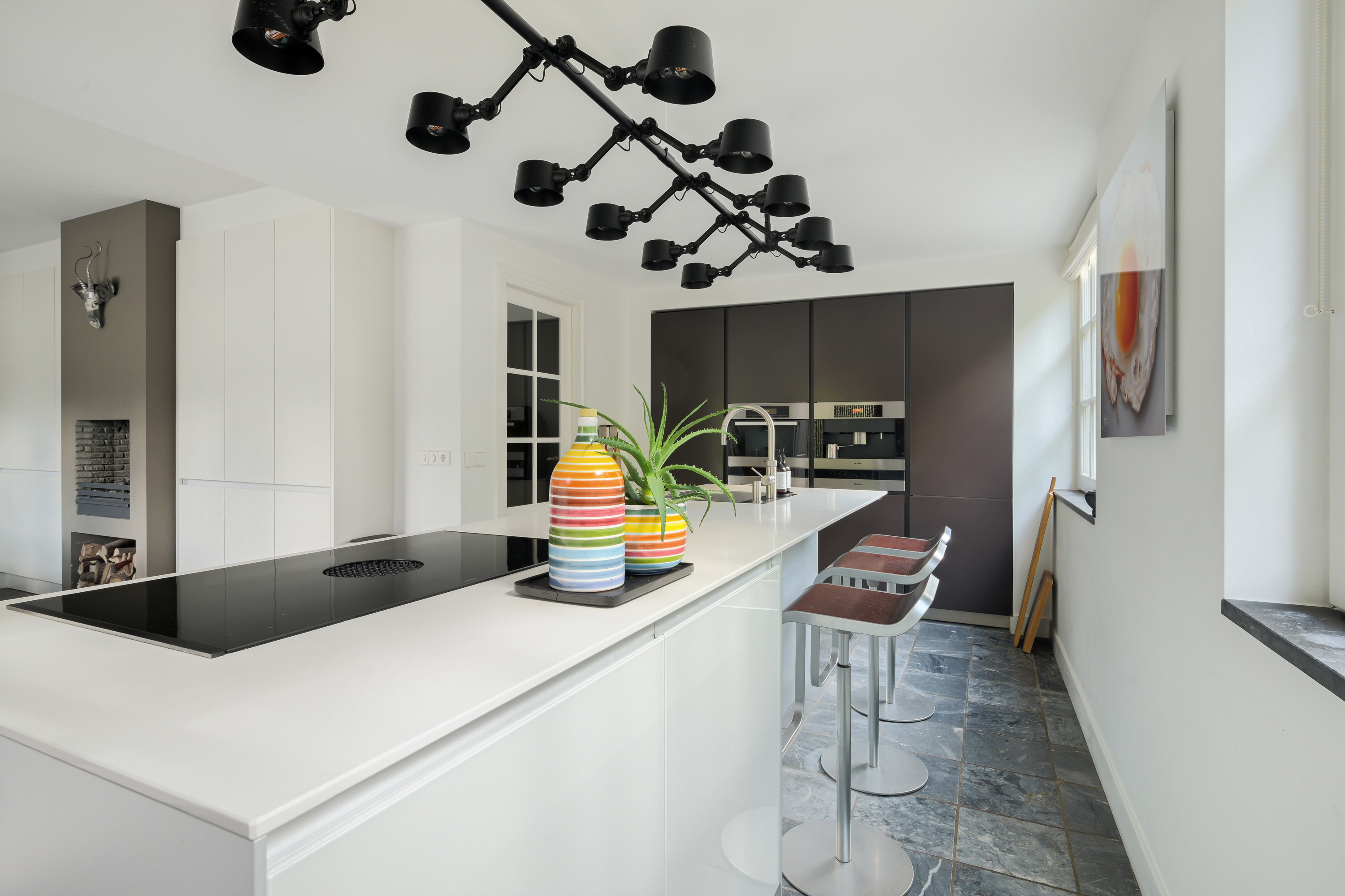 Luxury Valcucine kitchen featuring a central island with composite countertop, stainless steel sink, Quooker combi-tap, BORA induction cooktop with integrated extractor, breakfast bar, and ample cabinet space.